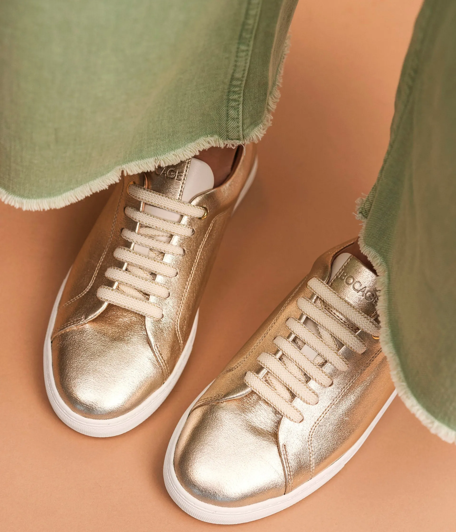 Une basket platine en cuir métallisé fabriquée avec soin dans notre propre atelier en France, au cœur du Maine et Loire (49). Une sneaker pétillante agrémentée de patchs en cuir lisse écru sur la languette et au talon, fermée par des lacets plats incrustés de fil doré. Une chaussure entièrement doublée cuir avec semelle intérieure cuir amovible dotée d’une fine mousse recyclée. Elle est posée sur une semelle en caoutchouc blanc. Cette paire bénéficie du montage Strobel qui consiste à coudre directement la tige à la première de montage lors de la piqûre. Cette technique apporte une réelle robustesse et de la souplesse. La tige et la semelle sont renforcées grâce au cousu latéral. Ce cousu est un gage de qualité quant à sa fabrication et à sa durabilité. Languette et col moussés pour plus de confort.