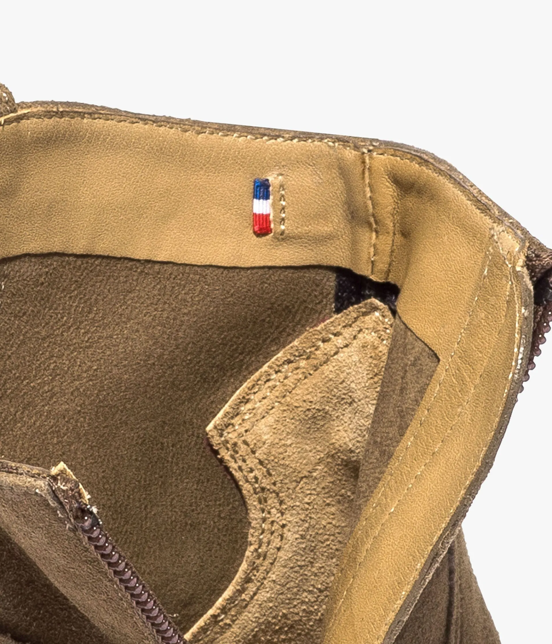 Un boots en cuir velours couleur tabac fabriqué avec soin dans notre propre atelier en France, au cœur du Maine et Loire (49). Un boots esprit « camarguaise » à la tige souple non doublée, reconnaissable à ses détails iconiques : découpes arrondies, doubles surpiqûres et petite patte sur le côté de la tige. Un boots d’inspiration folk avec talon lamellé collé à l’allure très féminine. Fermeture zippée côté intérieur du pied. Boots doublé cuir sur la partie pied. Tige souple.