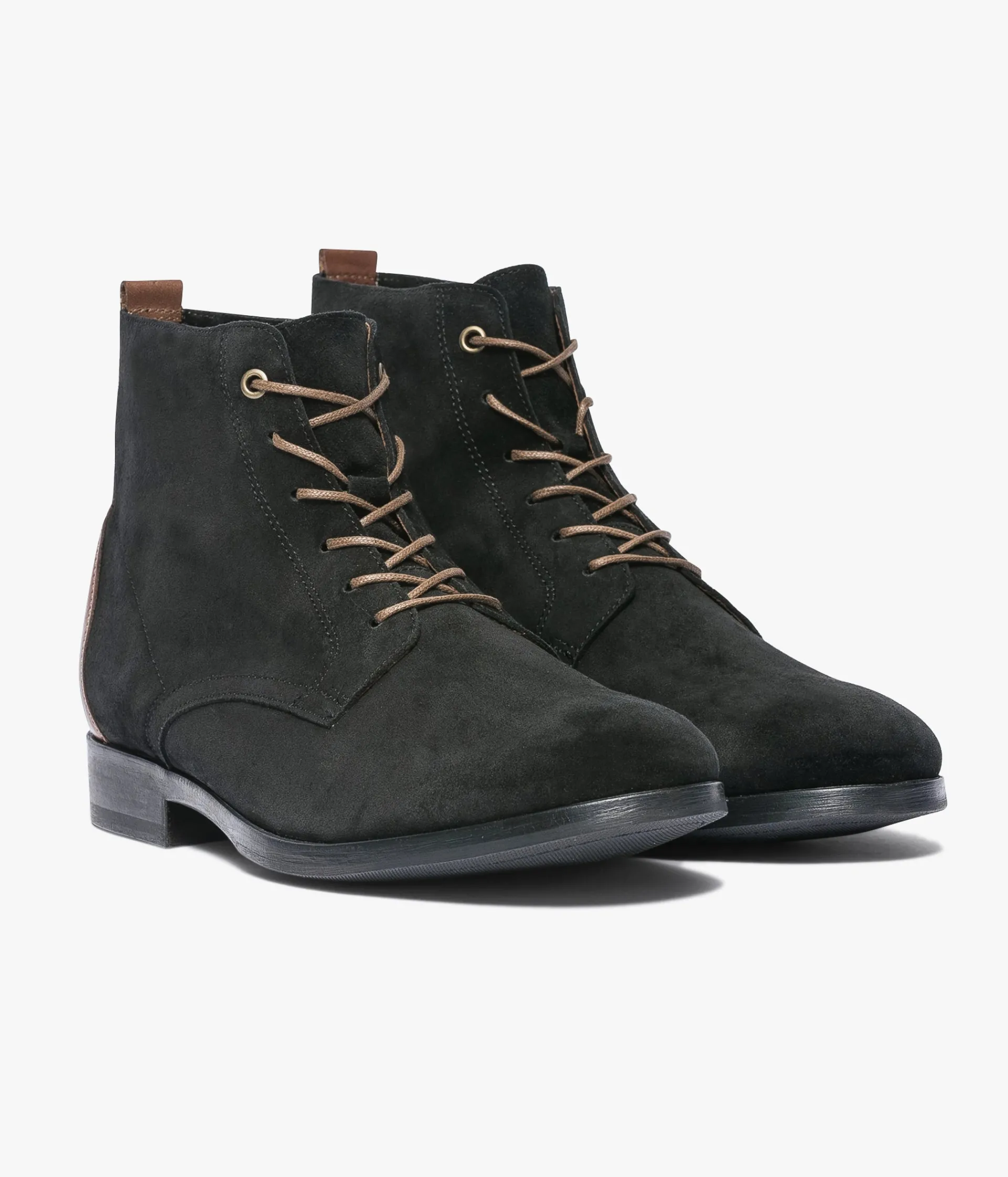 Boot noir en cuir velours avec lacets marron. Ce boots en cuir velours noir fait partie des indispensables du vestiaire citadin. Un boots à bout amande agrémenté d’un empiècement en cuir lisse cognac au talon et rehaussé d’un lacet marron. Cette bottine possède une tige non doublée pour s’adapter parfaitement à la cheville et offrir un maximum de confort. Elle est posée sur une semelle en cuir protégée par un patin avec talon de 2 cm. A noter la petite entaille dans le talon qui empêche l’ourlet du pantalon de s’accrocher à la chaussure. Chaussure fabriquée en France. Talon 2 cm. Tige 13 cm. Ces boots apportent une touche casual chic à tous les looks.