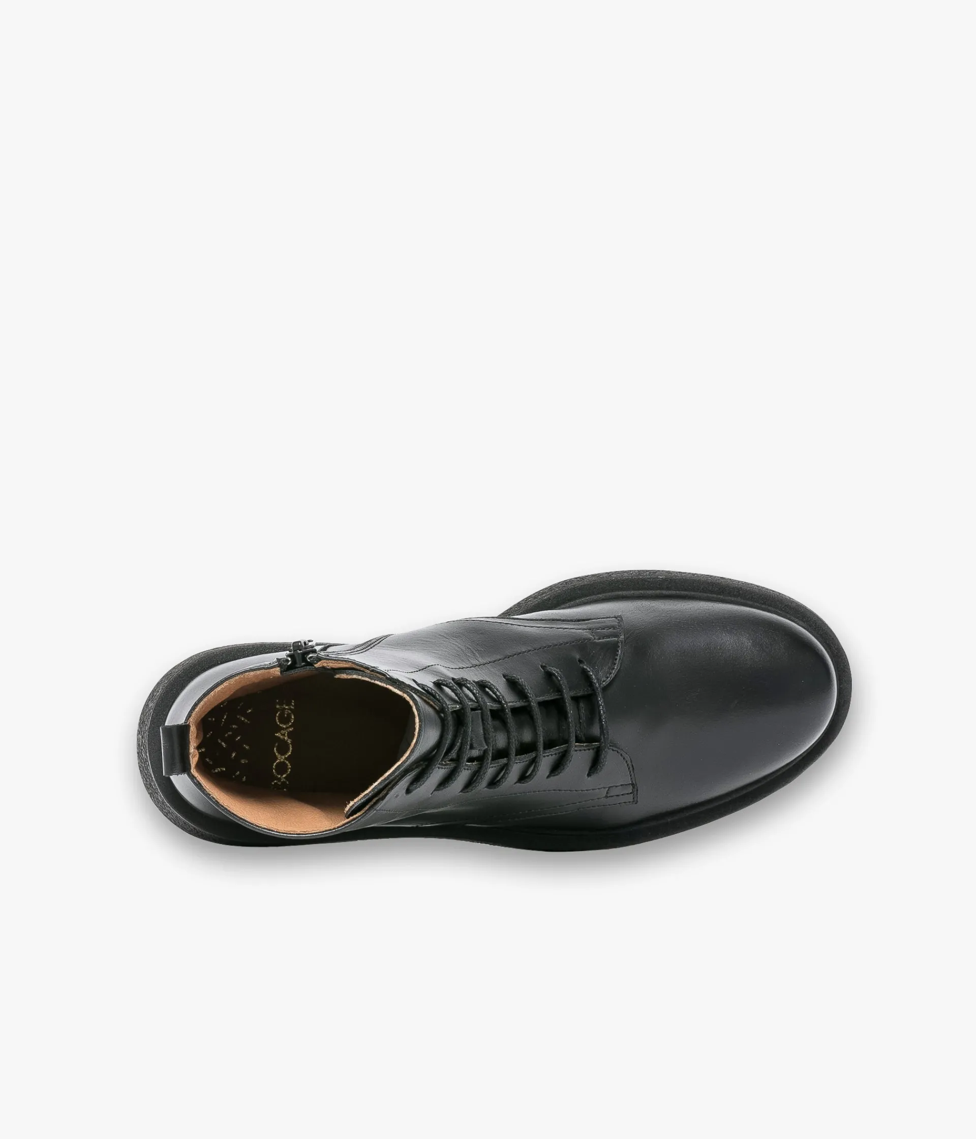 Un boots en cuir lisse noir fabriqué avec soin dans notre propre atelier au Portugal. Cette bottine citadine arbore un look totalement dans l’air du temps avec son épaisse semelle en caoutchouc. Un boots entièrement doublé cuir avec semelle intérieure cuir dotée d’une fine mousse. Il s’ajuste grâce à des lacets et se ferme facilement par zip intérieur.
