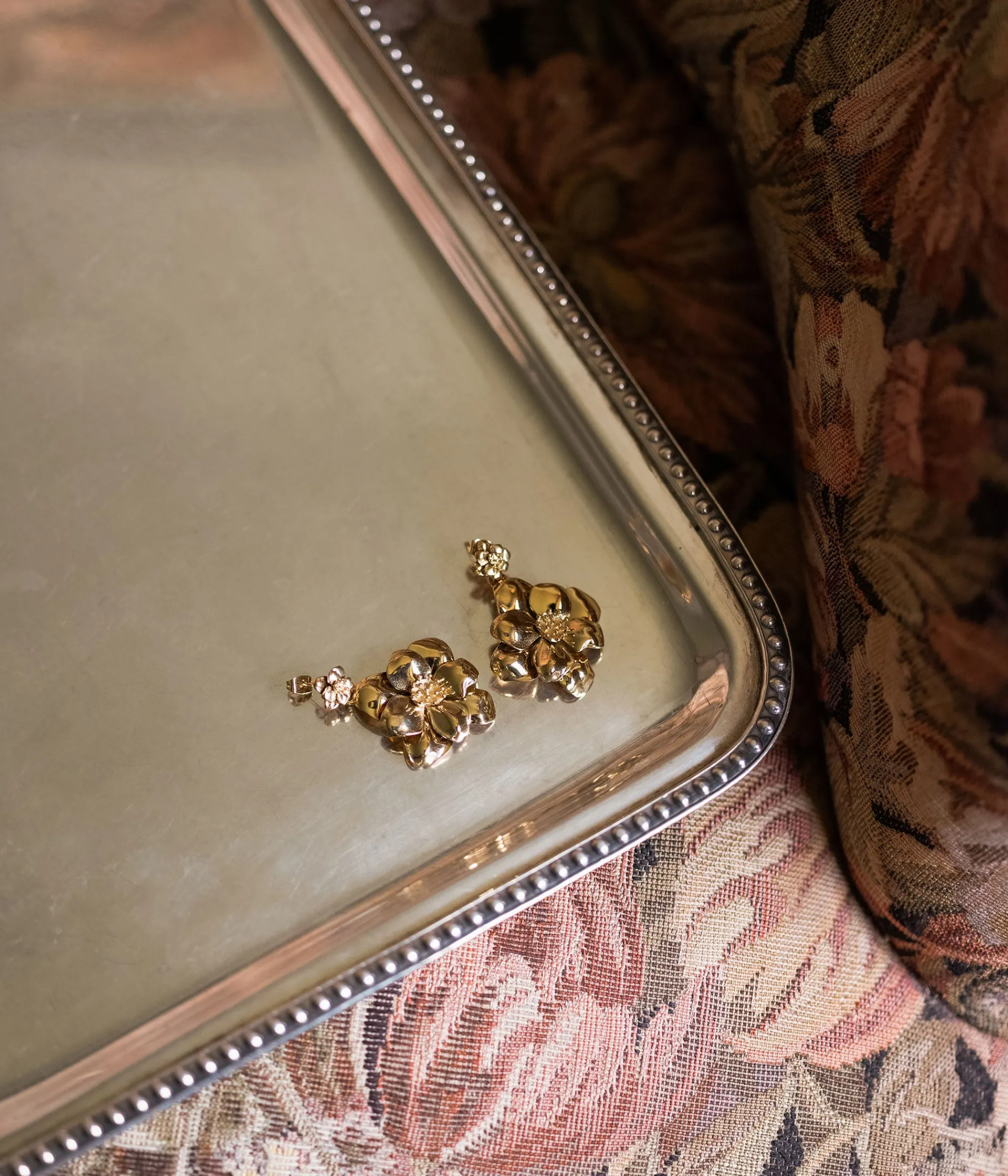 De jolies boucles d'oreilles pendantes dorées en forme de fleurs. Elles se composent d'une petite fleur fixe et d'une seconde pendante plus grande. Des boucles d'oreilles en acier inoxydable, un alliage hypoallergénique qui ne change pas de couleur, ne ternit pas et s’entretient facilement. Bijou pour oreilles percées. Fermoir papillon.