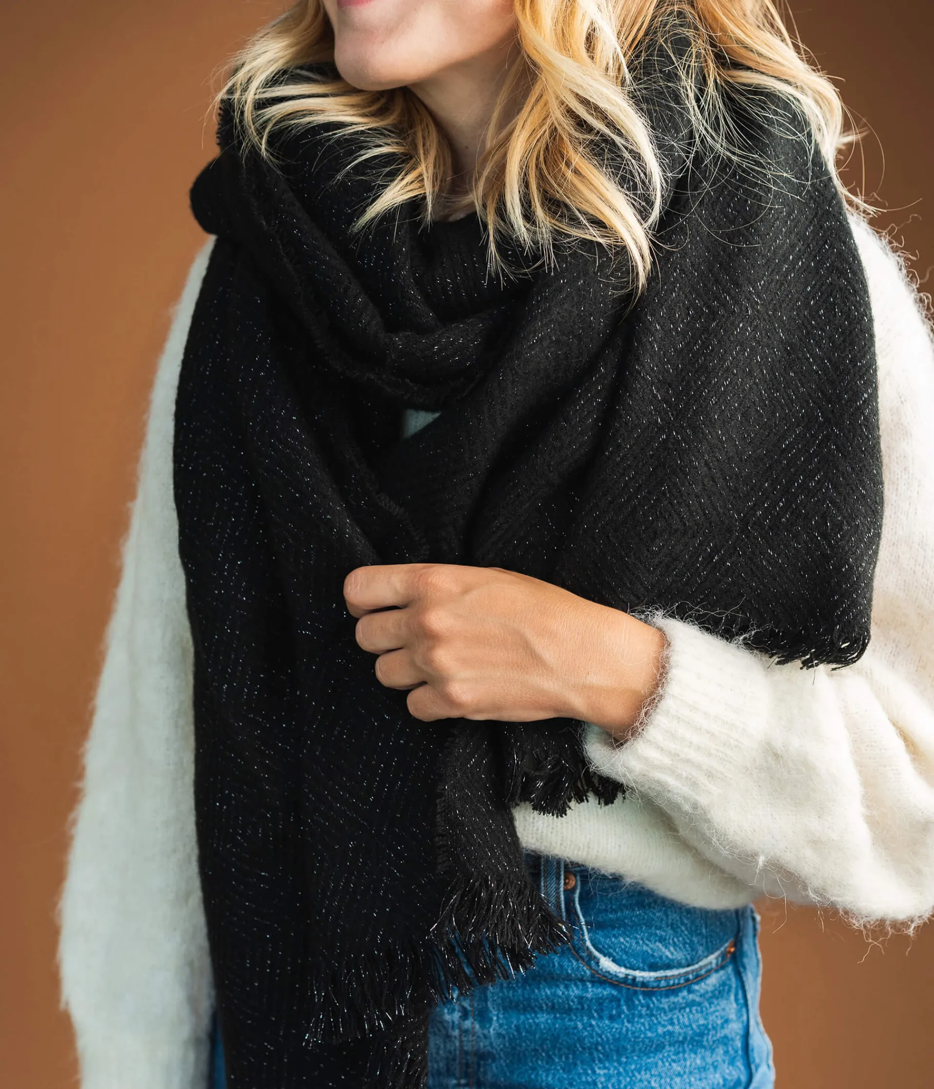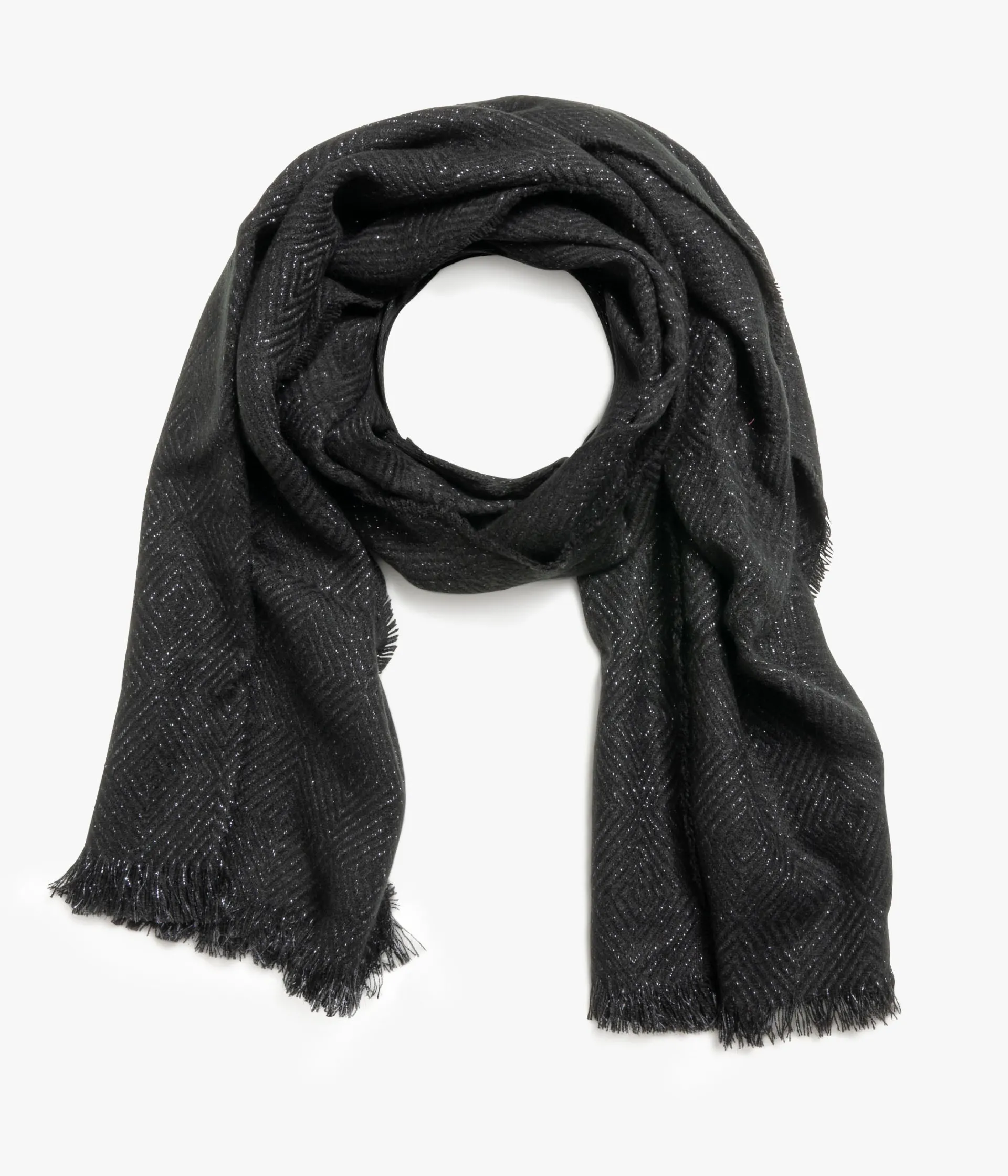 Echarpe noire avec fil lurex argenté. Cette jolie écharpe noire réchauffera tous les looks en leur apportant une touche de brillance grâce à ses fils lurex argentés. Une écharpe douce et agréable à porter avec finitions franges sur les côtés et aux extrémités. Dimensions : 80*208 cm. Cette écharpe scintillante illuminera les tenues de ville comme les tenues de soirée.