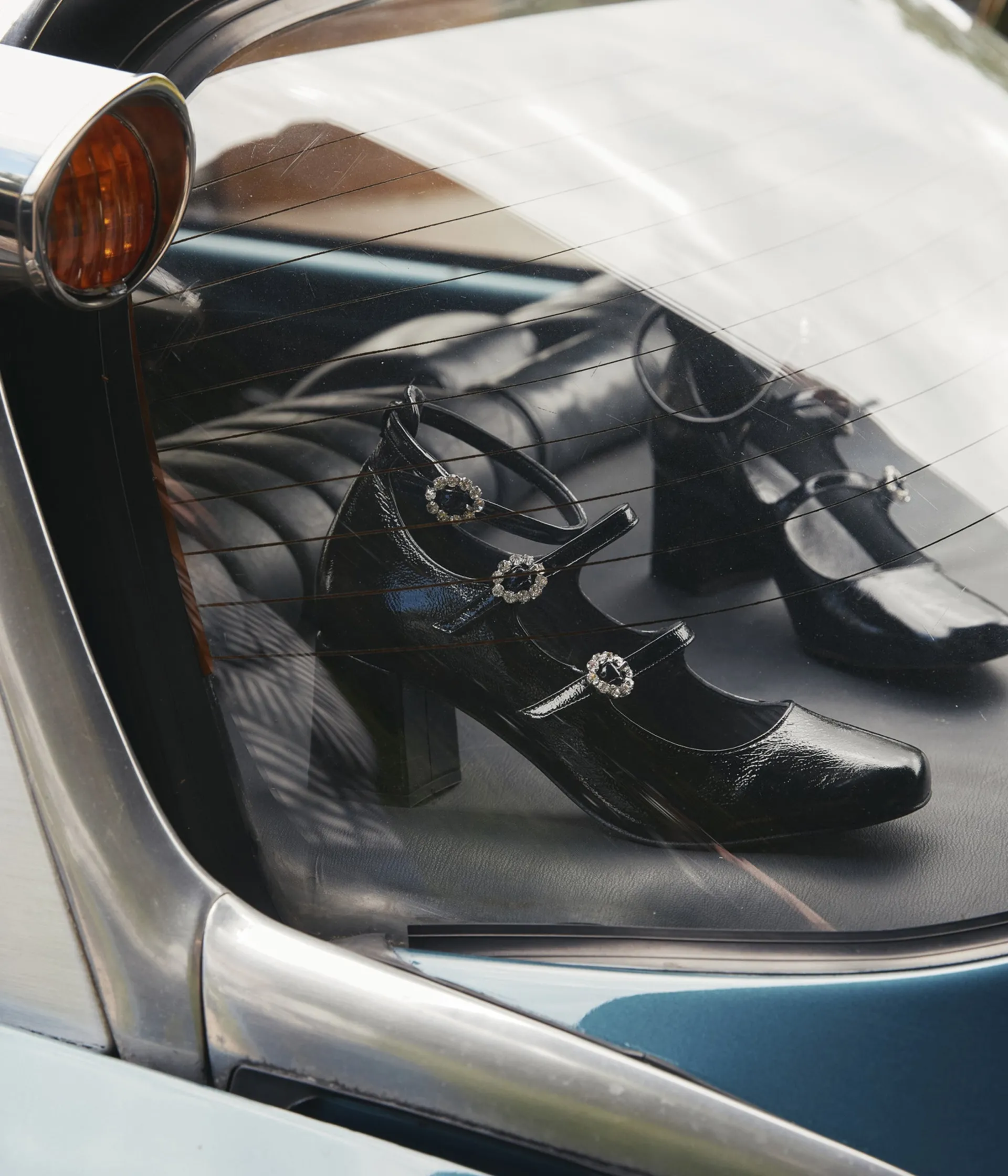 Un escarpin babies en cuir verni noir fabriqué avec soin au Portugal. Un escarpin à l'allure glamour affirmée arborant de fines brides sur le dessus du pied et autour de la cheville, fermées par des boucles en strass. Cet escarpin à bout carré et petit talon enrobé ajoutera une touche rétro chic à toutes les tenues. Une chaussure de cérémonie entièrement doublée cuir avec semelle intérieure cuir dotée d'une fine mousse. Ce cuir Naplak particulièrement souple peut présenter un aspect légèrement froissé.