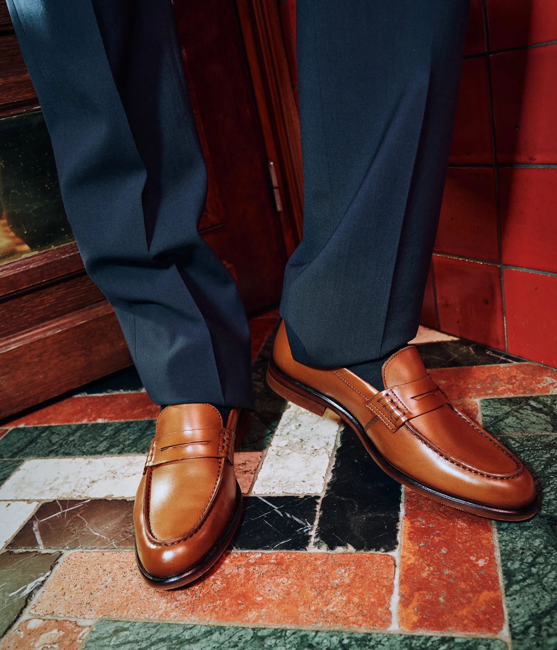 Un mocassin en cuir lisse cognac fabriqué avec soin au Portugal. Une chaussure à la ligne effilée avec bout amande est réalisée dans un joli cuir patiné à la main. Elle affiche une couture en relief sur le dessus et un bandeau perforé agrémenté de piqûres sellier. Une chaussure entièrement doublée cuir avec semelle intérieure cuir dotée d’une fine mousse. Cette paire bénéficie du cousu Blake, une couture unique prenant, à la fois, la semelle intérieure, la semelle extérieure et la tige de la chaussure. Ce montage est apprécié pour la finesse de la semelle. Semelle avec patin antidérapant.