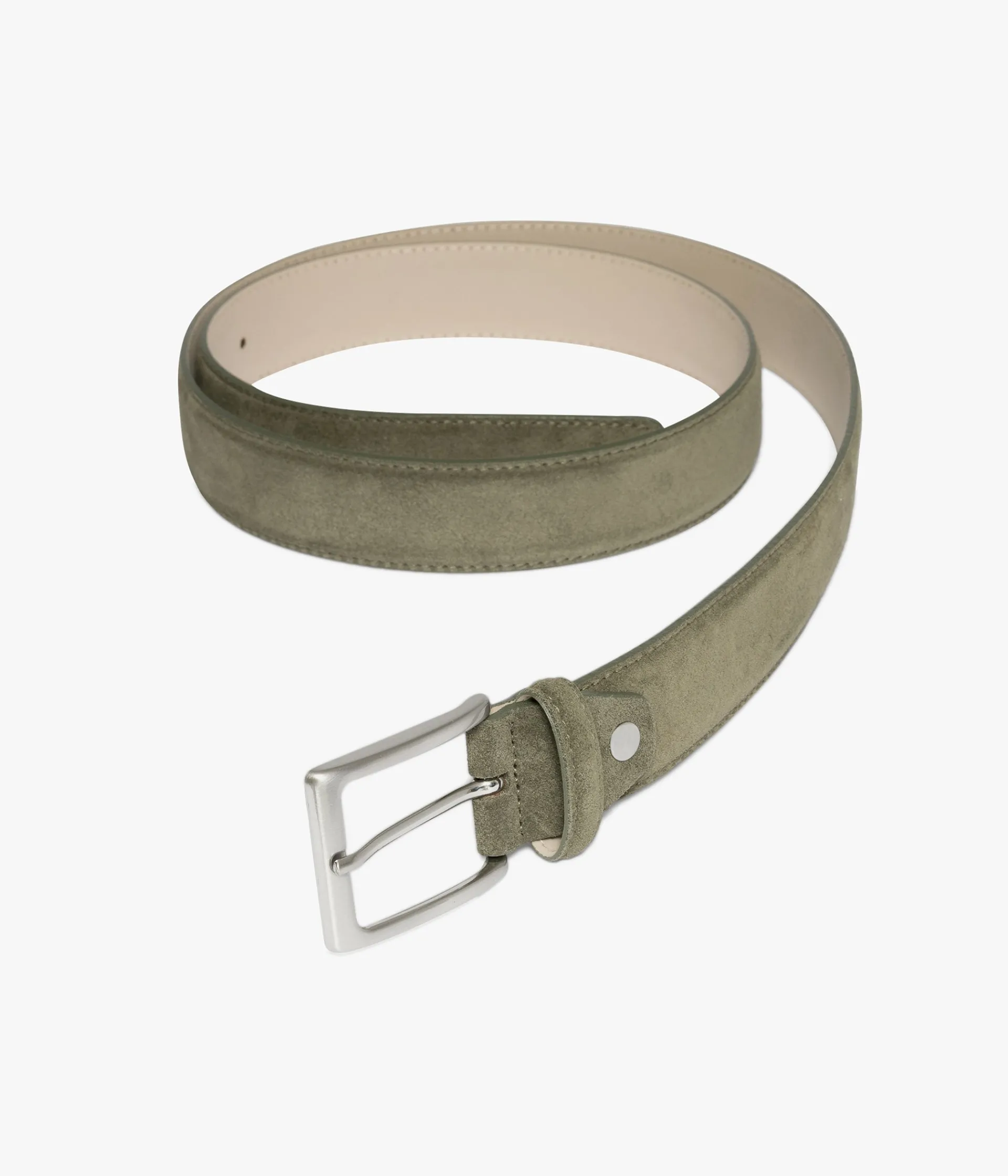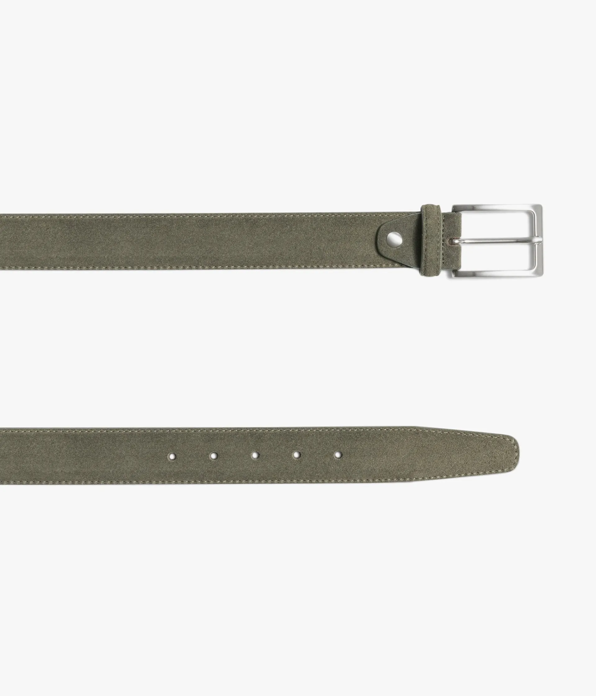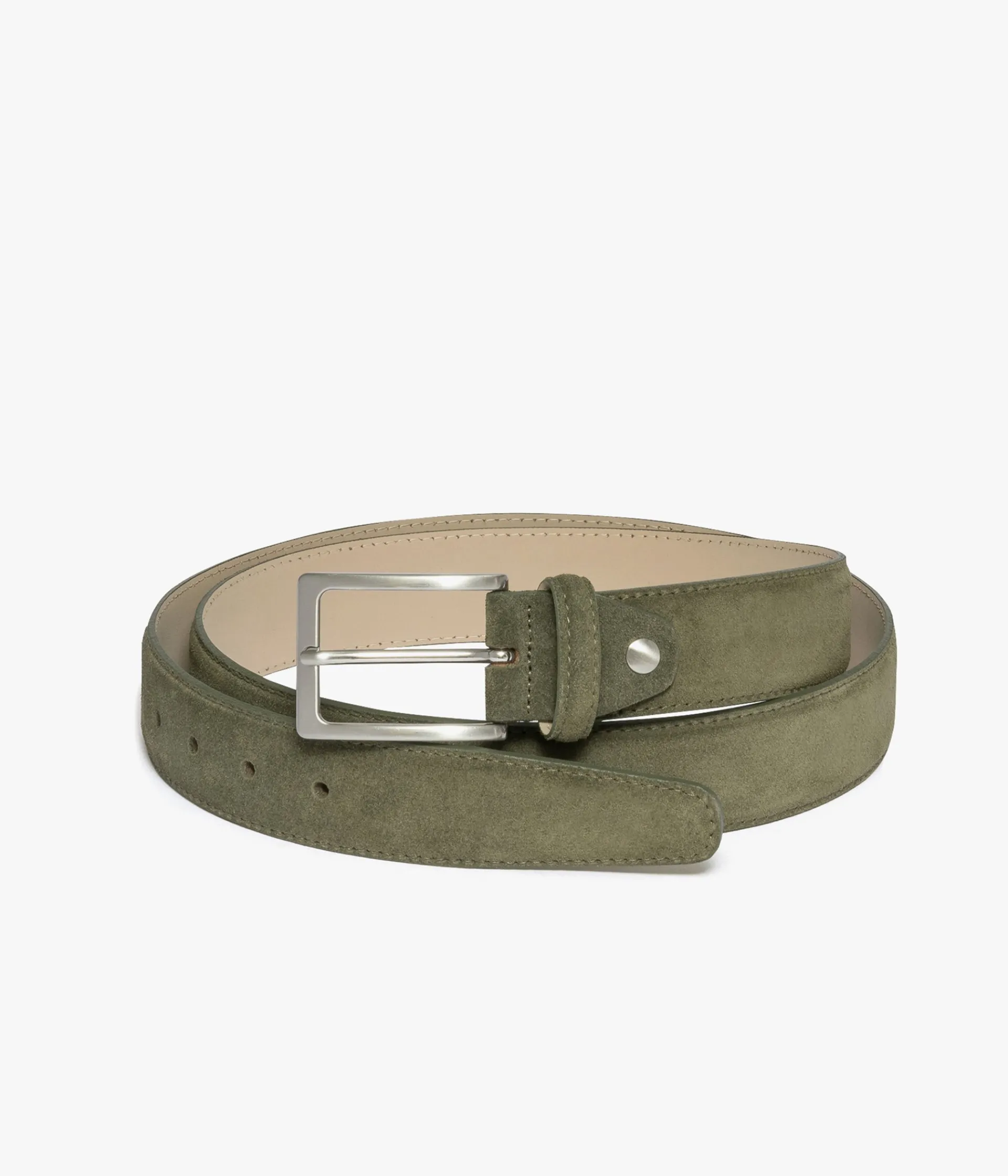 Une ceinture vert olive avec son dessus en cuir velours. Elle se ferme par une boucle à ardillon rectangle en métal brossé et possède un passant en cuir. Largeur 3.5 cm. Si la longueur ne vous convient pas, vous pouvez la réajuster vous même. Pour cela, munissez-vous d'un tournevis adapté et retirez la vis à l'arrière de la boucle. Coupez avec un cutteur la longueur que vous souhaitez retirer. Prenez l'ancienne pièce comme gabarit pour marquer la position de la vis. Faites une marque puis trouez avec une pince poinçon. Enfin, vous pouvez remettre la boucle sur la ceinture ainsi que la vis.