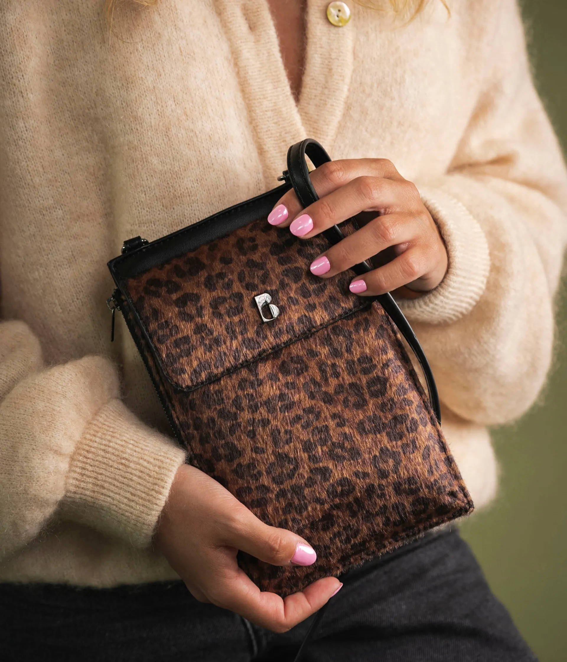 Une jolie pochette de téléphone à motif léopard conçue dans une matière façon poil de poulain. Elle est dotée d’une poche zippée sur le côté, d’une poche à rabat fermée par un bouton aimanté et d’une fente au dos dans laquelle se glisse un porte-carte. Cette pochette se porte sur l’épaule ou de travers grâce à une fine bandoulière amovible. Doublure en polyester recyclé. Logo métallique sur le rabat. Dimensions : H21*L13,5 cm.