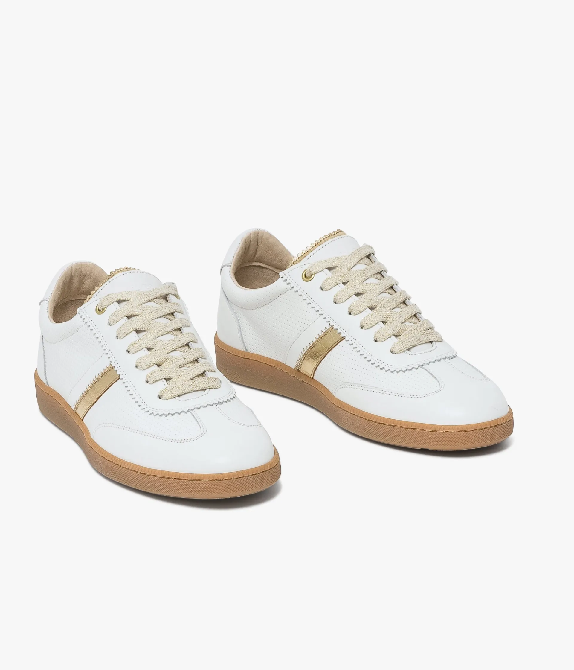 Une basket en cuir blanc fabriquée avec soin au Portugal. Une basket féminine composée d'une alliance de cuir lisse et de cuir effet perforé, illuminé par des touches de cuir métallisé doré et des lacets pailletés. Une sneaker non doublée pour un effet seconde peau et dotée d'une semelle intérieure en cuir moussée amovible. Elle repose sur une semelle en caoutchouc couleur miel. Cette paire bénéficie du montage Strobel et d’une semelle renforcée par un cousu latéral, gage de qualité, apportant souplesse, robustesse et durabilité. Col et languette moussés pour plus de confort.