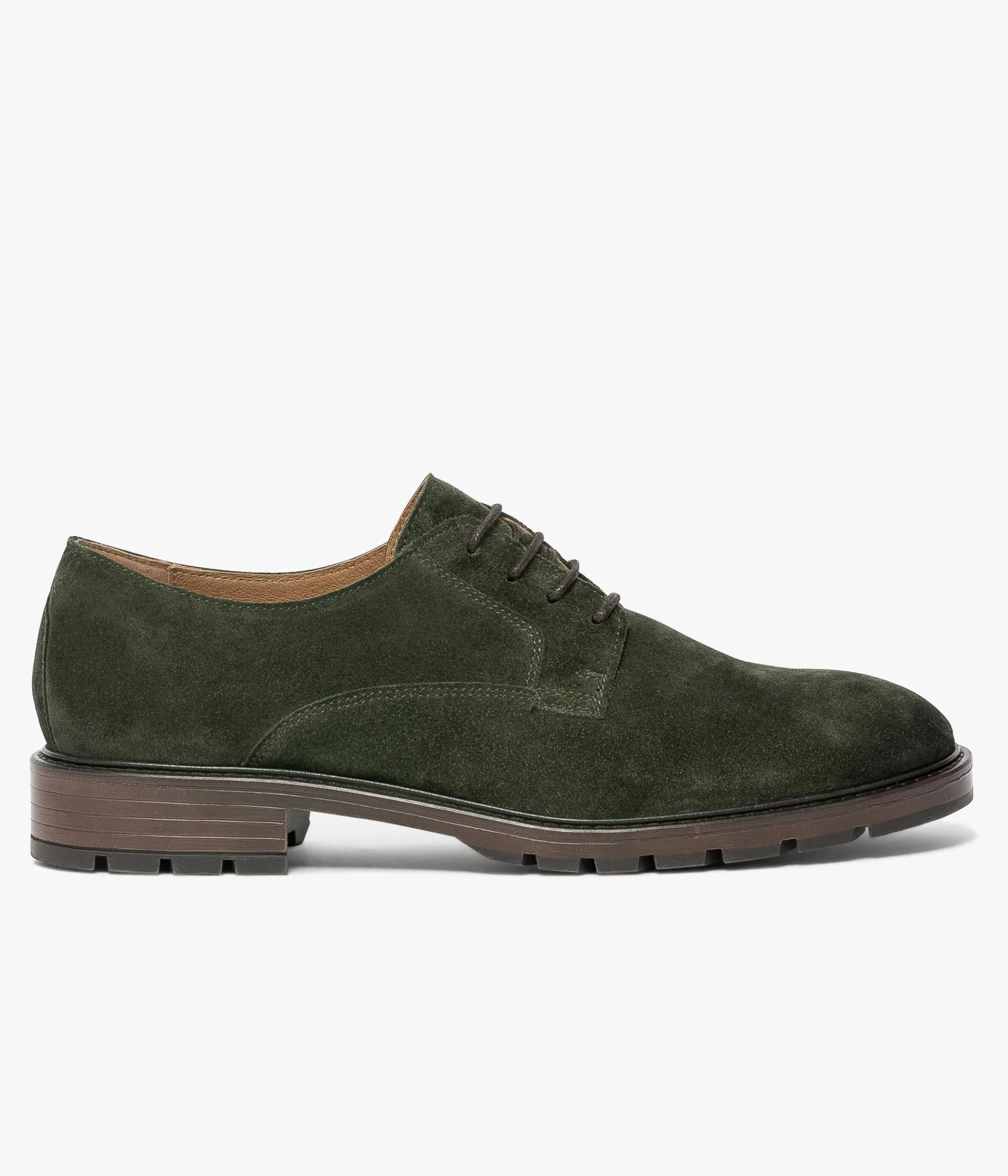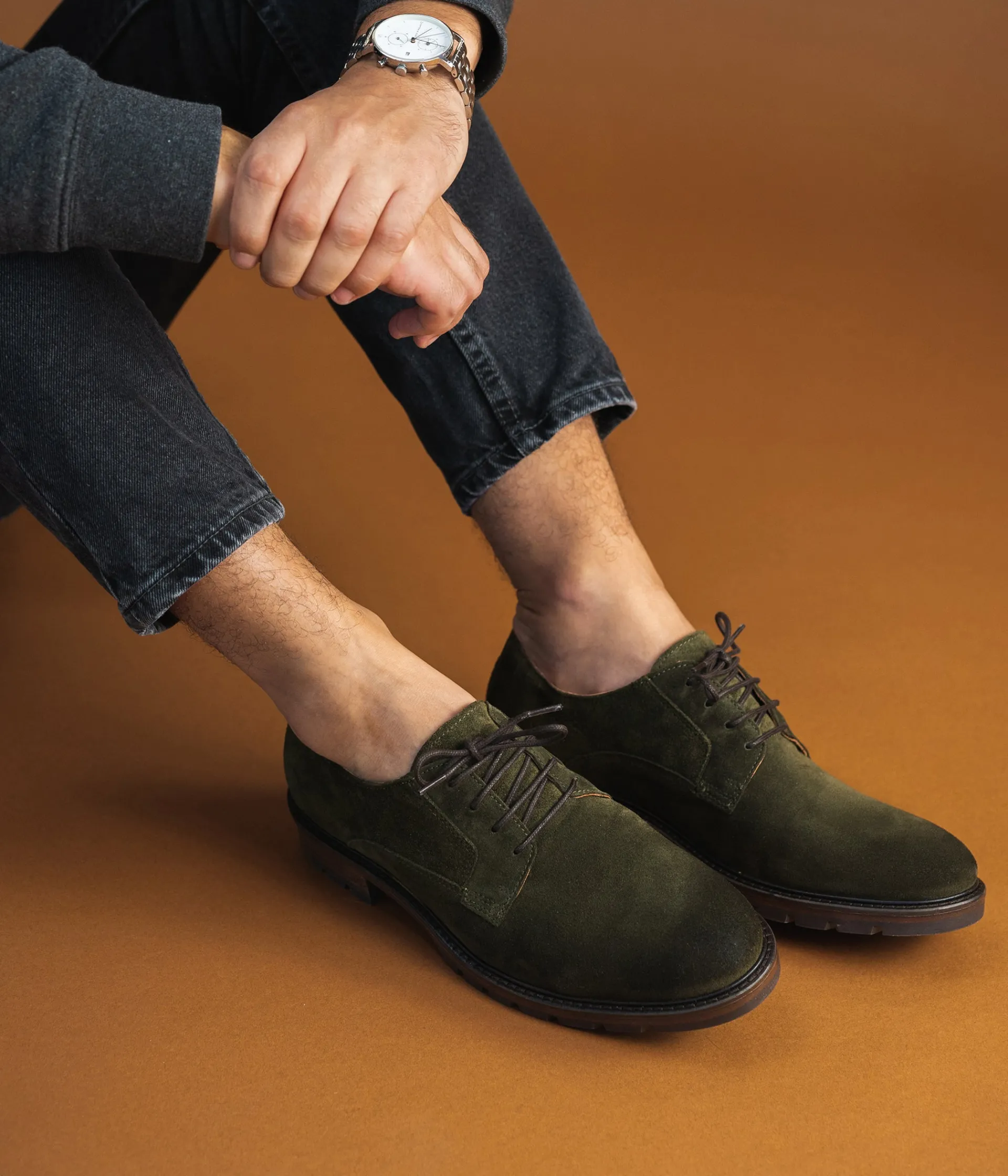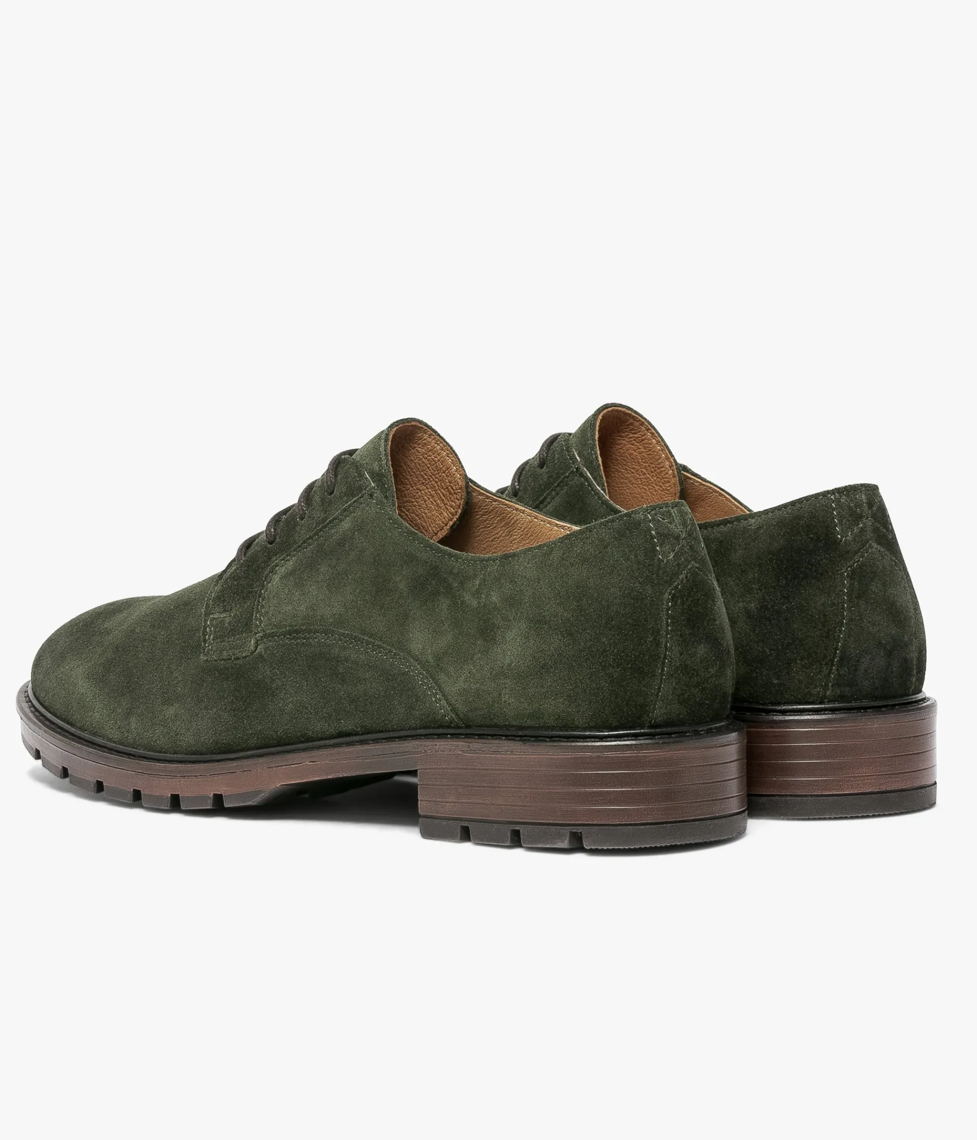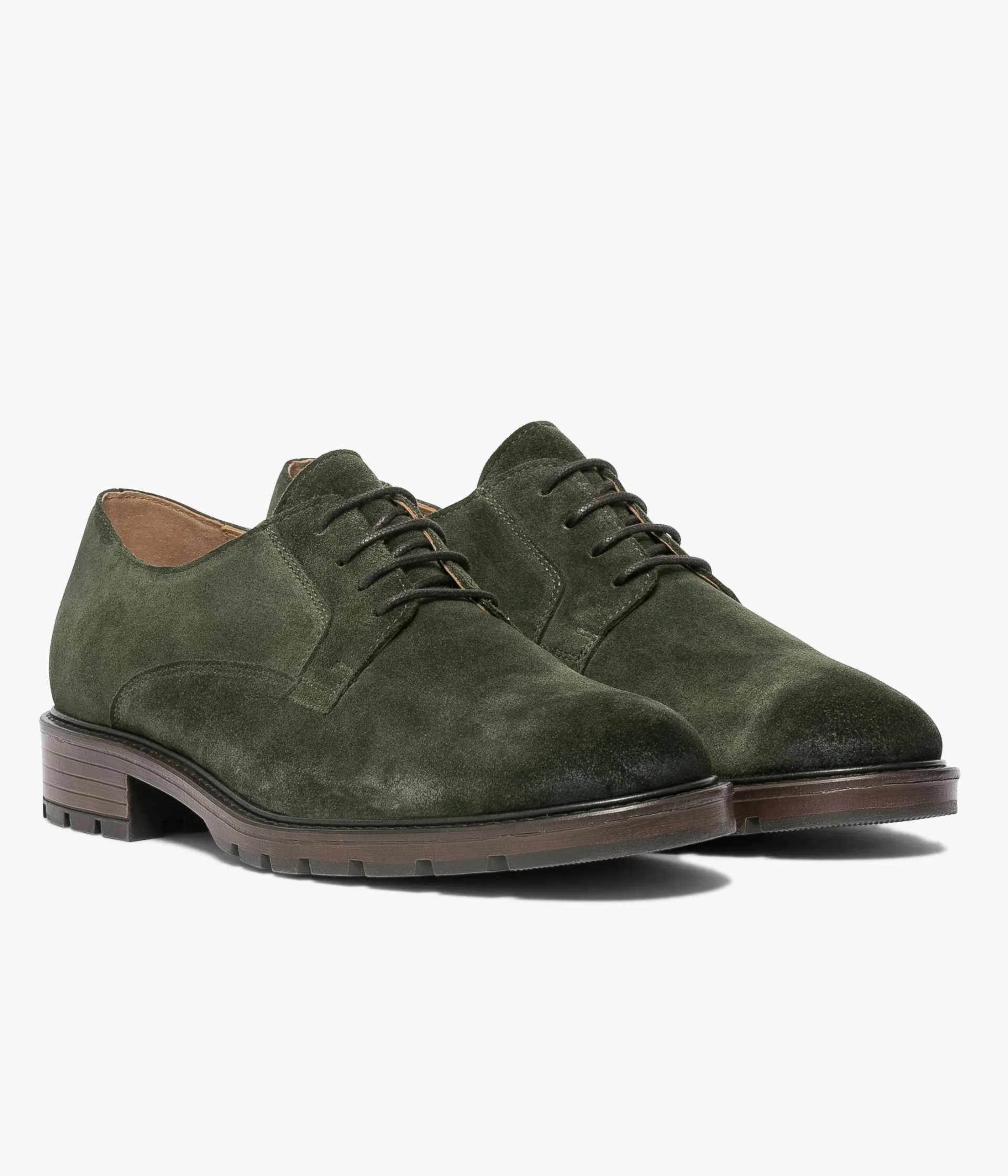 Un derby en cuir velours kaki fabriqué avec soin dans notre propre atelier au Portugal. Posé sur une semelle souple avec couche d’usure crantée, il affiche un look urbain et accompagne les tenues décontractées avec style. Un derby entièrement doublé cuir avec semelle intérieure cuir dotée d’une fine mousse. Il se ferme grâce à de lacets ronds marron, assortis à la semelle.