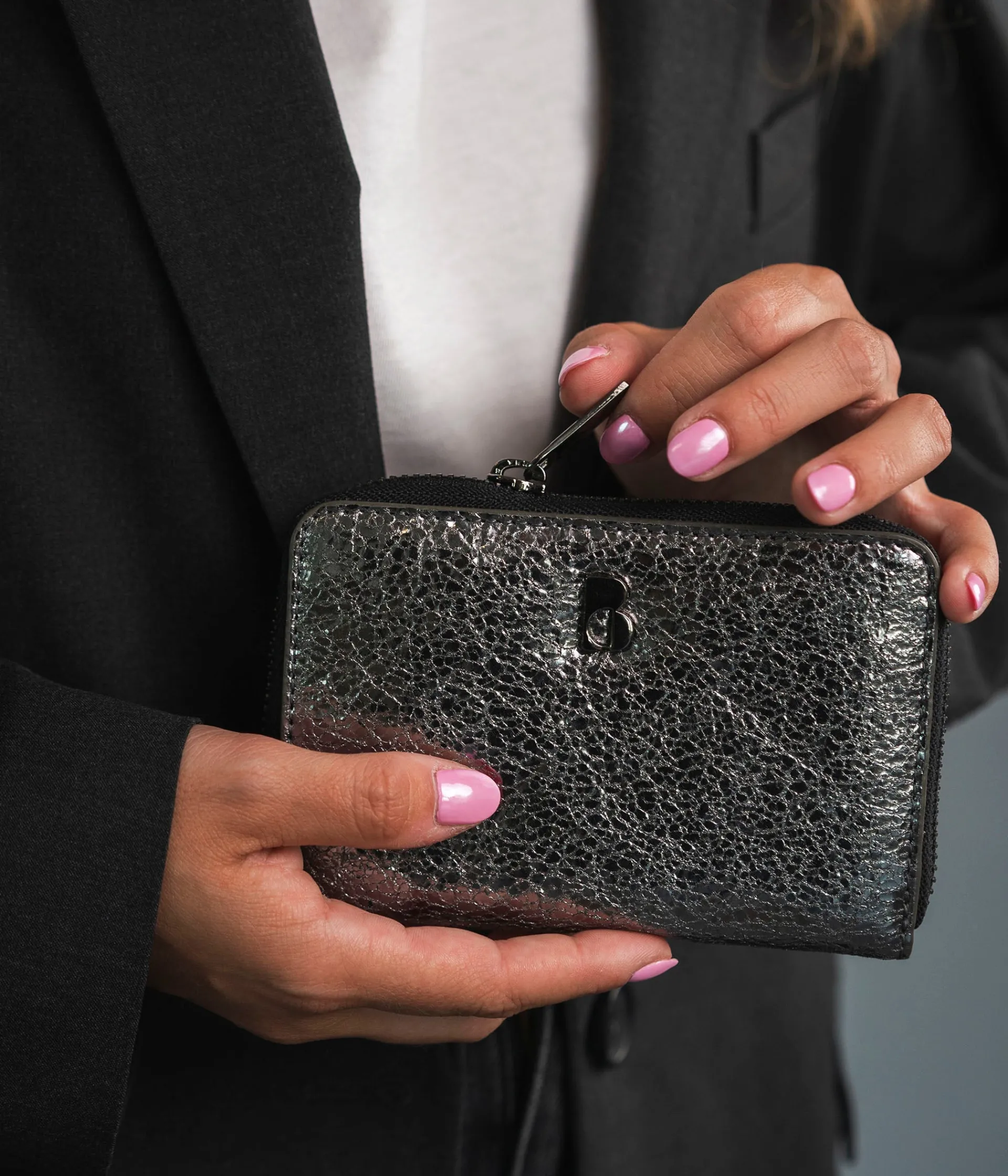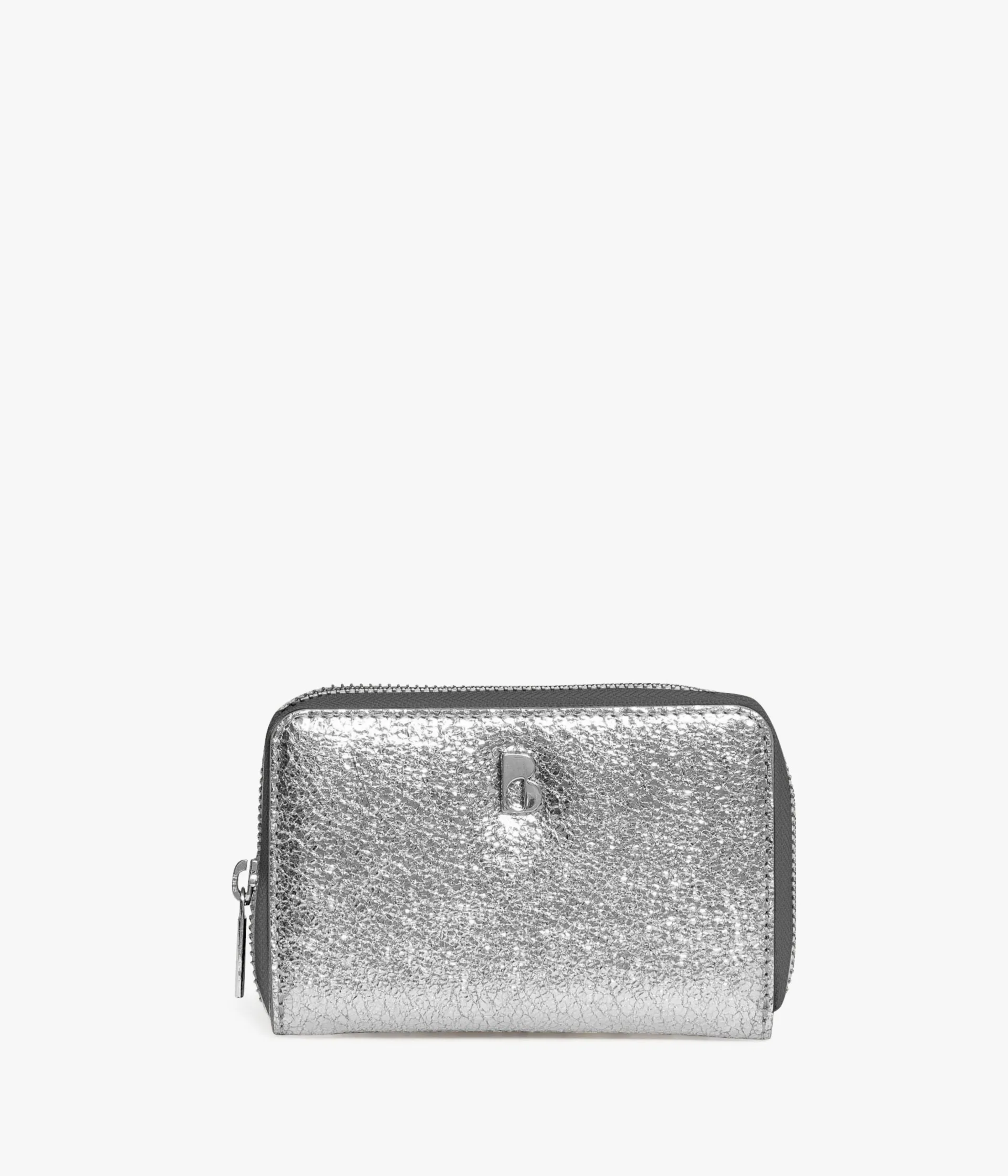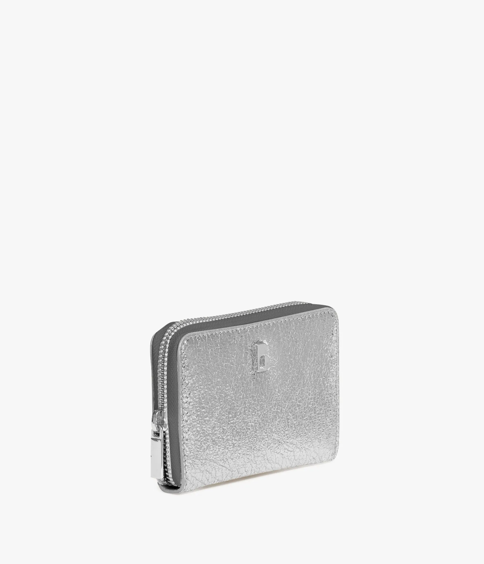 Un sublime porte-monnaie argent en cuir métallisé aspect craquelé. Ce porte-monnaie femme, orné d’un logo en métal argenté possède un large zip offrant une large ouverture. Il offre une poche zippée et des compartiments à cartes. Une véritable touche d’éclat dans votre sac à main ! Dimensions : 9×14 cm. Accessoire de sac livré dans un pochon en coton.
