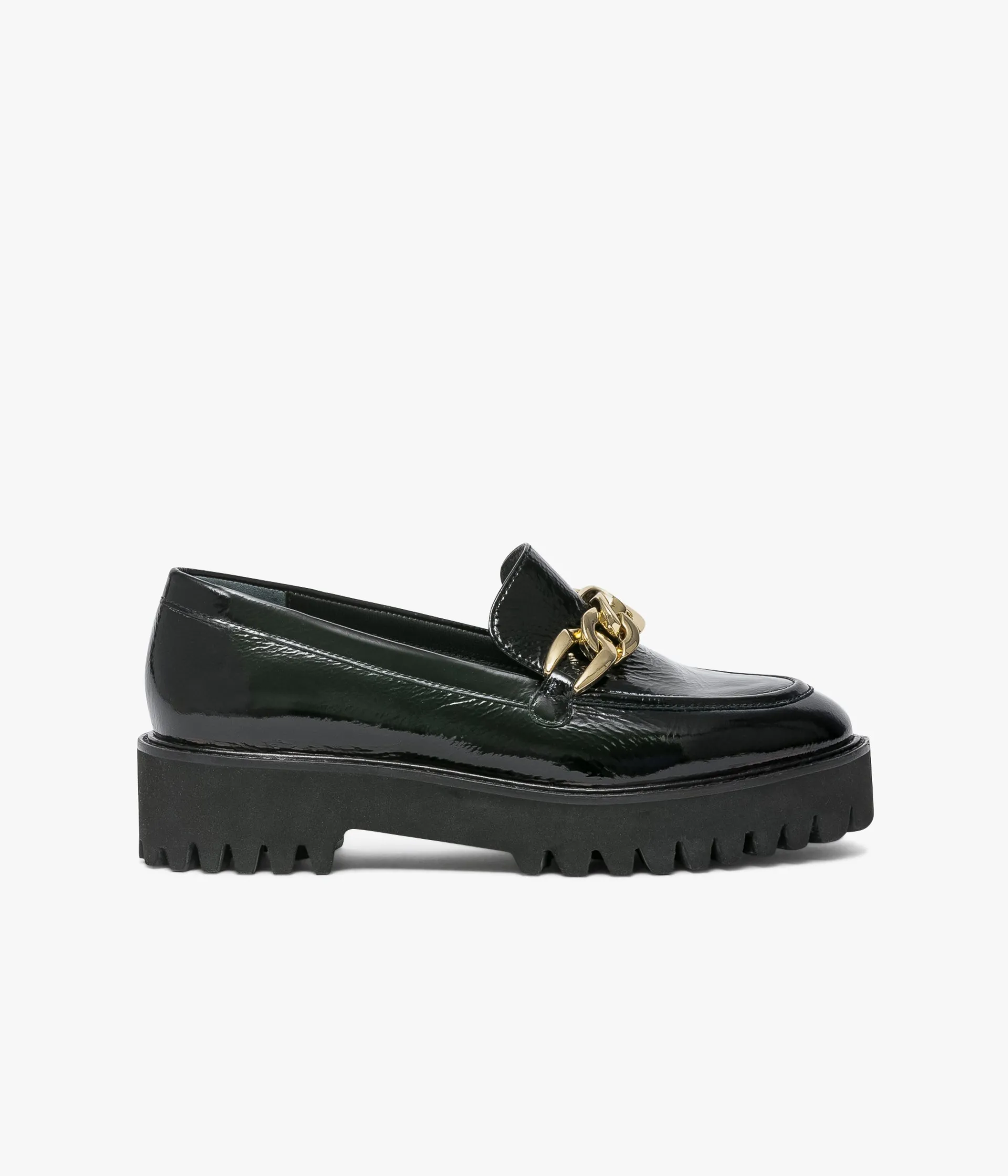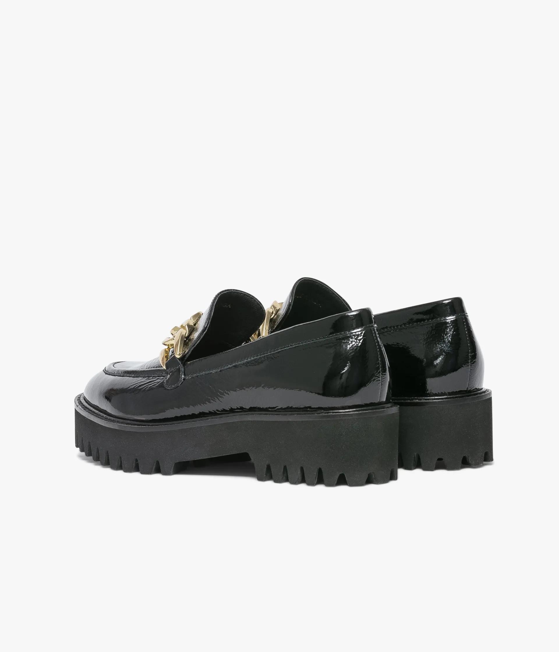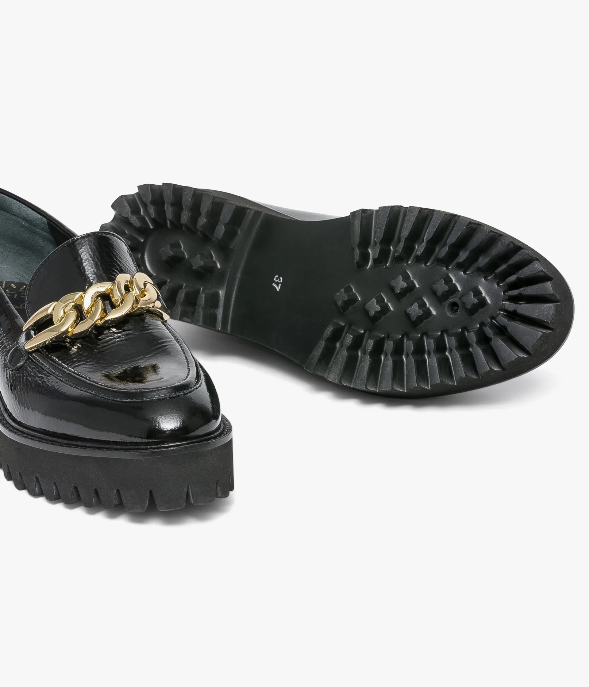 Un mocassin noir en cuir verni fabriqué avec soin, agrémenté d’une chaine en métal doré sur le plateau. Une chaussure entièrement doublée cuir avec semelle intérieure cuir dotée d’une fine mousse. Ce mocassin chunky est posé sur une imposante semelle ton sur ton ultra légère avec trépointe cuir piquée.