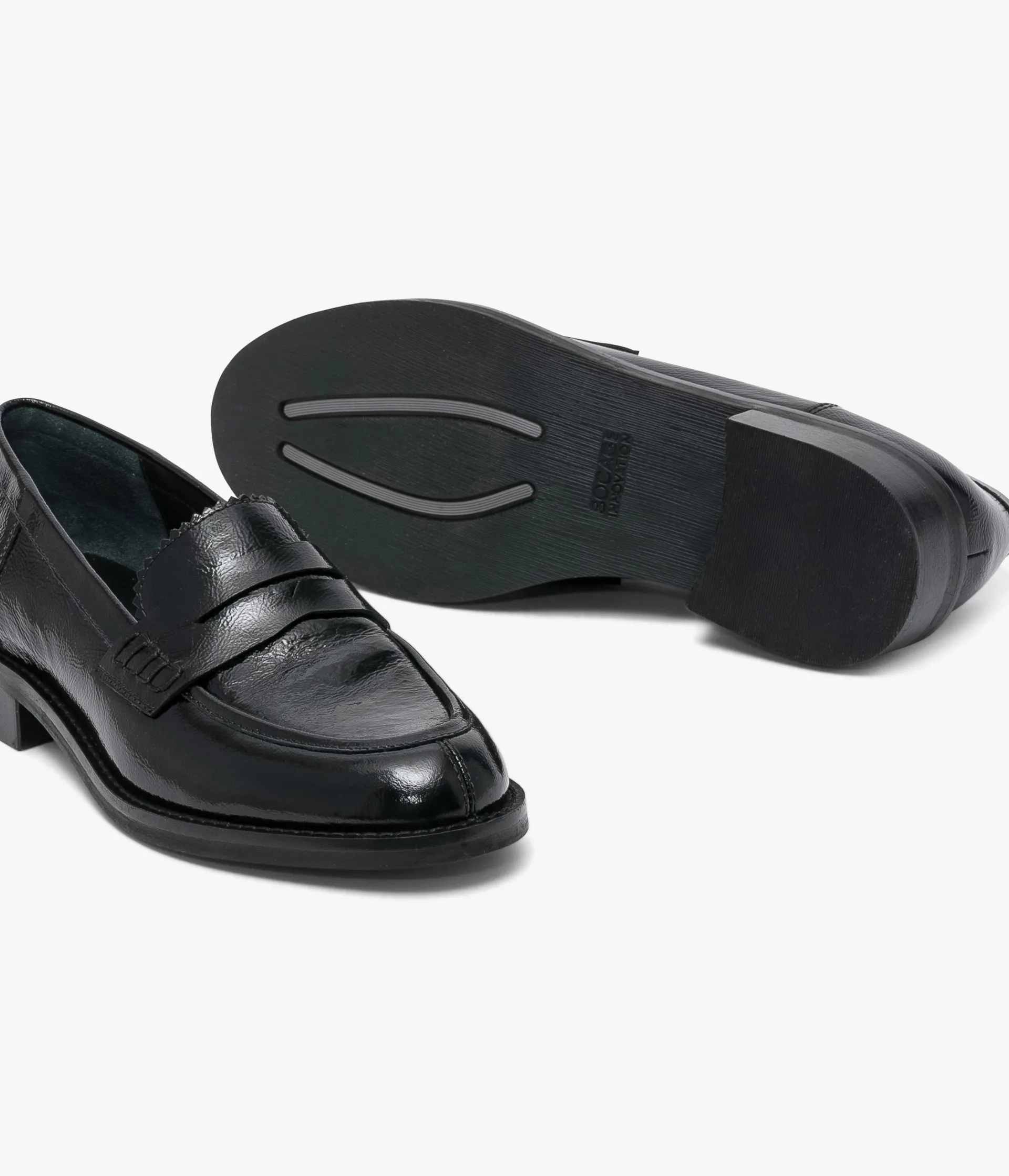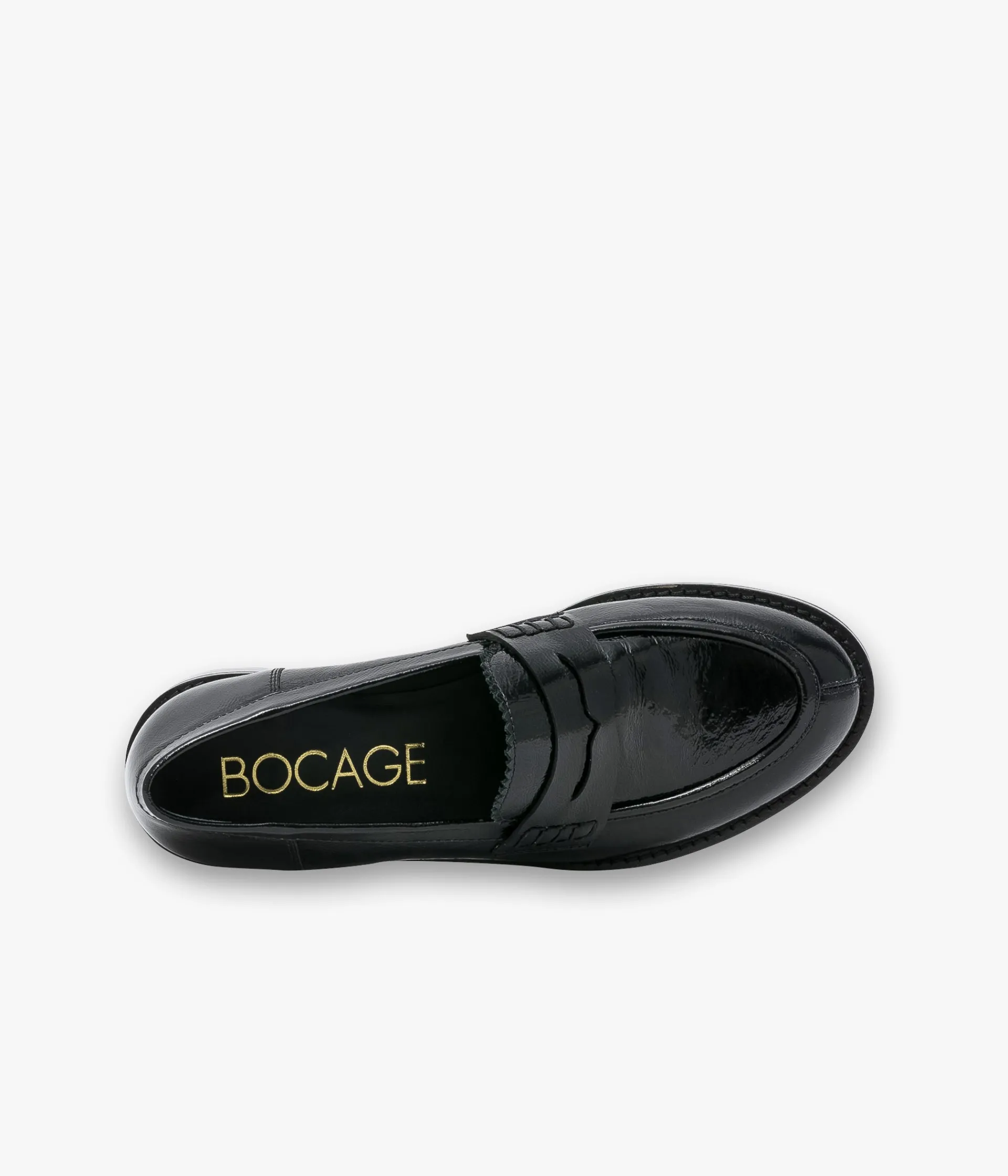 Un mocassin noir en cuir verni fabriqué avec le plus grand soin. Il affiche une couture en relief sur le dessus et un bandeau perforé avec piqûres sellier. Une chaussure élégante avec bout amande et finitions dentelées sur le bord de la languette. Elle repose sur une semelle ton sur ton avec trépointe cuir piquée. Notre technologie Bocage Innovation vous garantit un bien-être inégalé. La semelle dissimule des élastiques qui permettent à votre chaussure de s’adapter à votre pied. Un mocassin entièrement doublé cuir avec semelle intérieure cuir dotée d’une fine mousse.