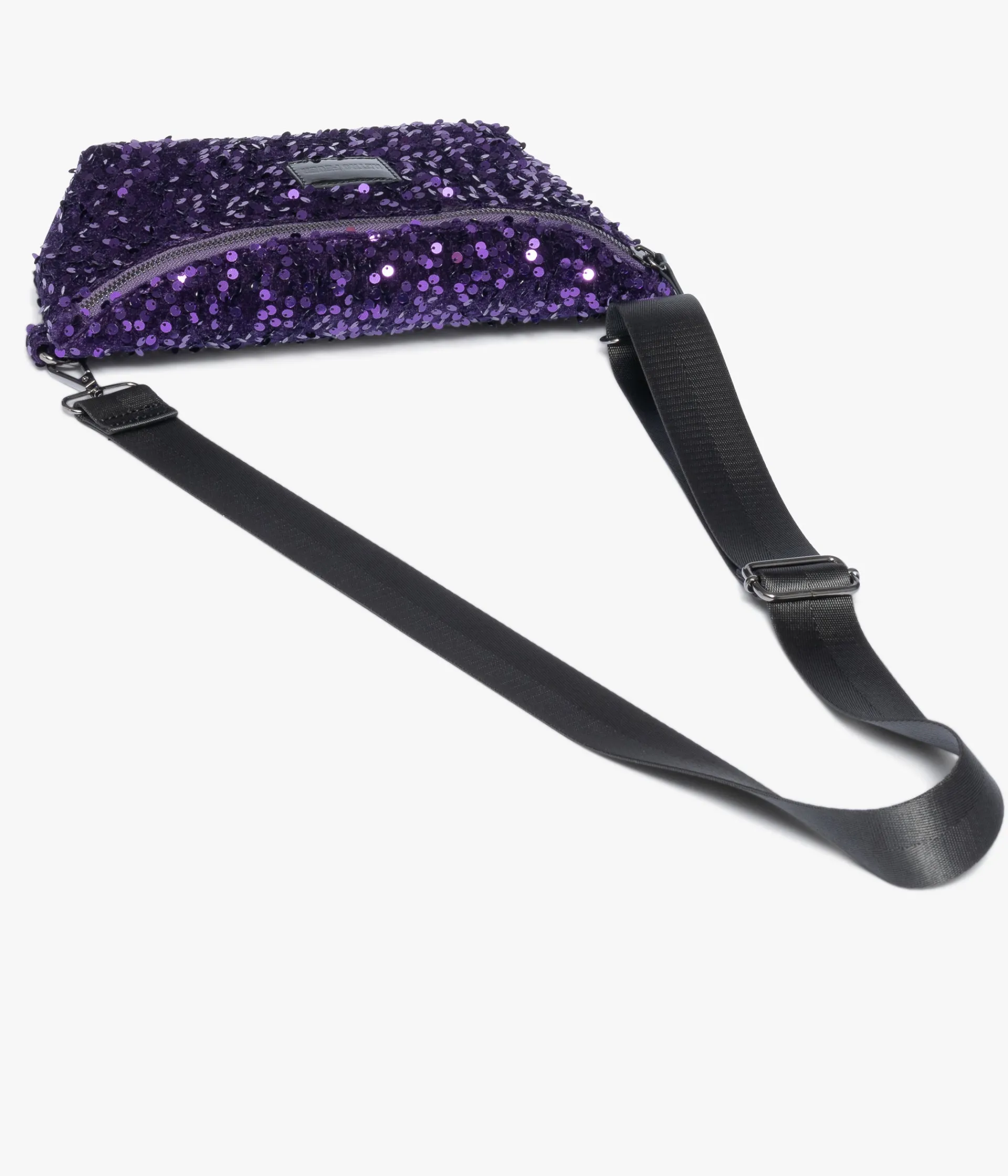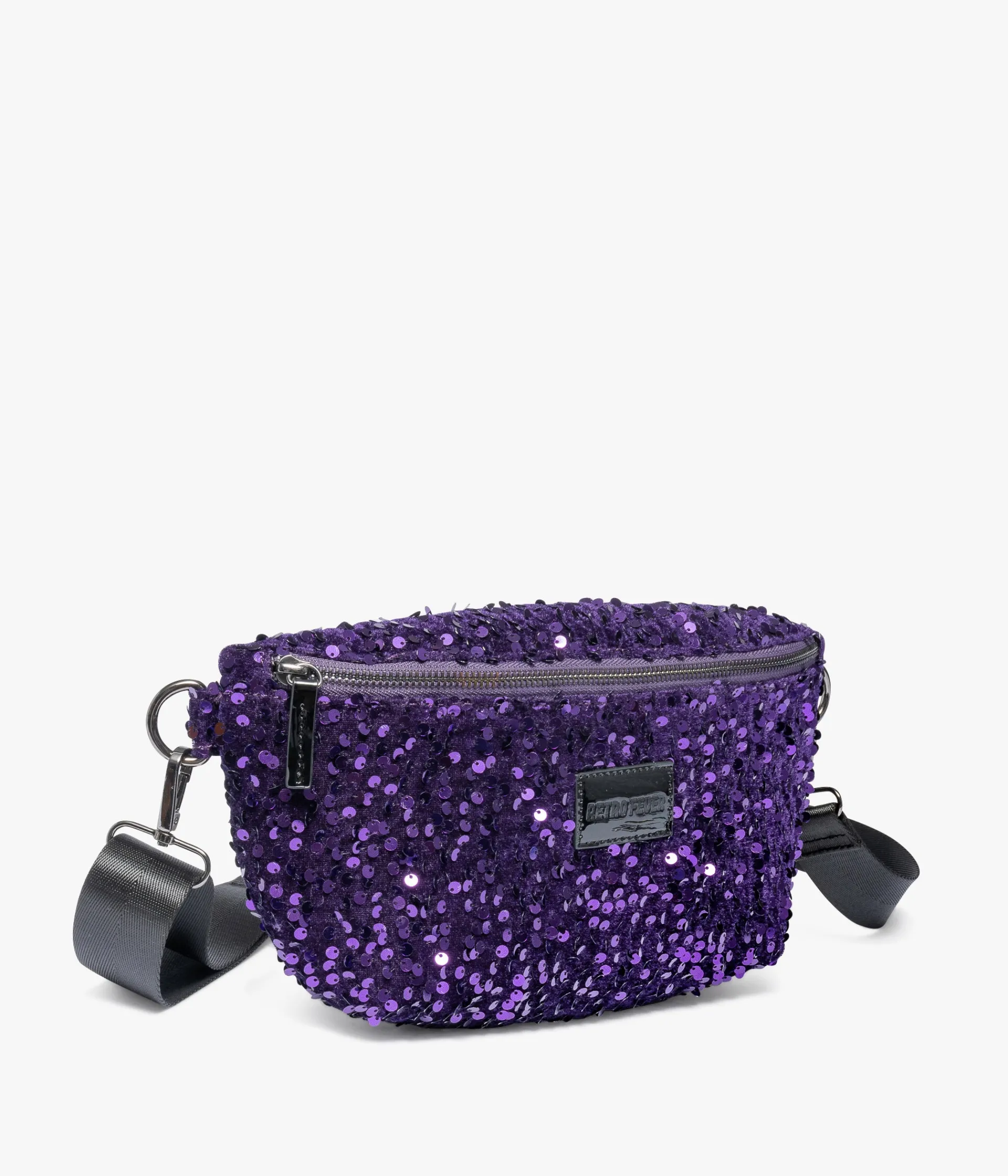 Un sac banane en velours violet entièrement brodé de sequins et orné d’une étiquette vernie sur l’avant. Une banane issue de la collection « Retro Fever » entièrement doublée de satin, offrant un compartiment et une pochette zippée. Elle se porte croisée grâce à une bandoulière ajustable en longueur et amovible grâce à des mousquetons en métal. Dimensions : H19xL32xP7 cm.