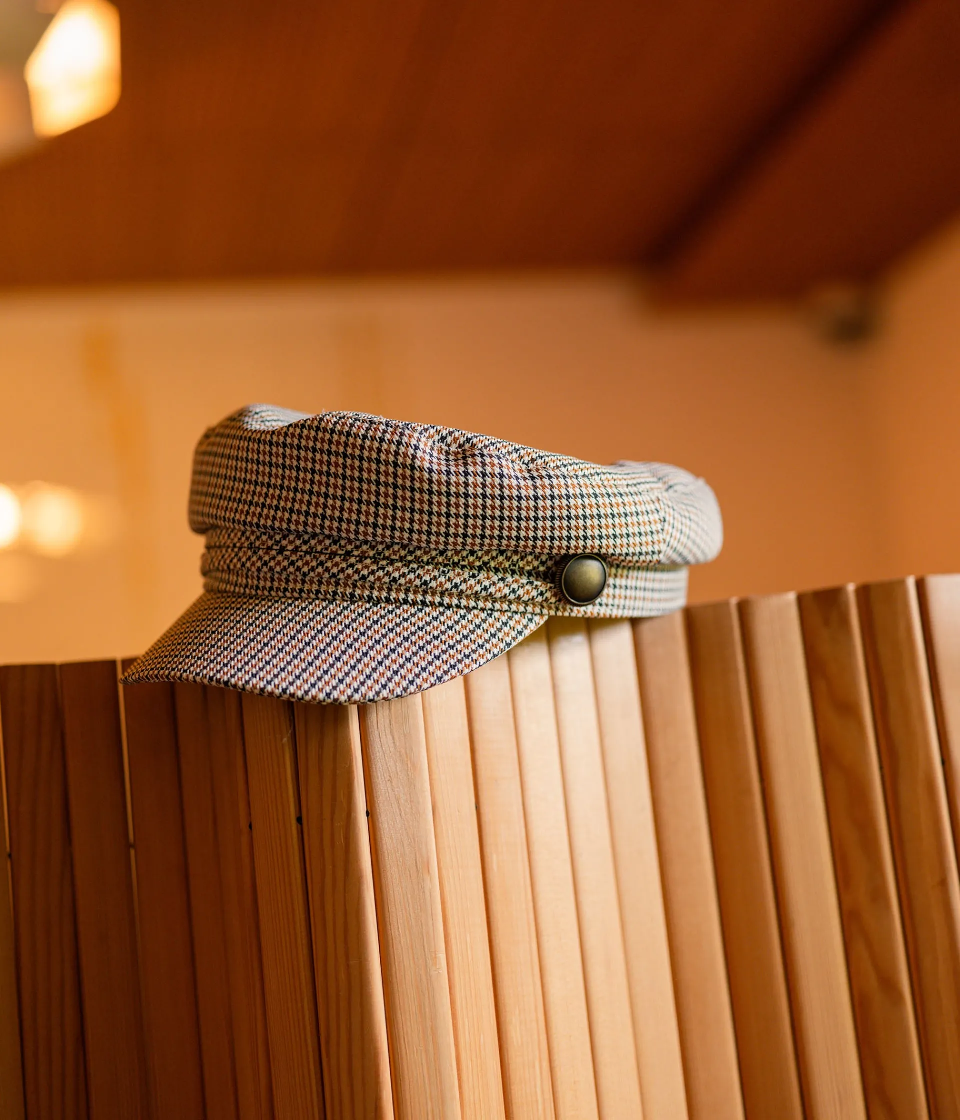 Une casquette beige à motif pied de puces ocre et noir inspirée de l'univers British. Elle possède une visière courte et une double bride amovible fixée par de gros boutons en métal vieilli sur les côtés. Une casquette femme avec doublure matelassée, indispensable pour traverser l’hiver avec style. Bande de propreté à l’intérieur.