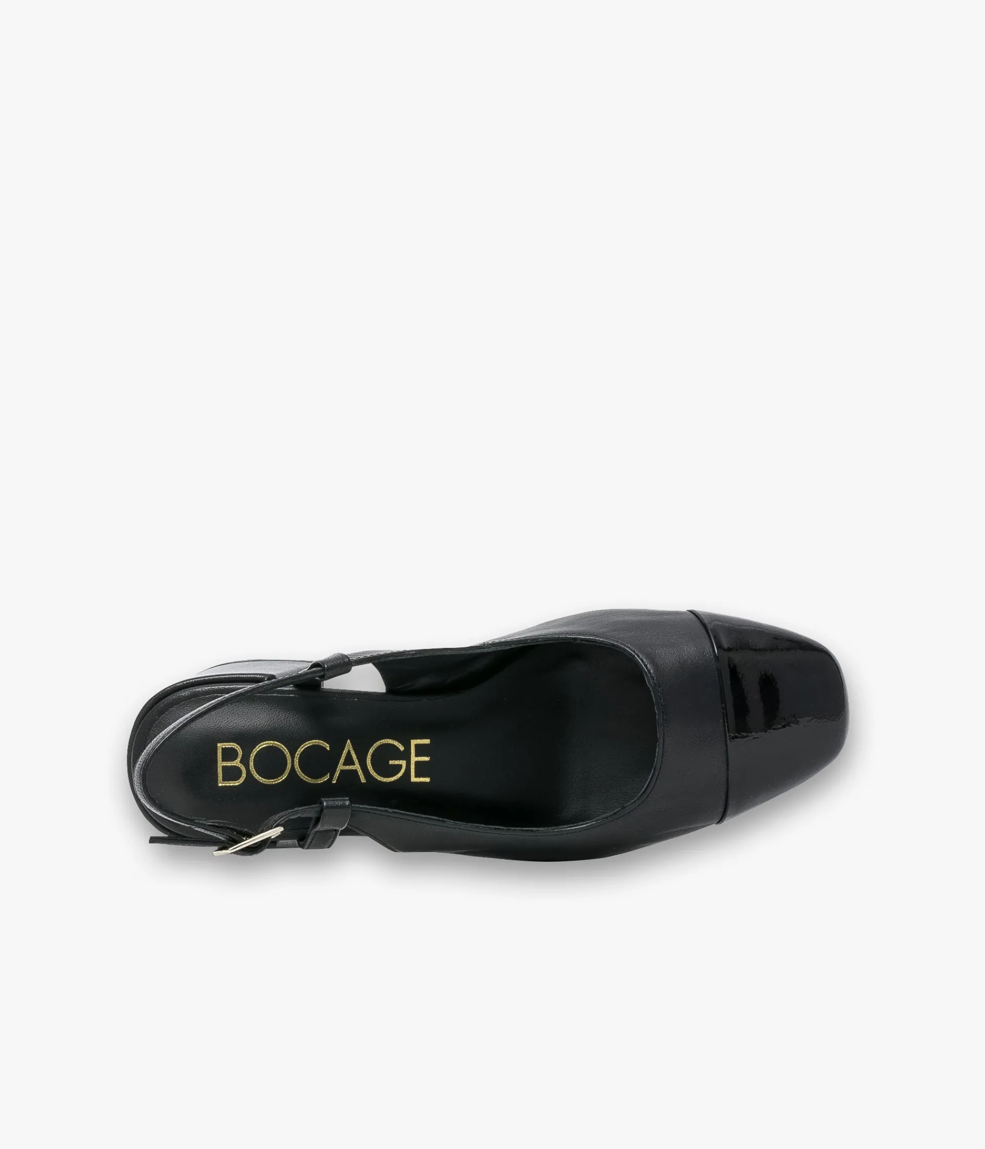 Un escarpin Sling Back noir fabriqué avec soin en cuir lisse ultra souple avec empiècement en cuir verni sur le bout. Il offre un bon maintien grâce à une fine bride au talon fermée par une boucle dorée. Une chaussure entièrement doublée cuir avec semelle intérieure cuir dotée d’une fine mousse. Elle est posée sur une semelle fine et un large talon enrobé. Notre technologie Bocage Innovation vous garantit un bien-être inégalé. La semelle dissimule des élastiques qui permettent à votre chaussure de s’adapter à votre pied.