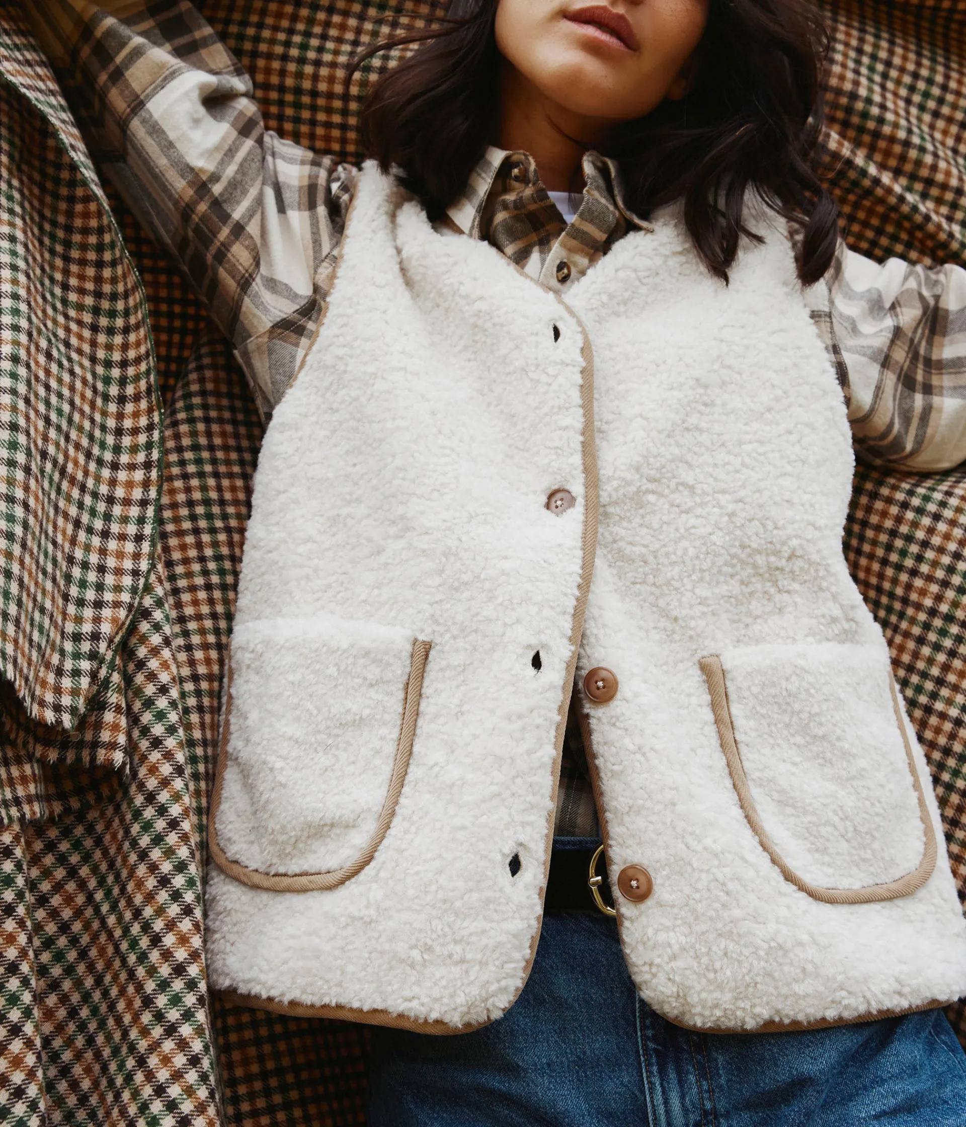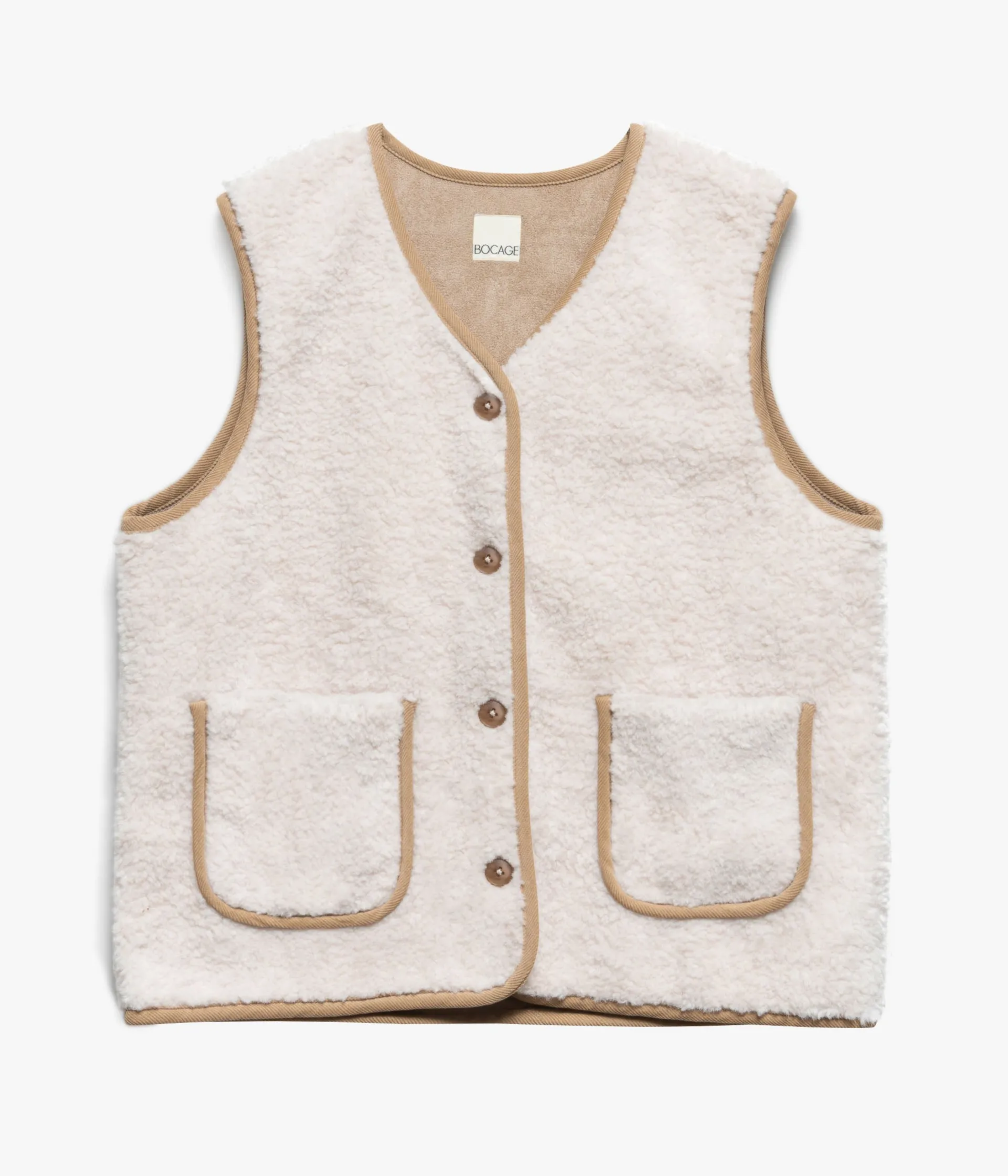 Un gilet sans manches écru en sherpa, pile dans la tendance cocooning. Il possède une doublure en suédine beige et de jolies finitions assorties en velours à fines côtes. Un gilet ample doté de deux poches plaquées sur l’avant. Fermeture 4 boutons. Doublure en matière recyclée. Longueur 62 cm.