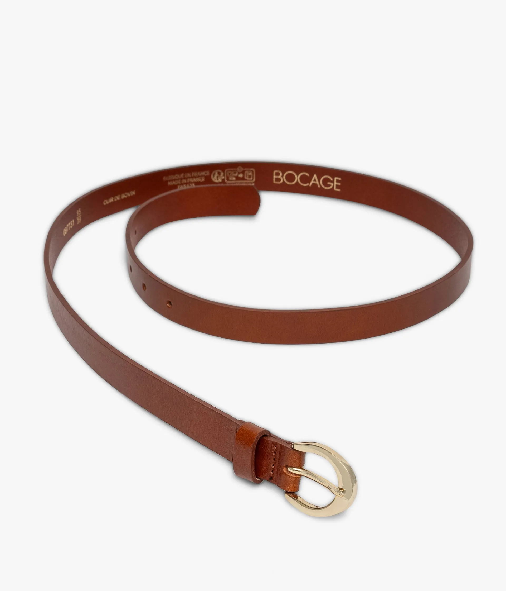 Une jolie ceinture en cuir cognac fabriquée avec soin en France. Une ceinture fine très féminine, qui se ferme grâce à une boucle ovale en métal doré. Glissée dans les passants d’un jean ou portée avec une robe fleurie, elle s'adapte aisément à tous les looks. Largeur 1,9 cm.