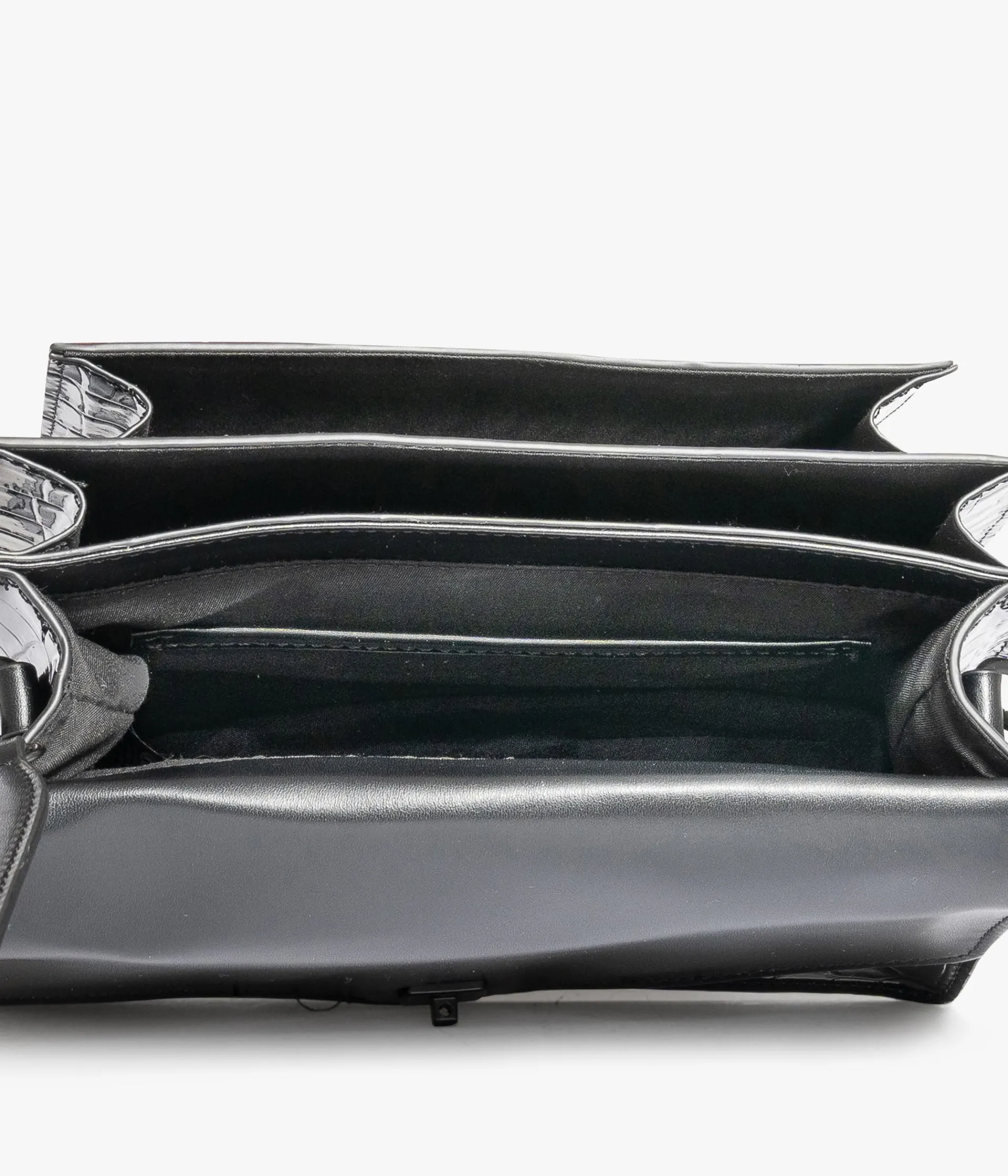Un joli sac noir imitation croco à l’allure chic et tendance réalisé en matière vernie. Un sac à la structure rigide, fermé par un rabat décoré d’un logo en métal noir. Il offre trois compartiments, une pochette zippée et une poche au dos. Ce sac femme se porte à la main ou sur l’épaule grâce à une bandoulière amovible ajustable en longueur. Doublure en polyester recyclé. Dimensions : H16*L22*9,5 cm.