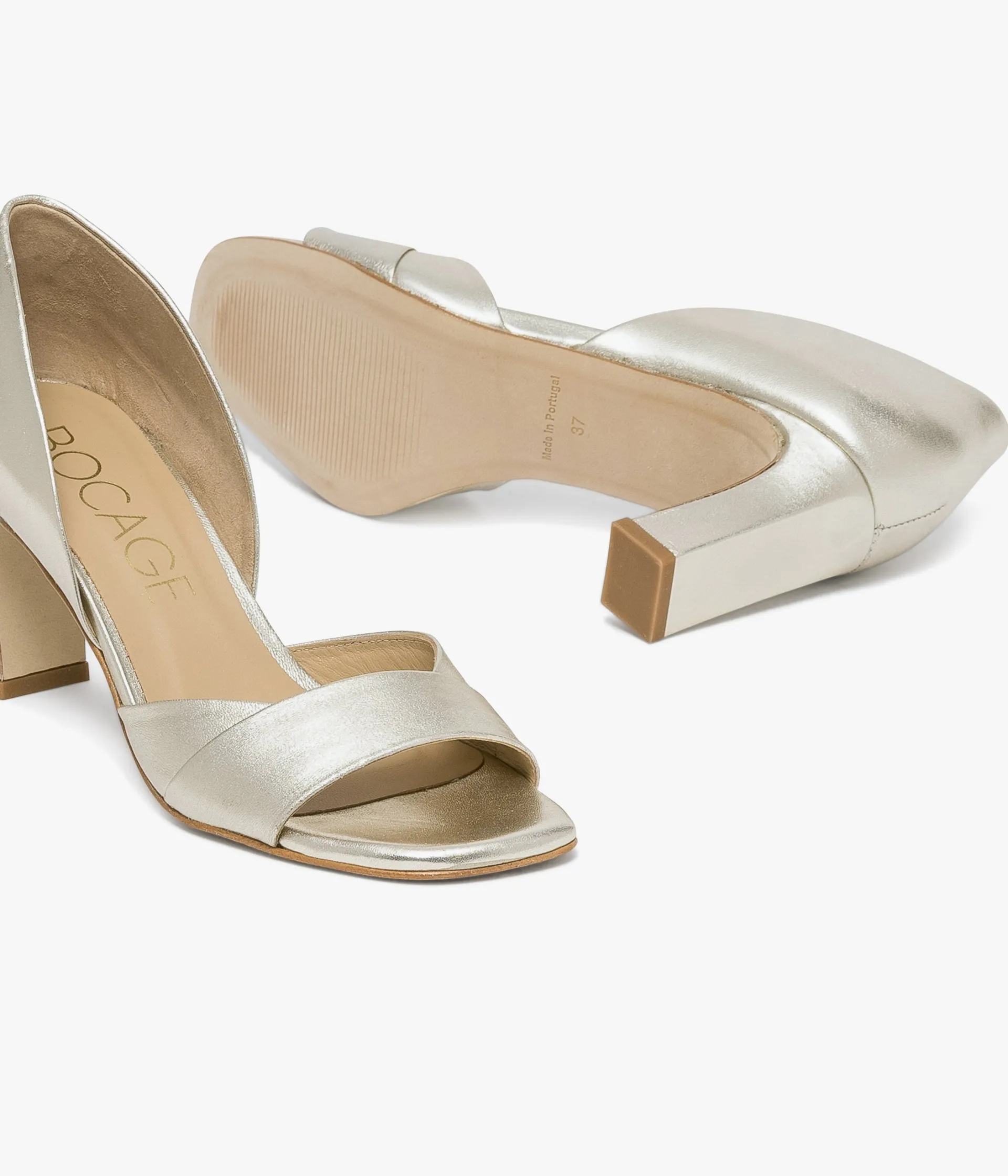 Une sandale platine en cuir métallisé fabriquée avec soin au Portugal. Une sandale particulièrement élégante avec sa structure largement ouverte sur l’avant du pied, sa semelle à bout carré et son talon graphique de 7,5 cm. Elle offre un bon maintien grâce à son talon fermé et apporte une note ultra chic à toutes les tenues de la saison. Une chaussure de cérémonie entièrement doublée cuir avec semelle intérieure cuir.