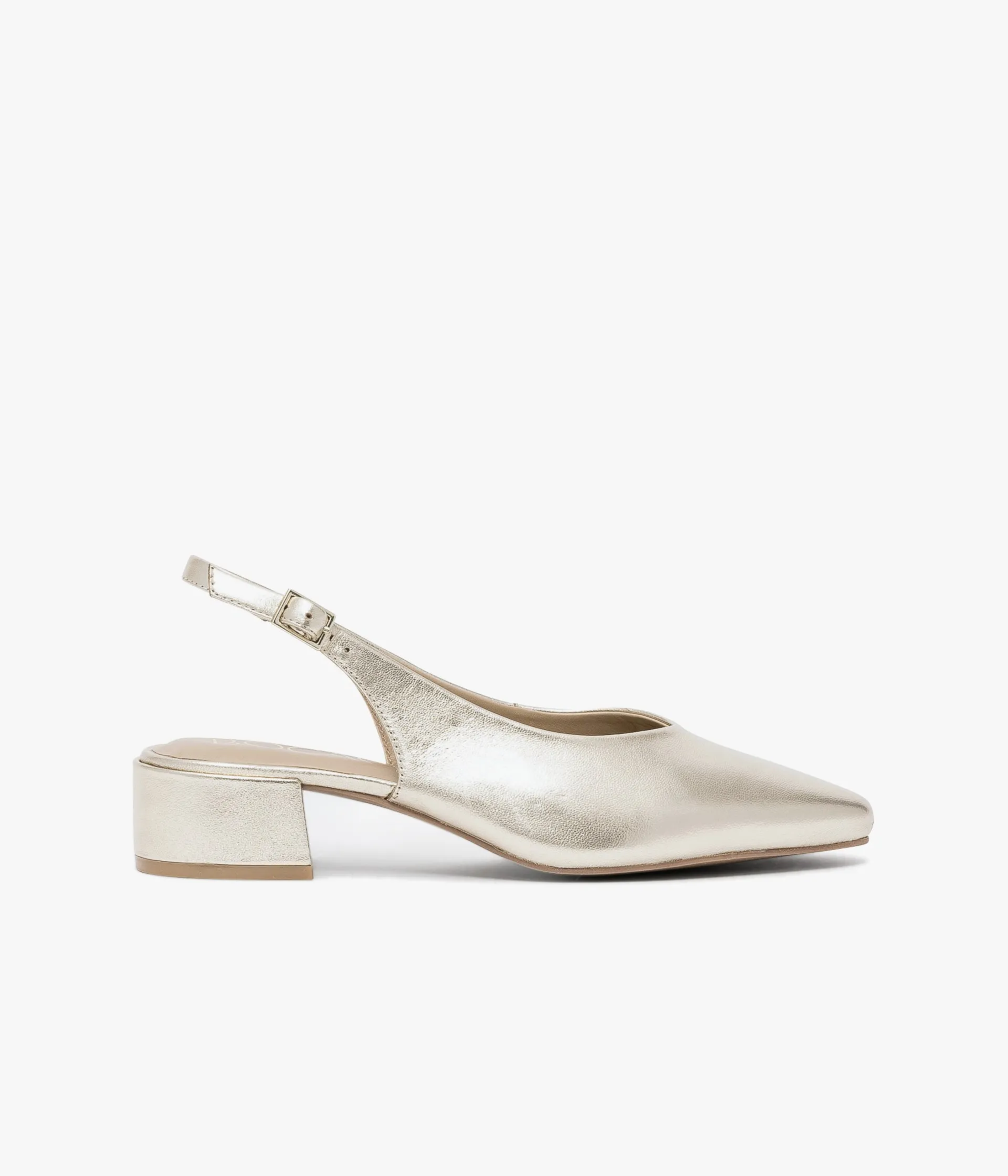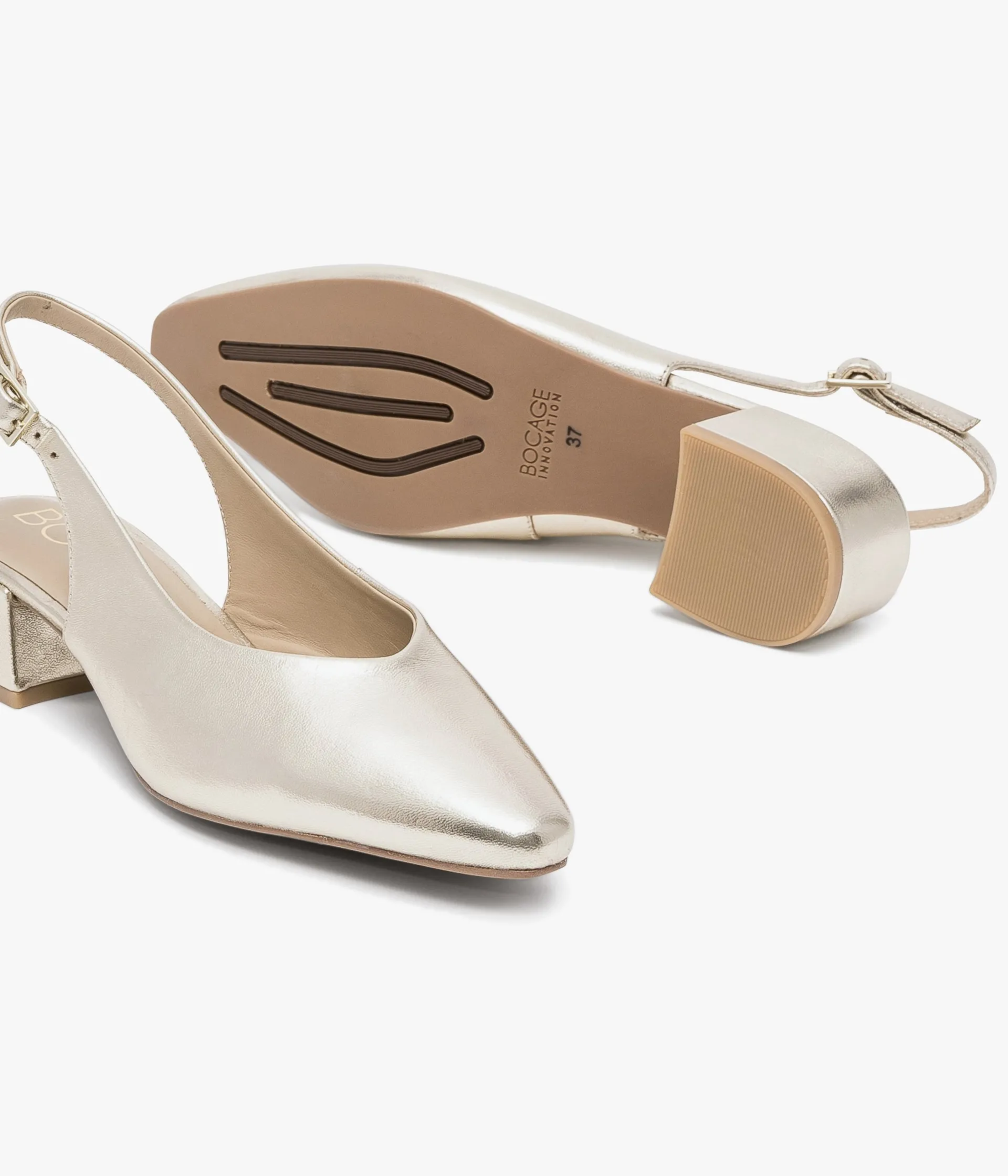 Une ballerine platine en cuir métallisé fabriquée avec le plus grand soin. Un sling-back à bout pointu particulièrement élégant, fermé par une fine boucle dorée sur le côté. Il est posé sur une semelle fine et un talon enrobé parfaitement stable. Notre technologie Bocage Innovation vous garantit un bien-être inégalé. La semelle dissimule des élastiques qui permettent à votre chaussure de s’adapter à votre pied. Une chaussure de cérémonie entièrement doublée cuir avec semelle intérieure cuir dotée d’une fine mousse.