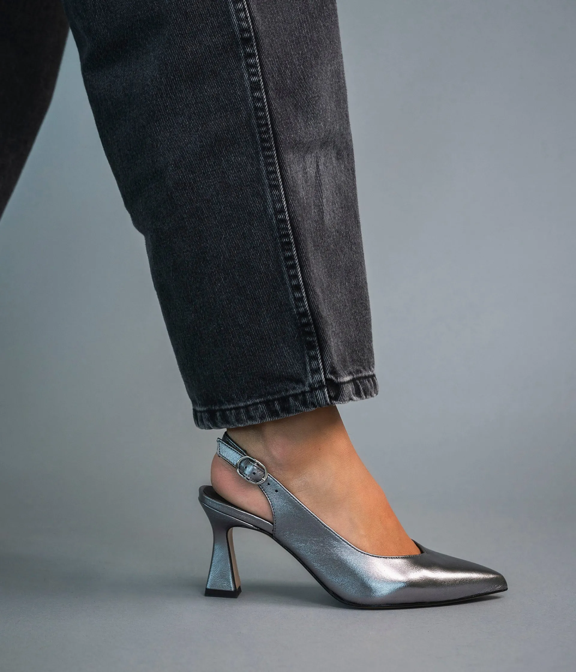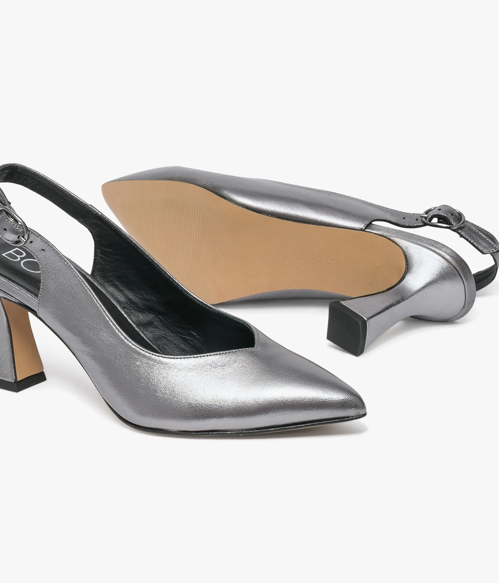 Un escarpin Sling-back argent en cuir métallisé fabriqué avec soin au Portugal. Ultra chic avec son bout pointu et son décolleté en V, il repose avec élégance sur un talon sablier enrobé et se ferme à l’aide d’une boucle en métal ton sur ton. Une chaussure entièrement doublée cuir avec semelle intérieure cuir dotée d’une fine mousse, qui ajoutera une touche de sophistication aux looks du quotidien comme aux tenues de soirée.