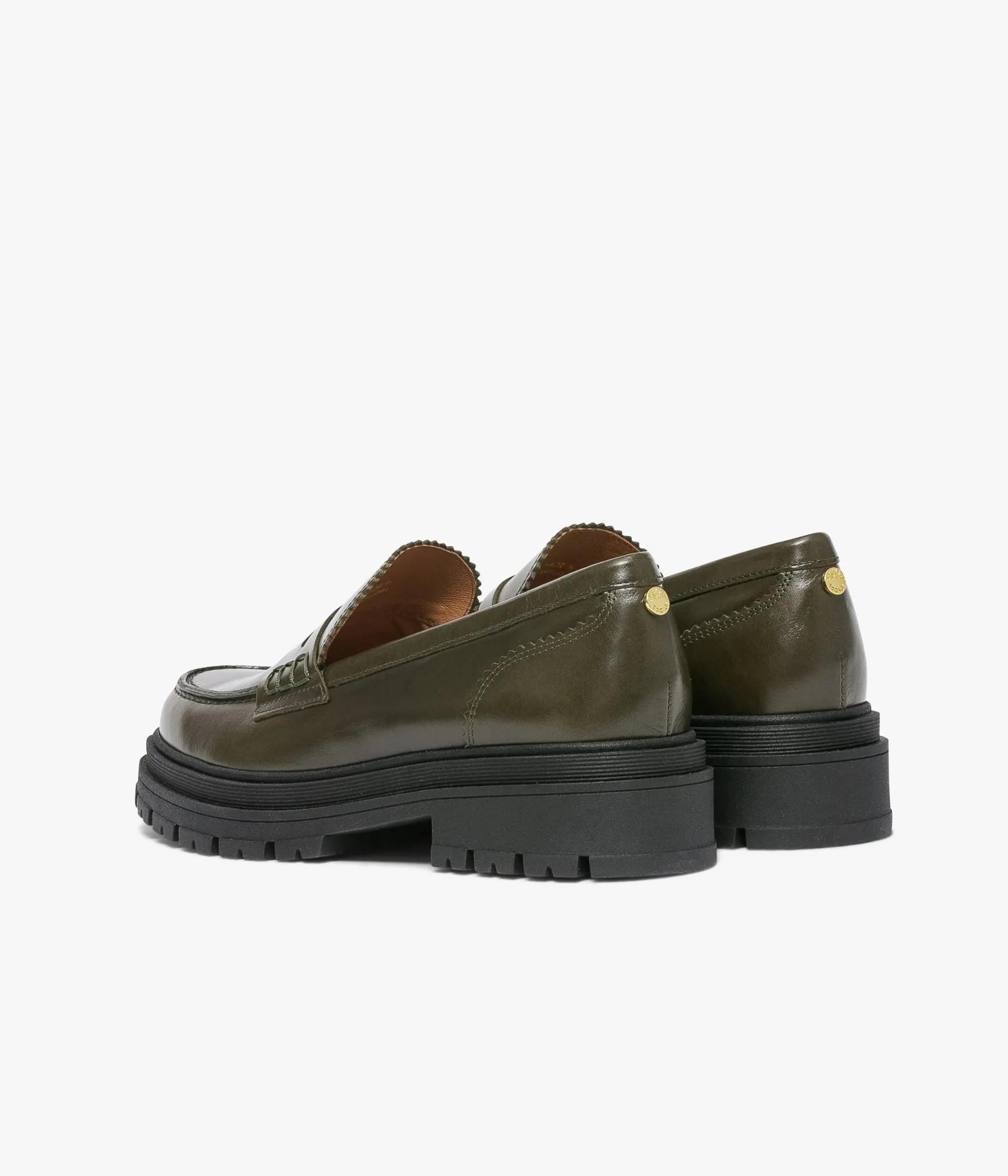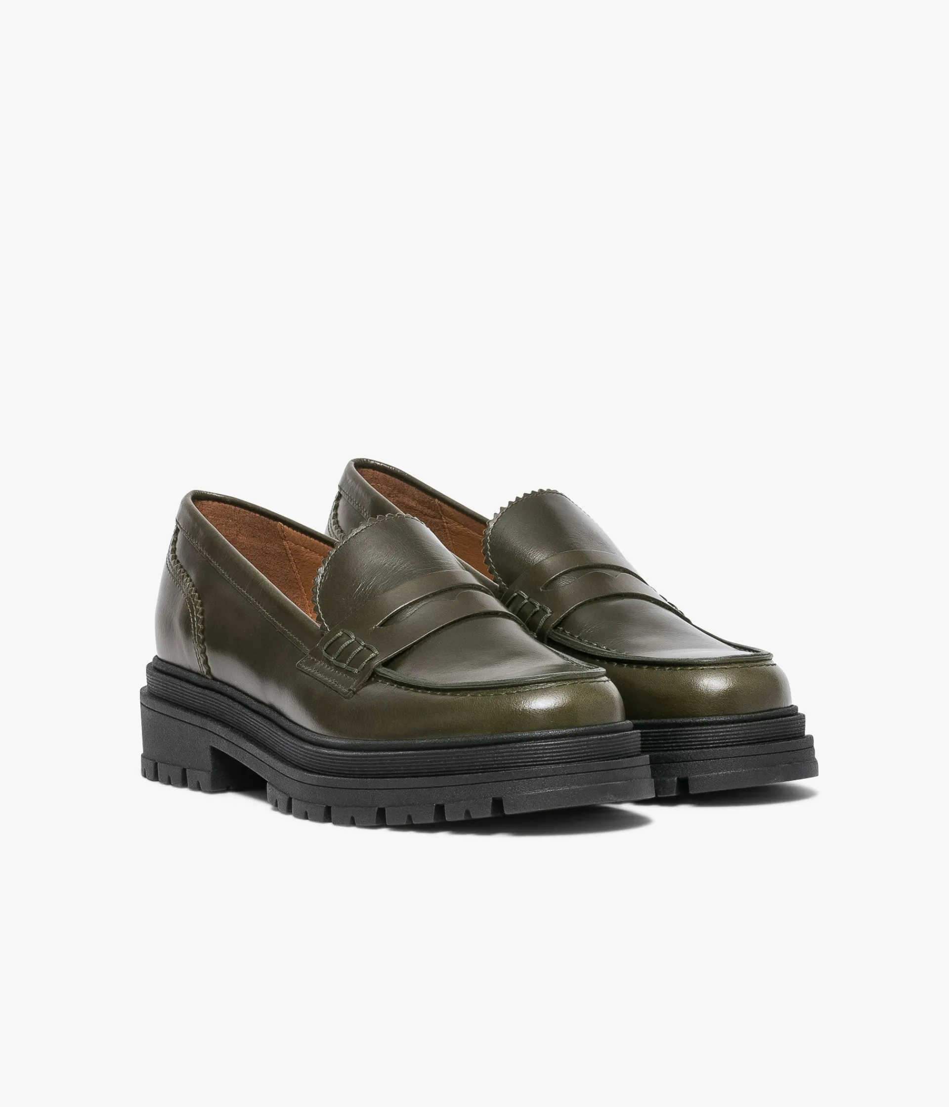 Un mocassin chunky kaki en cuir lisse fabriqué avec soin dans notre atelier au Portugal. Il se distingue par ses finitions dentelées sur la languette et au talon. Une chaussure entièrement doublée cuir avec semelle intérieure cuir dotée d’une fine mousse. Elle est posée sur une épaisse semelle crantée avec large talon.