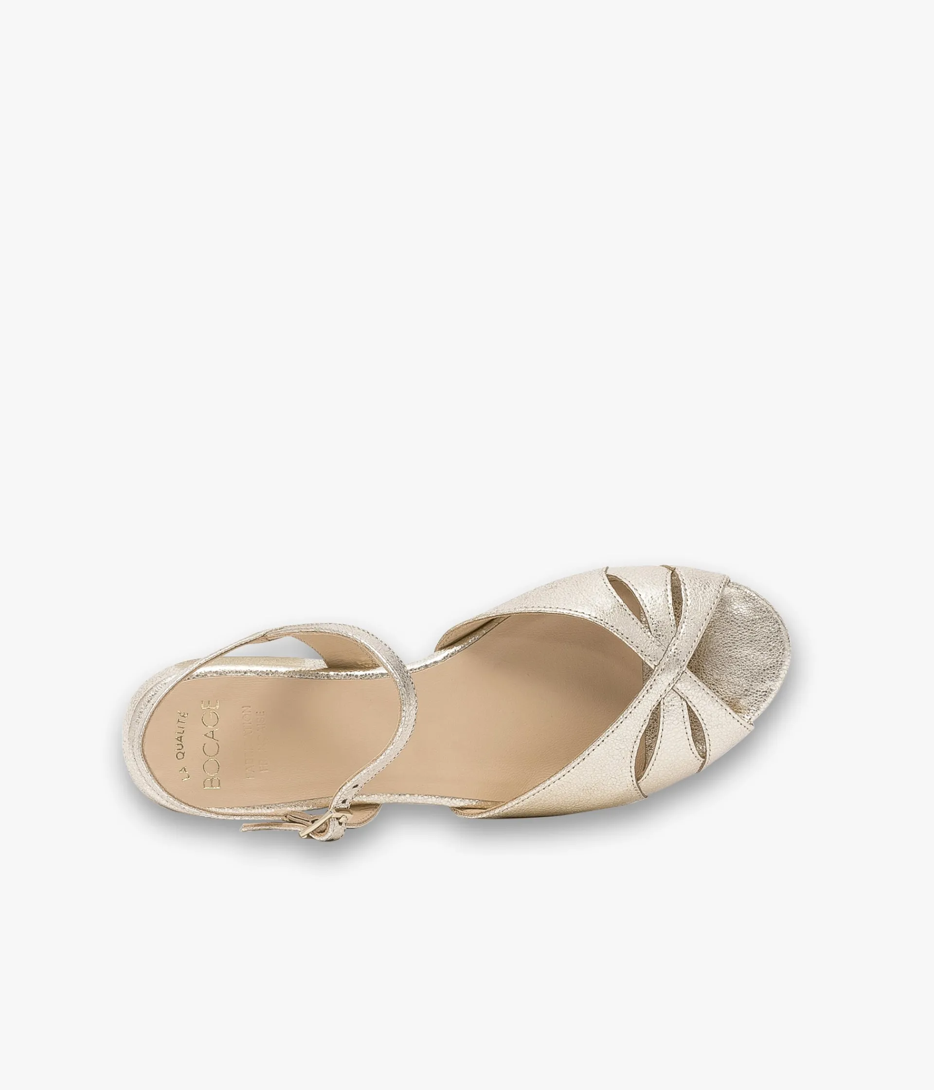 Une sandale platine en cuir métallisé craquelé fabriquée avec soin dans notre propre atelier en France, au cœur du Maine et Loire (49). Elle dévoile largement le pied grâce à sa bride forme papillon et ses fines brides autour de la cheville. Cette sandale entièrement doublée cuir avec semelle intérieure cuir dotée d’une fine mousse repose sur un petit talon flare ultra confortable. Notre technologie Bocage Innovation vous garantit un bien-être inégalé. La semelle dissimule des élastiques qui permettent à votre chaussure de s’adapter à votre pied. Fermeture par boucle dorée.