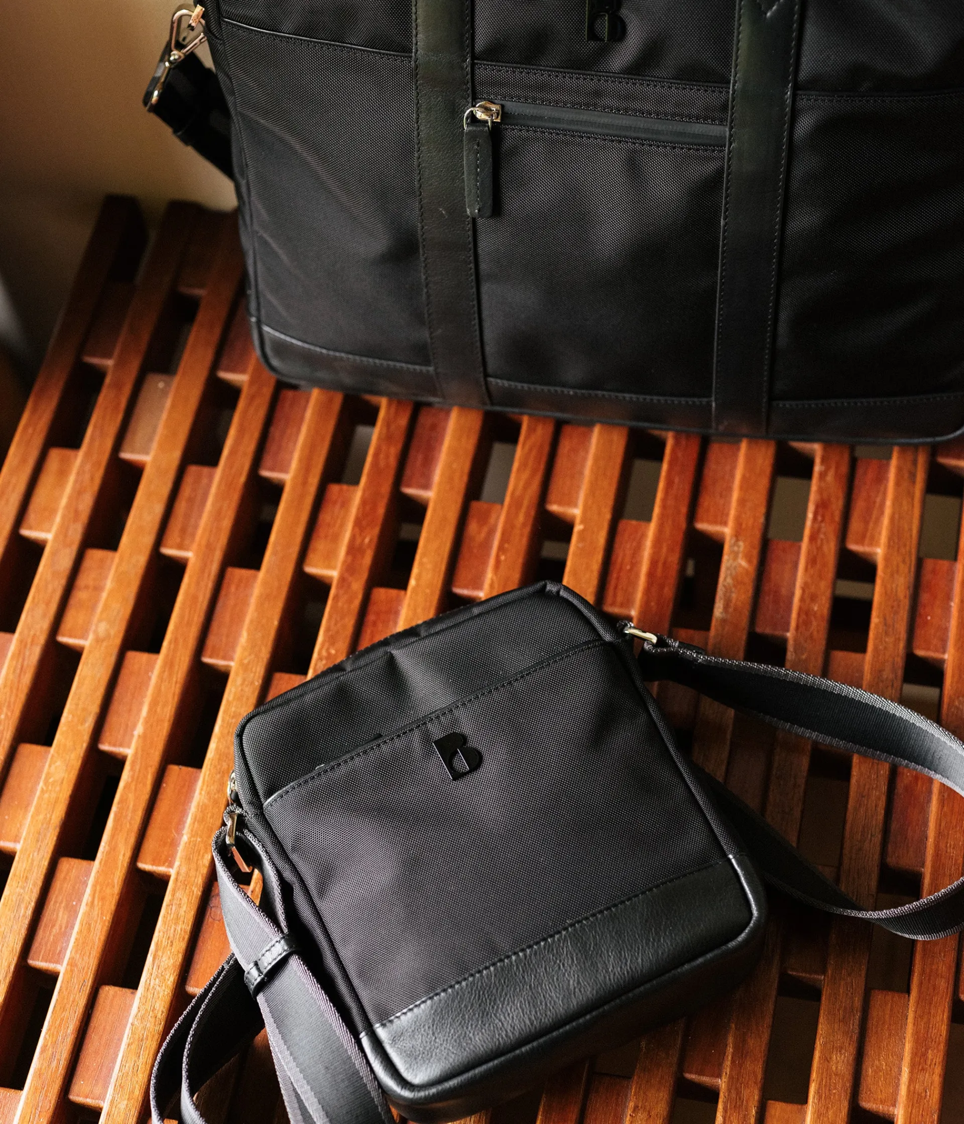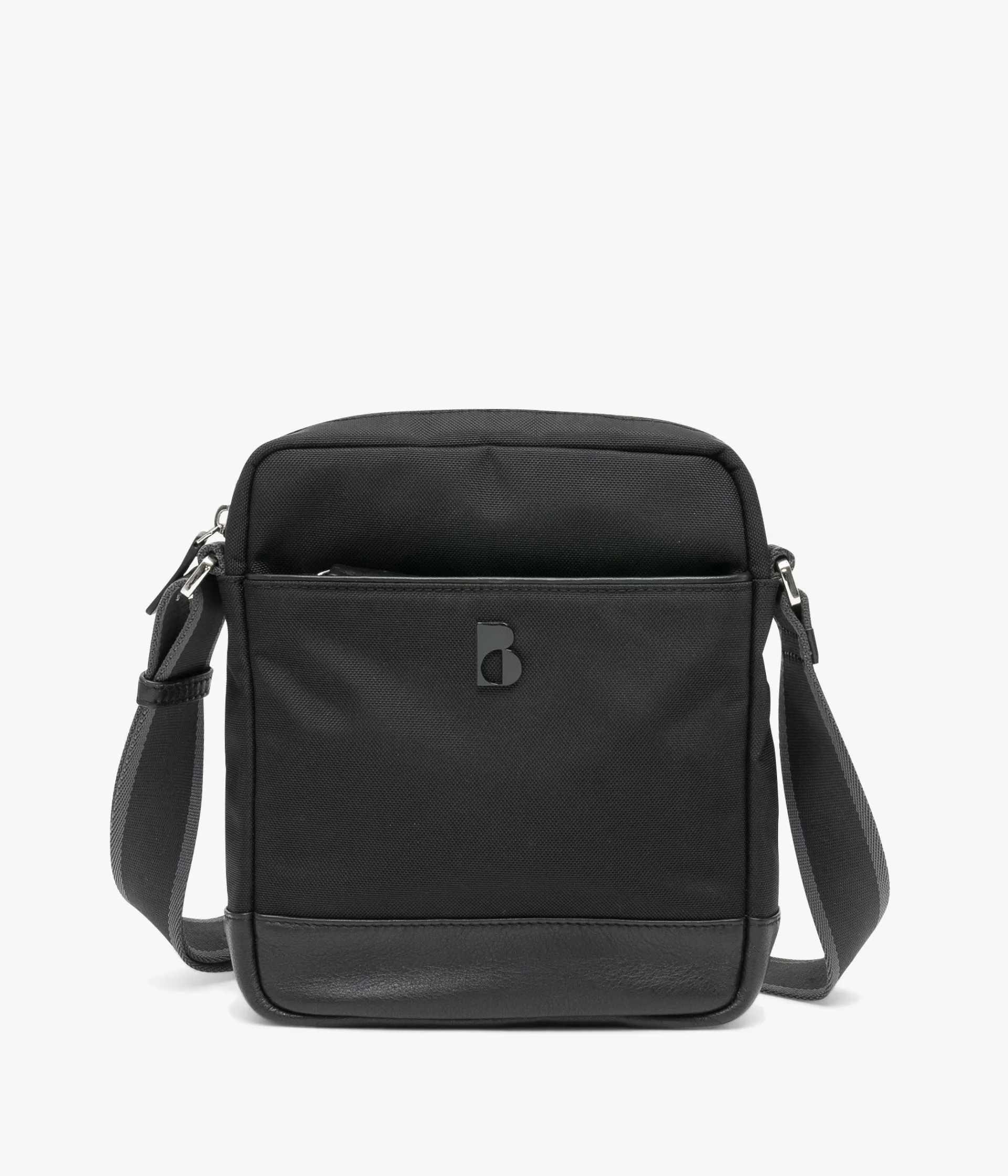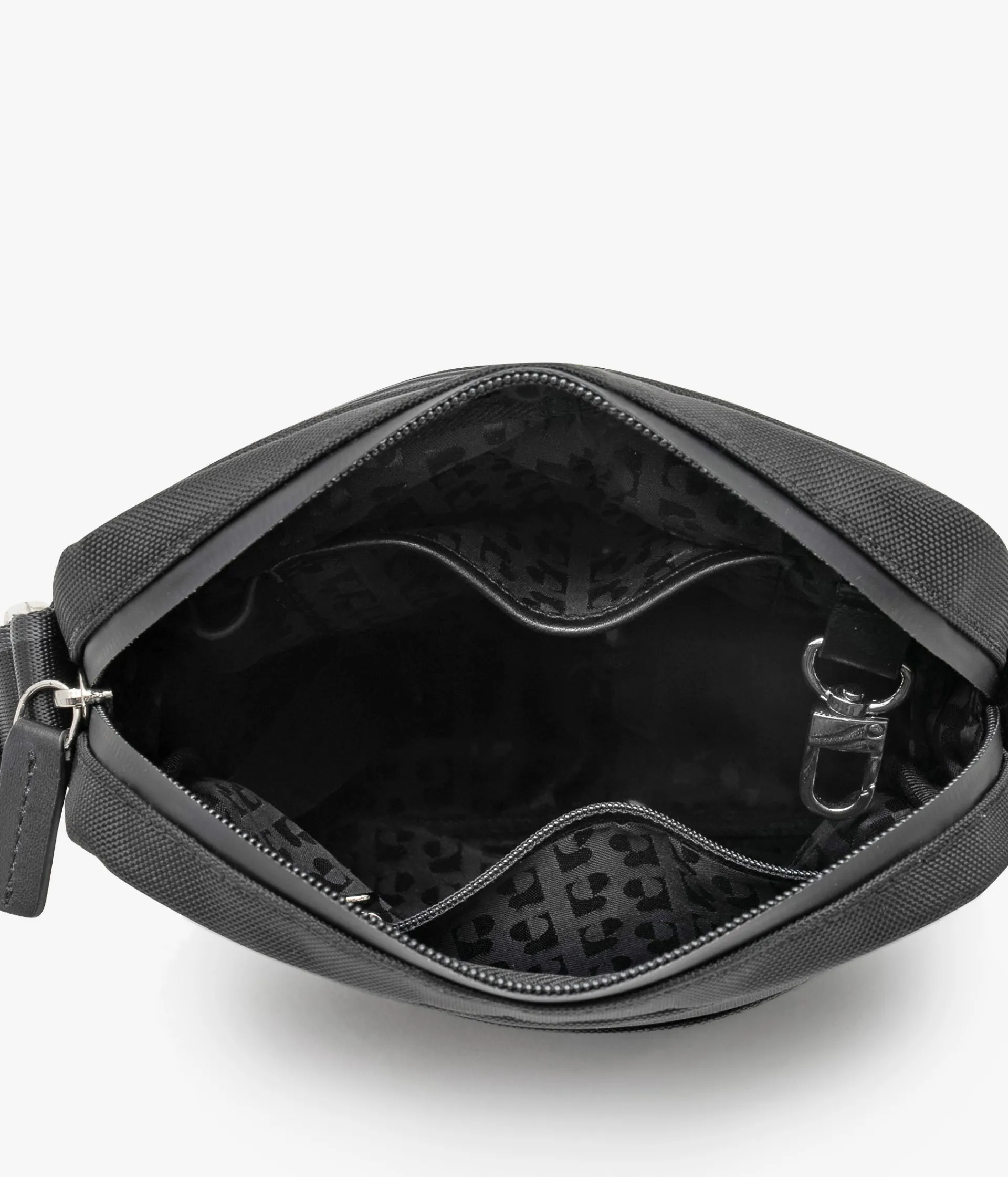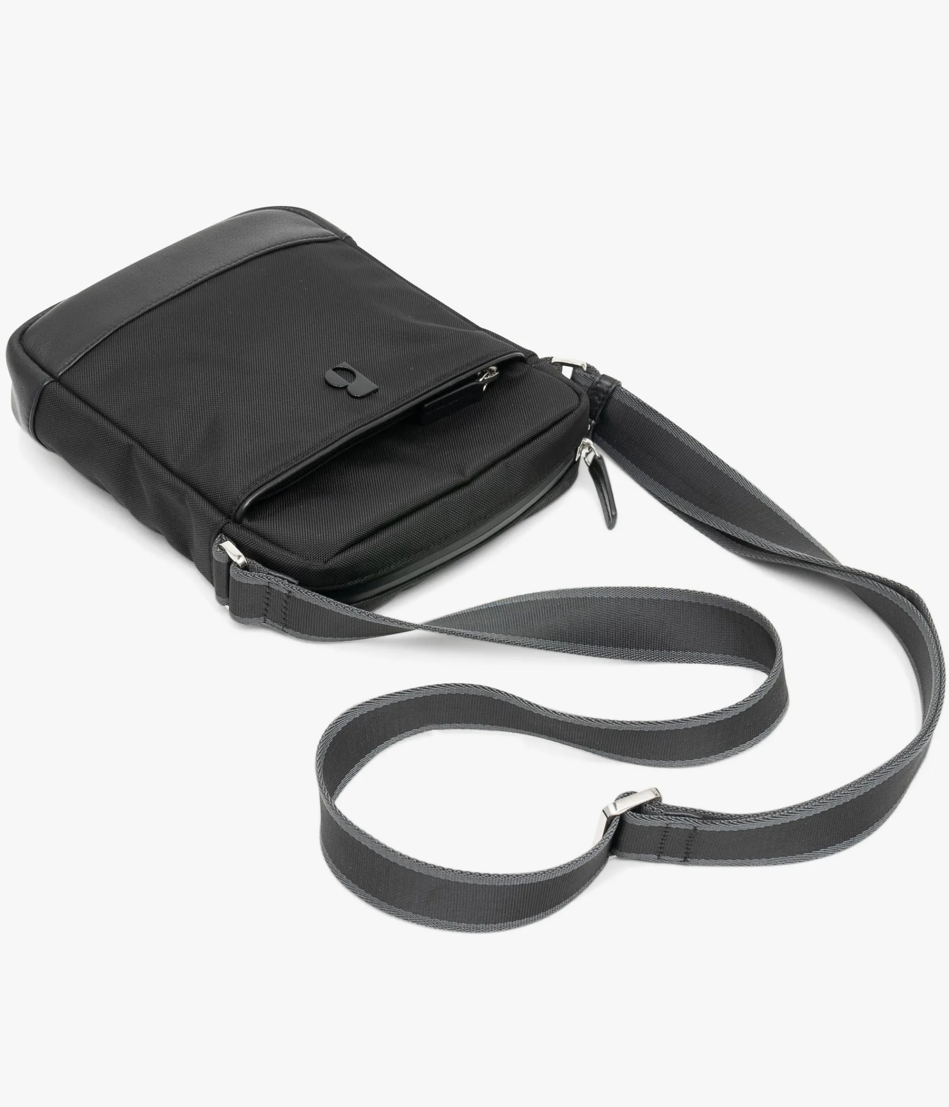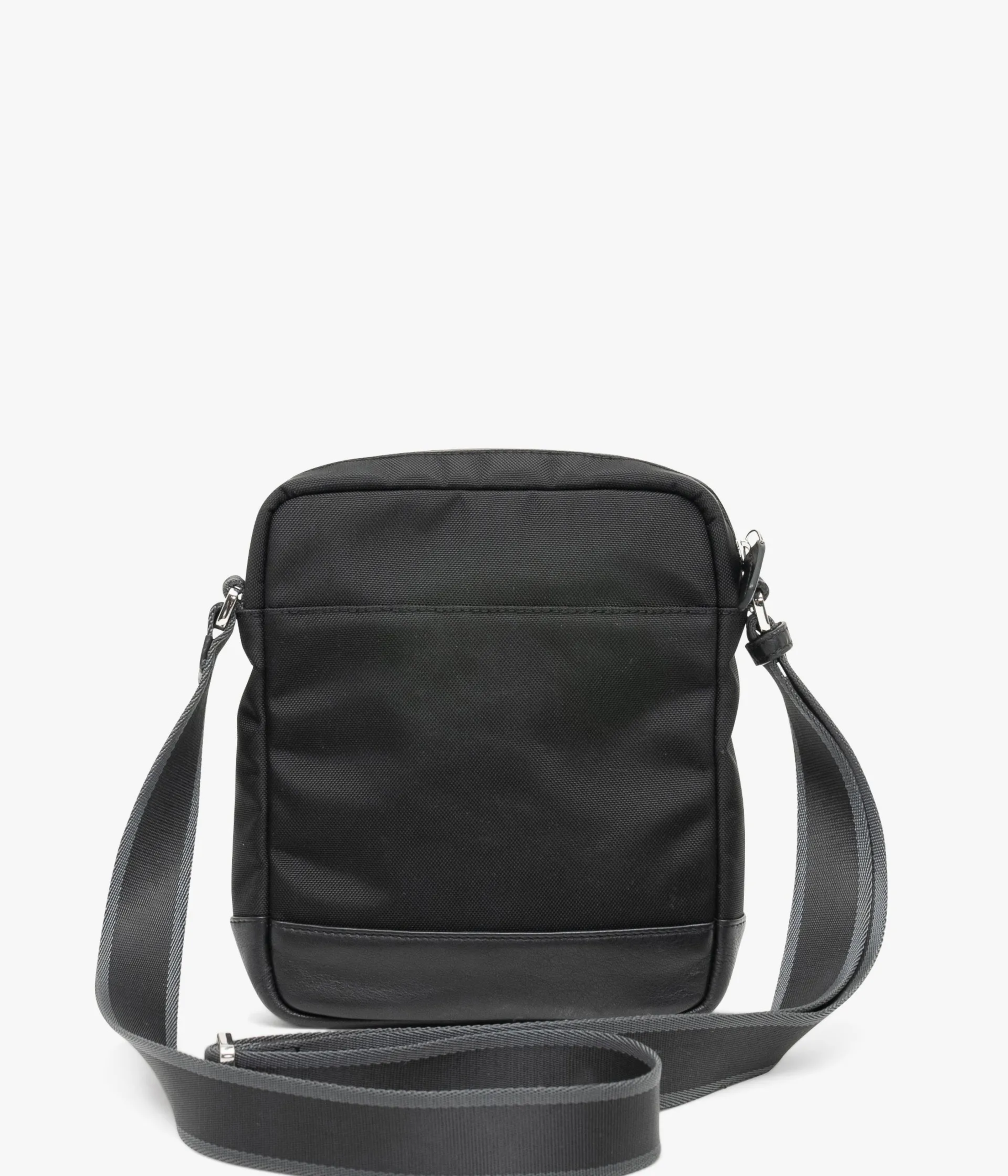 Une sacoche noire pour homme confectionnée dans une alliance de toile nylon imperméable et de cuir lisse, ornée d'un logo en métal ton sur ton. Une sacoche élégante dotée de deux compartiments zippés et de nombreux détails pratiques : deux pochettes intérieures, un compartiment pour glisser un stylo et un mousqueton permettant d’accrocher des clés. Cette pochette possède une bandoulière ajustable en longueur grâce à une boucle métallique permettant un porté épaule ou croisé. Elle est livrée dans un pochon en coton. Dimensions : H23 x L18 x P4 cm.