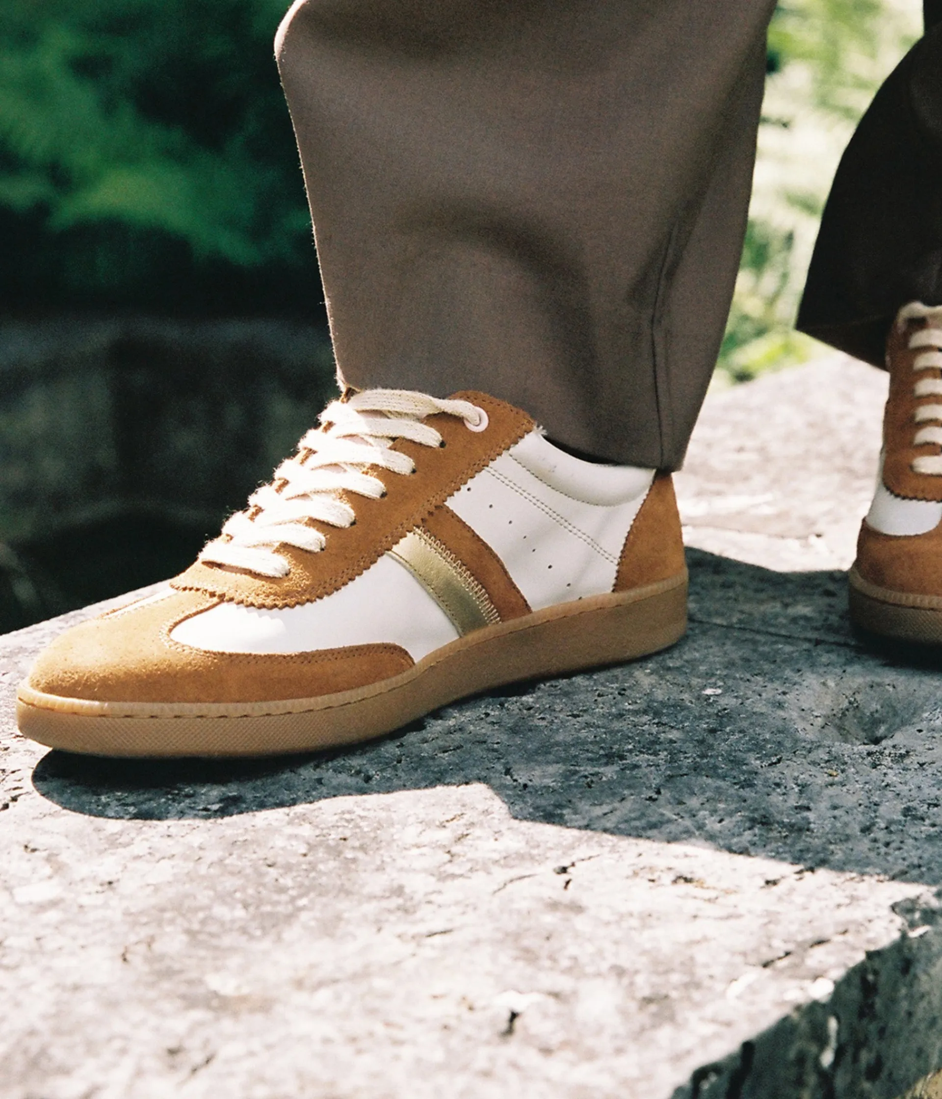 Une basket en cuir cognac et blanc fabriquée avec soin au Portugal. Une basket féminine composée d'une alliance de cuir lisse blanc et de cuir velours cognac, ponctué de touche de nude. Des empiècements en cuir métallisés doré et des lacets pailletés illuminent cette chaussure. Une sneaker non doublée pour un effet seconde peau et dotée d'une semelle intérieure en cuir moussée amovible. Elle repose sur une semelle en caoutchouc couleur miel. Cette paire bénéficie du montage Strobel et d’une semelle renforcée par un cousu latéral, gage de qualité, apportant souplesse, robustesse et durabilité. Col et languette moussés pour plus de confort.