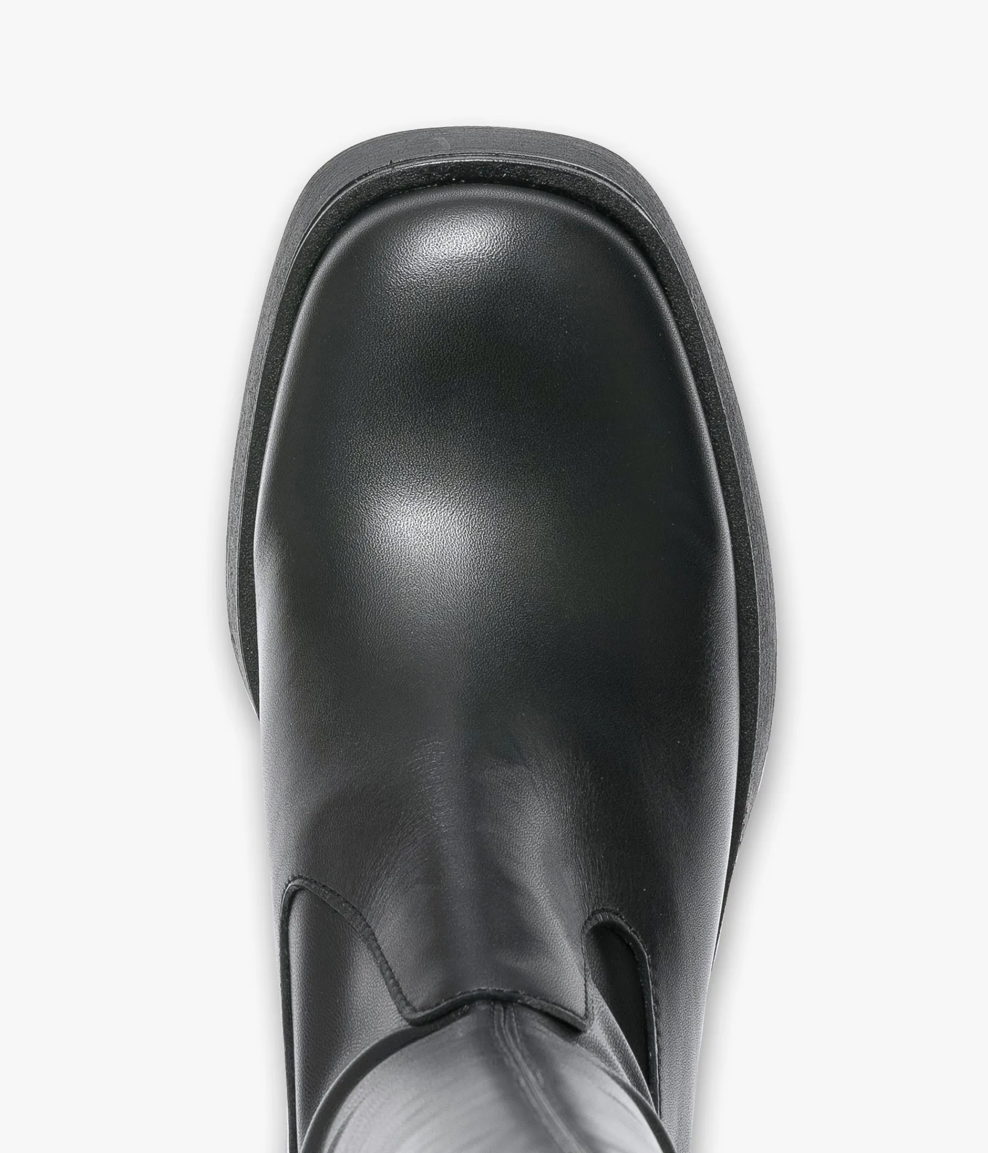 Une botte noire fabriquée avec soin dans au Portugal. Elle est fabriquée dans une alliance de cuir lisse sur le pied et de synthétique extensible sur la tige, pour un ajustement idéal au mollet. Cette botte féminine affiche une allure vintage inspirée des années 70 avec son bout carré, sa semelle plateforme et son talon imposant. Une chaussure légère, doublée cuir sur la partie pied, avec semelle intérieure cuir dotée d’une fine mousse. Largeur mollet : 33 cm.