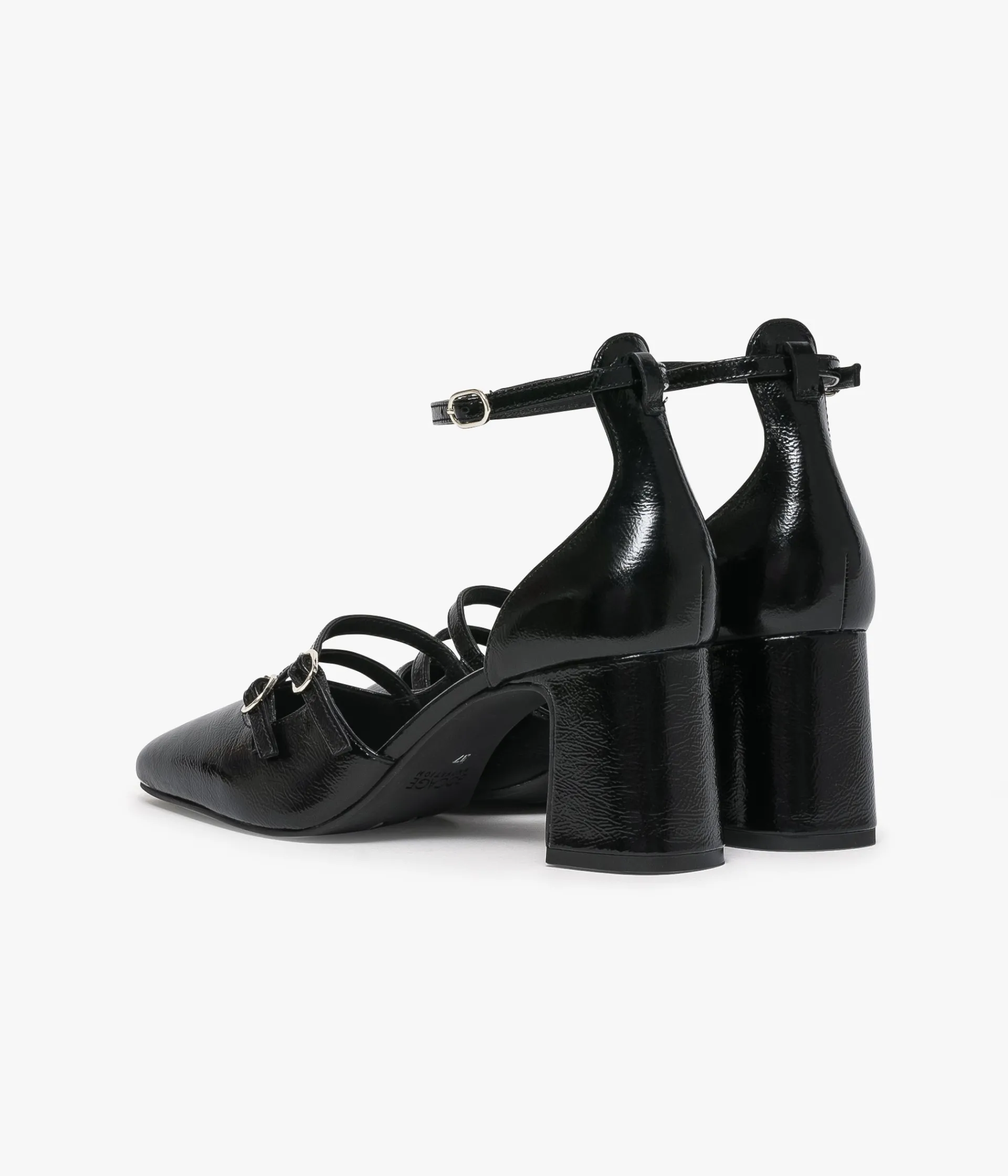 Un escarpin en cuir verni noir fabriqué avec le plus grand soin. Cette chaussure élégante sublime le pied grâce à ses élégantes brides fermées par des boucles ovales en métal doré, sur le dessus et autour de la cheville. Elle arbore une allure subtilement rétro avec son bout carré et son talon à gorge. Un escarpin entièrement doublé cuir avec semelle intérieure cuir dotée d’une fine mousse. Notre technologie Bocage Innovation vous garantit un bien-être inégalé. La semelle dissimule des élastiques qui permettent à votre chaussure de s’adapter à votre pied. Ce cuir Naplak particulièrement souple peut présenter un aspect légèrement froissé.