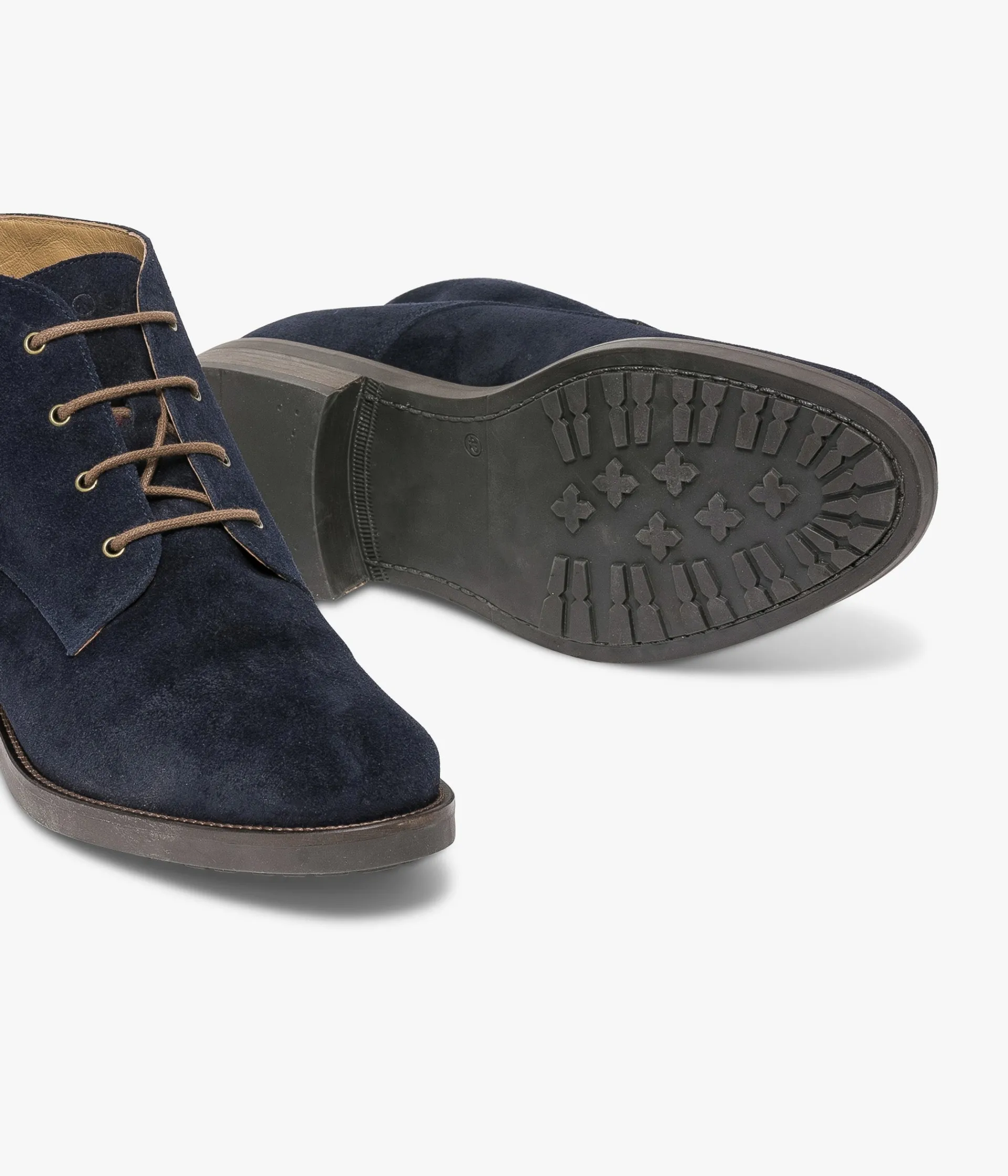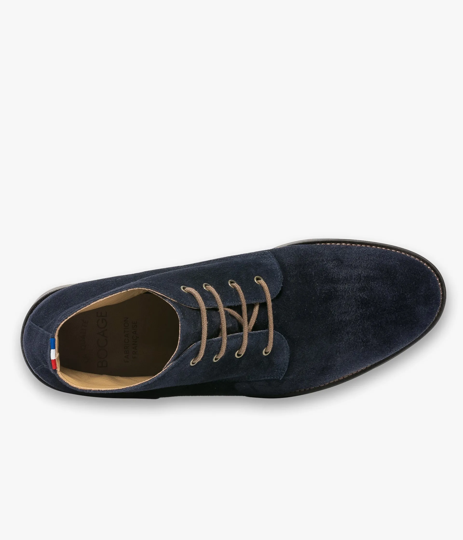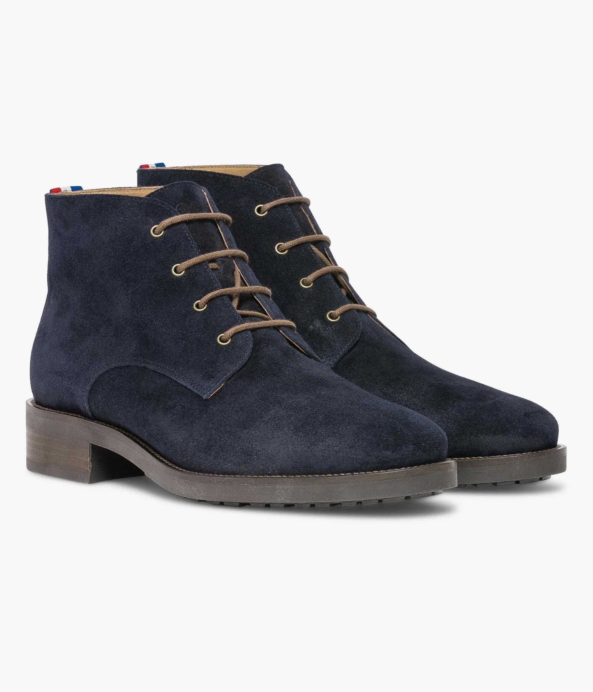 Un low-boots marine en cuir velours fabriqué avec soin dans notre propre atelier en France, au cœur du Maine et Loire (49). Une chaussure élégante avec bout amande fermée par des lacets ronds contrastants coulissant dans des œillets métalliques. Elle est agrémentée d’un petit patch tricolore au talon. Une chaussure entièrement doublée cuir avec semelle intérieure cuir amovible dotée d’une fine mousse. Elle repose sur une semelle avec patin finement cranté et trépointe cuir piquée.
