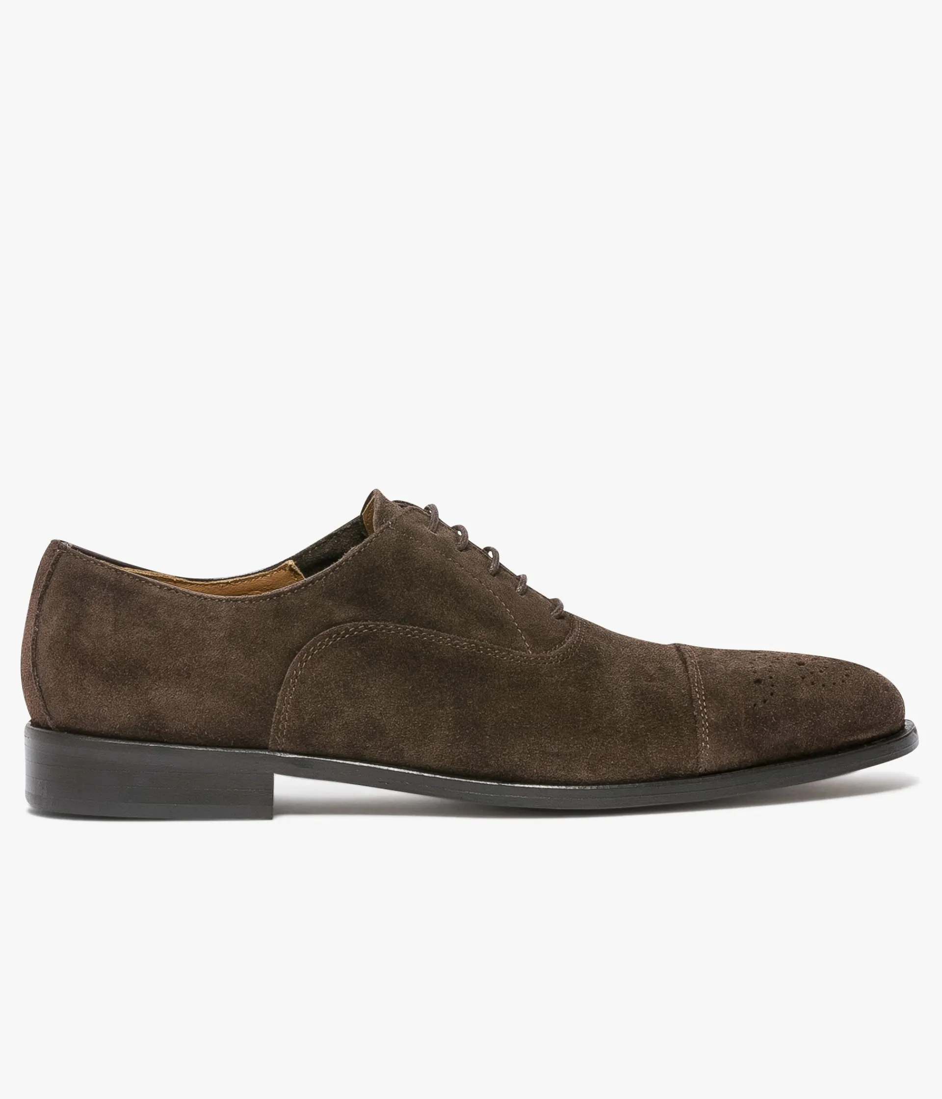 Un richelieu marron en cuir velours fabriqué avec soin dans notre atelier en Italie. Une chaussure de costume très élégante avec son bout amande, sa ligne effilée et son bout fleuri. Cette paire repose sur une semelle en cuir et bénéficie du cousu Blake, une couture unique prenant, à la fois, la semelle intérieure, la semelle extérieure et la tige de la chaussure. Ce montage est apprécié pour la finesse de la semelle. Une chaussure entièrement doublée cuir avec semelle intérieure cuir dotée d’une fine mousse. A noter la petite entaille dans le talon qui empêche l’ourlet du pantalon de s’accrocher à la chaussure.