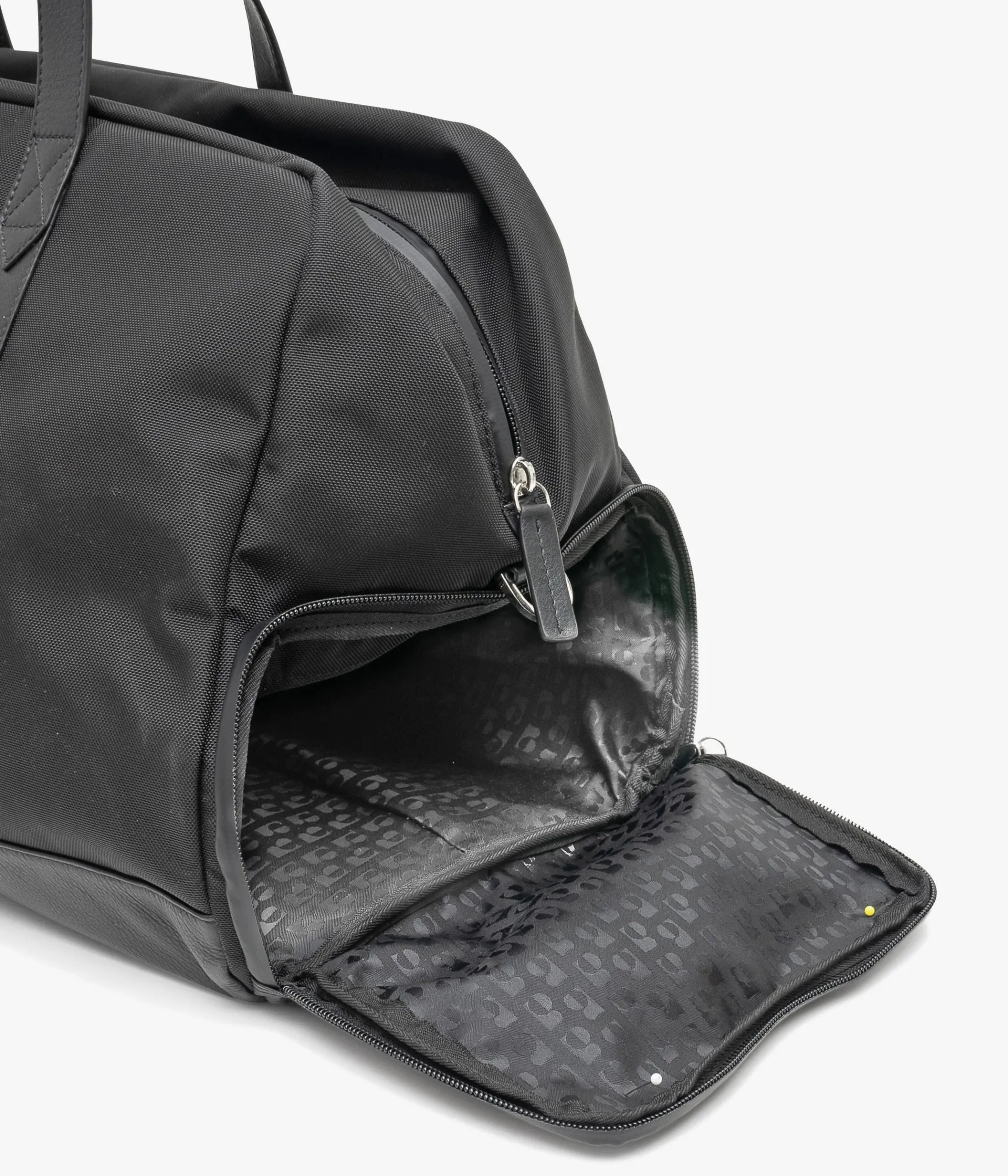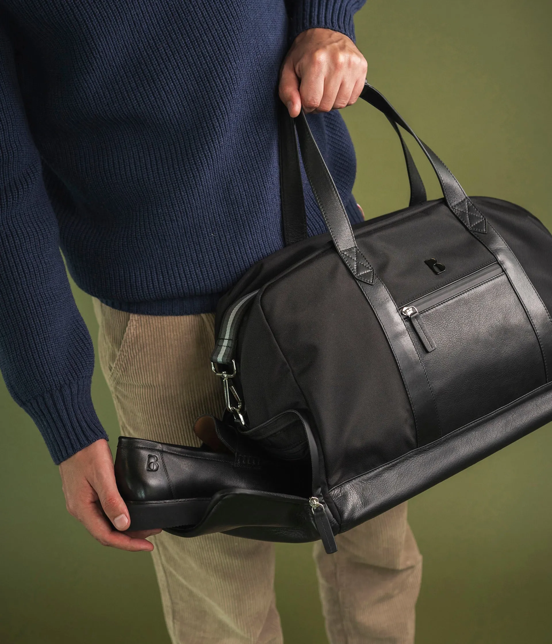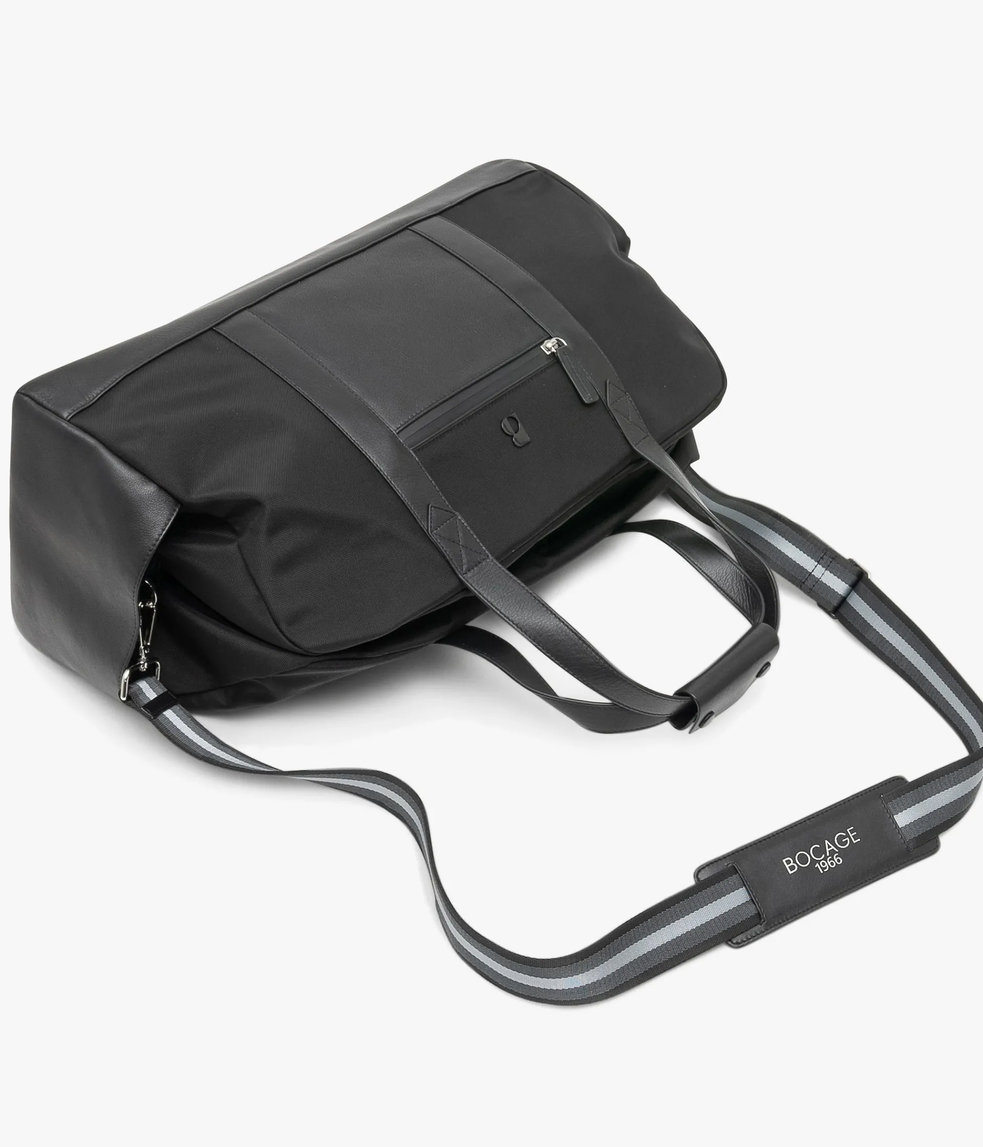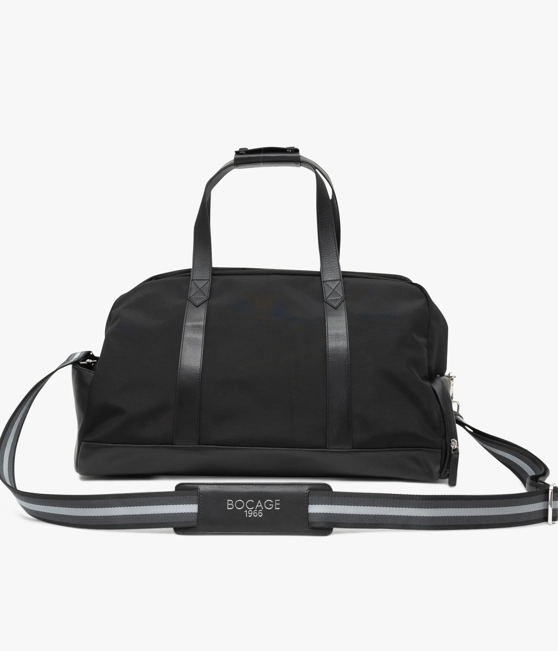 Un sac de voyage 24h-48h noir composé d’une alliance de toile nylon déperlante et de cuir lisse. Etudié pour les courts déplacements, il affiche un format idéal et offre un système de rangement astucieux grâce à un double fond zippé permettant de créer un espace distinct pour les chaussures accessible depuis le côté du sac. Ce sac de voyage se ferme par zip hermétique à double curseur et se porte à la main grâce deux anses en cuir ou sur l’épaule à l’aide de la bandoulière amovible. Des bandes protectrices recouvertes de cuir permettent de protéger le fond du sac. Un joli sac livré dans un pochon en coton. Dimensions : H30 x L50 x P20 cm.