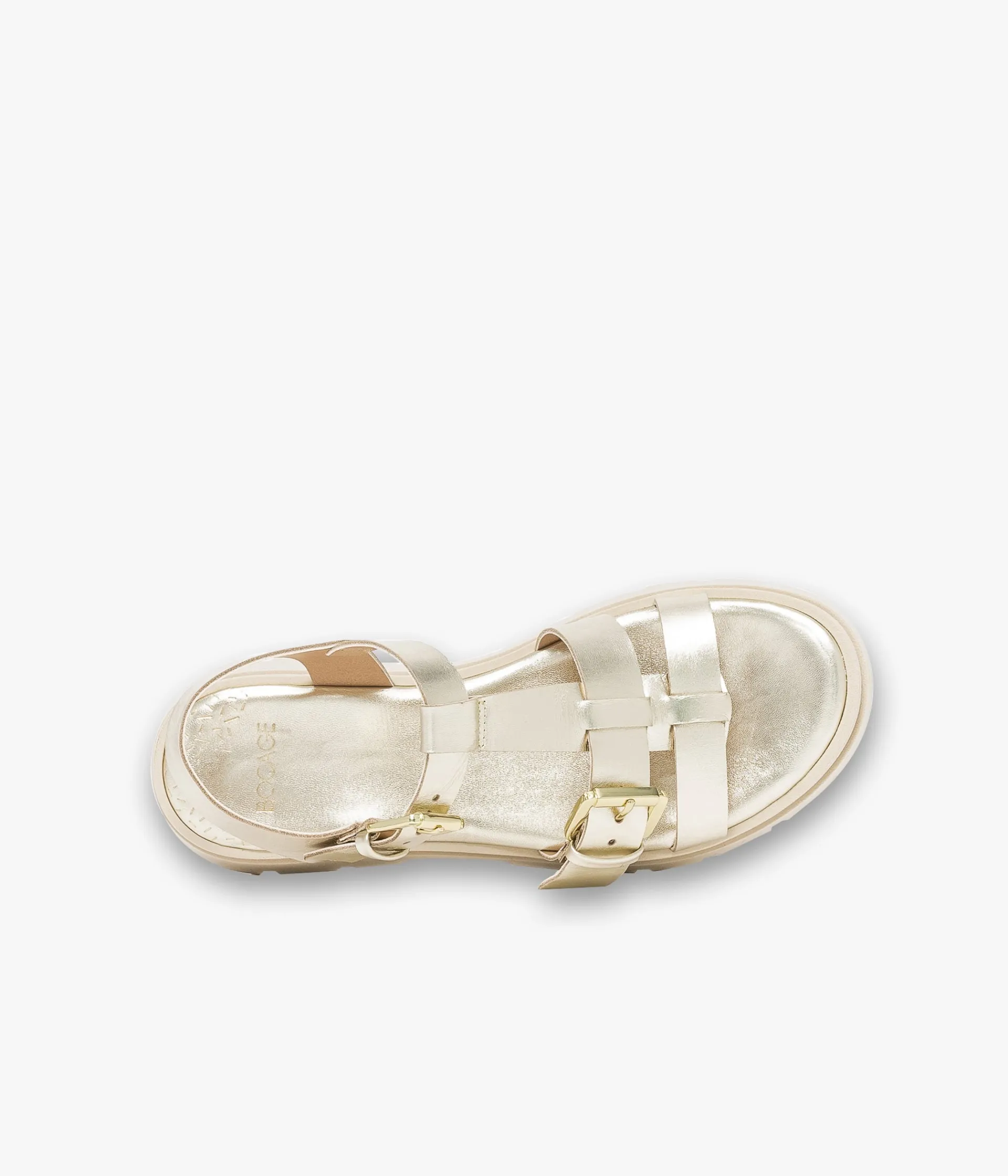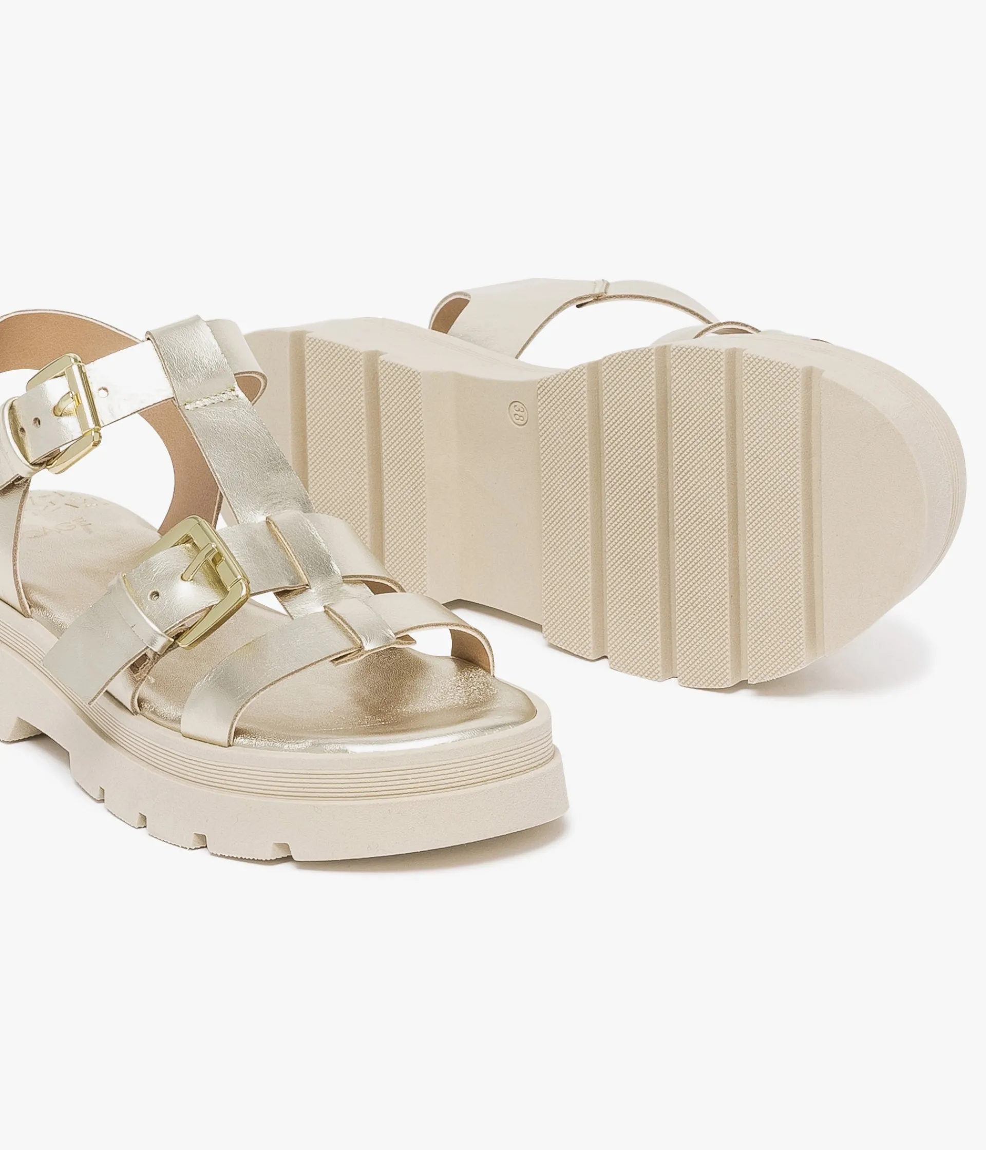 Une sandale dorée en cuir fabriquée avec soin dans notre atelier en Italie. Une chaussure forme Salomé qui offre un parfait maintien grâce à son jeu de brides et s’ajuste par deux boucles dorées. Elle repose sur une épaisse semelle crantée avec semelle intérieure cuir ultra confortable.