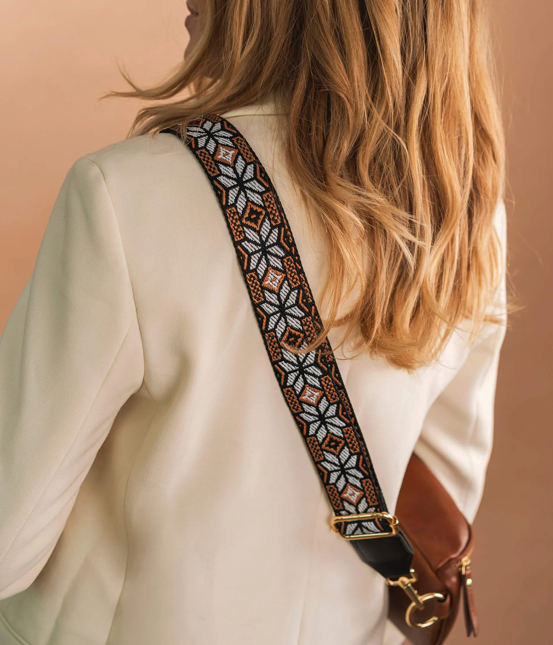 Cette bandoulière de sac à motifs ethniques noir, blanc et marron, apportera une touche tendance à vos sacs. Confectionnée dans une toile ultra résistante, elle se fixe grâce à des mousquetons dorés sur tous vos sacs à main, sacs de voyage et pochettes d’ordinateur. Bandoulière ajustable en longueur. Largeur 3,5 cm. Longueur max : 134 cm.