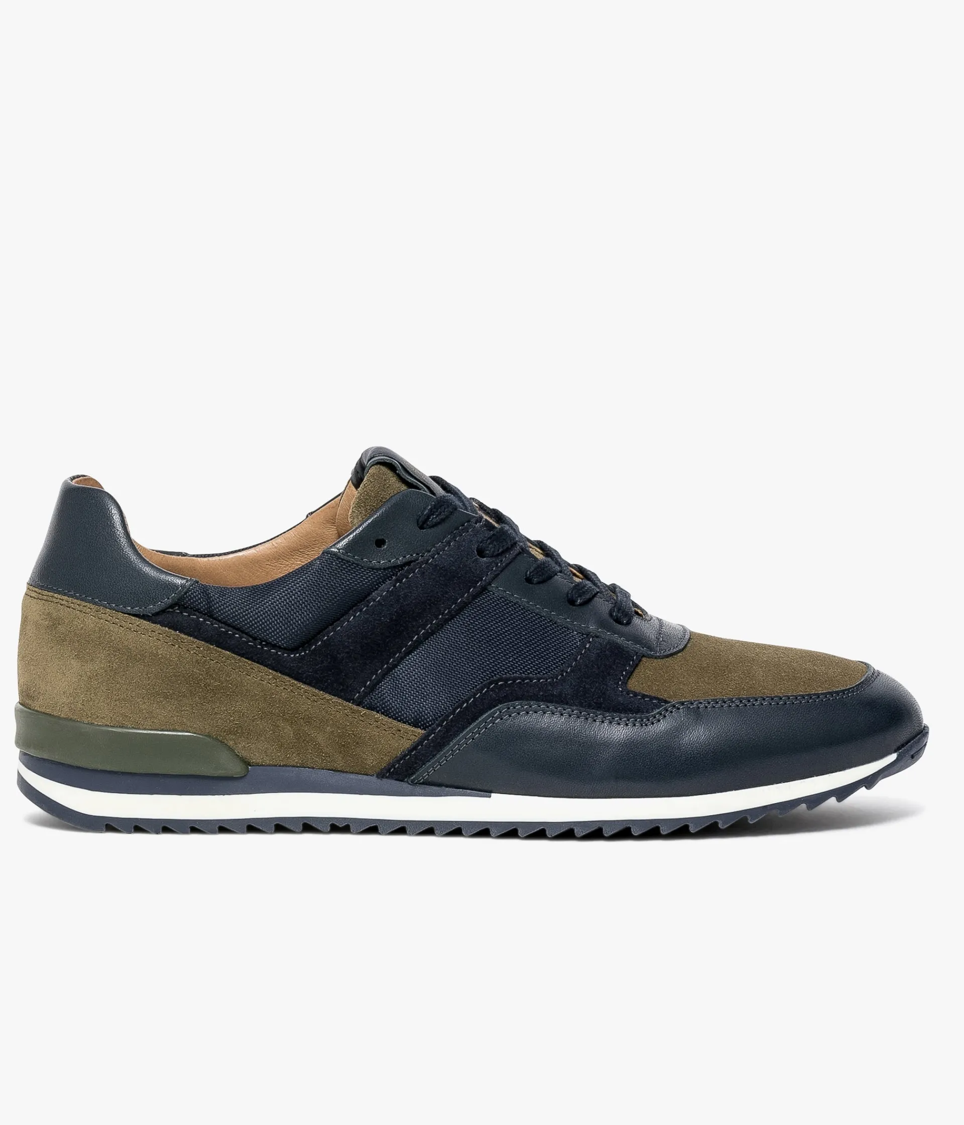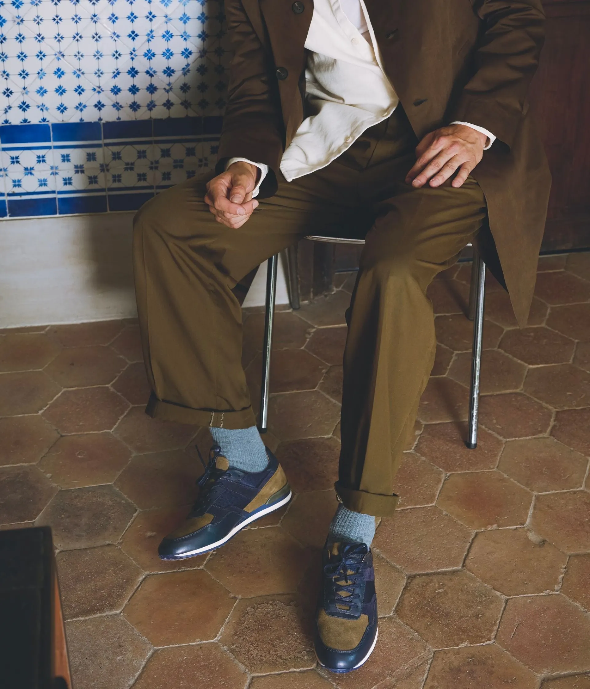 Une basket marine fabriquée avec soin dans notre atelier au Portugal, dans une alliance de cuir lisse, de cuir velours et de textile. Son allure sportive est boostée par des touches de velours kaki. Une chaussure entièrement doublée cuir avec semelle intérieure cuir amovible ultra confortable. Elle repose sur une semelle en caoutchouc blanche avec couche d’usure crantée marine. Col et languette rembourrés pour plus de confort.