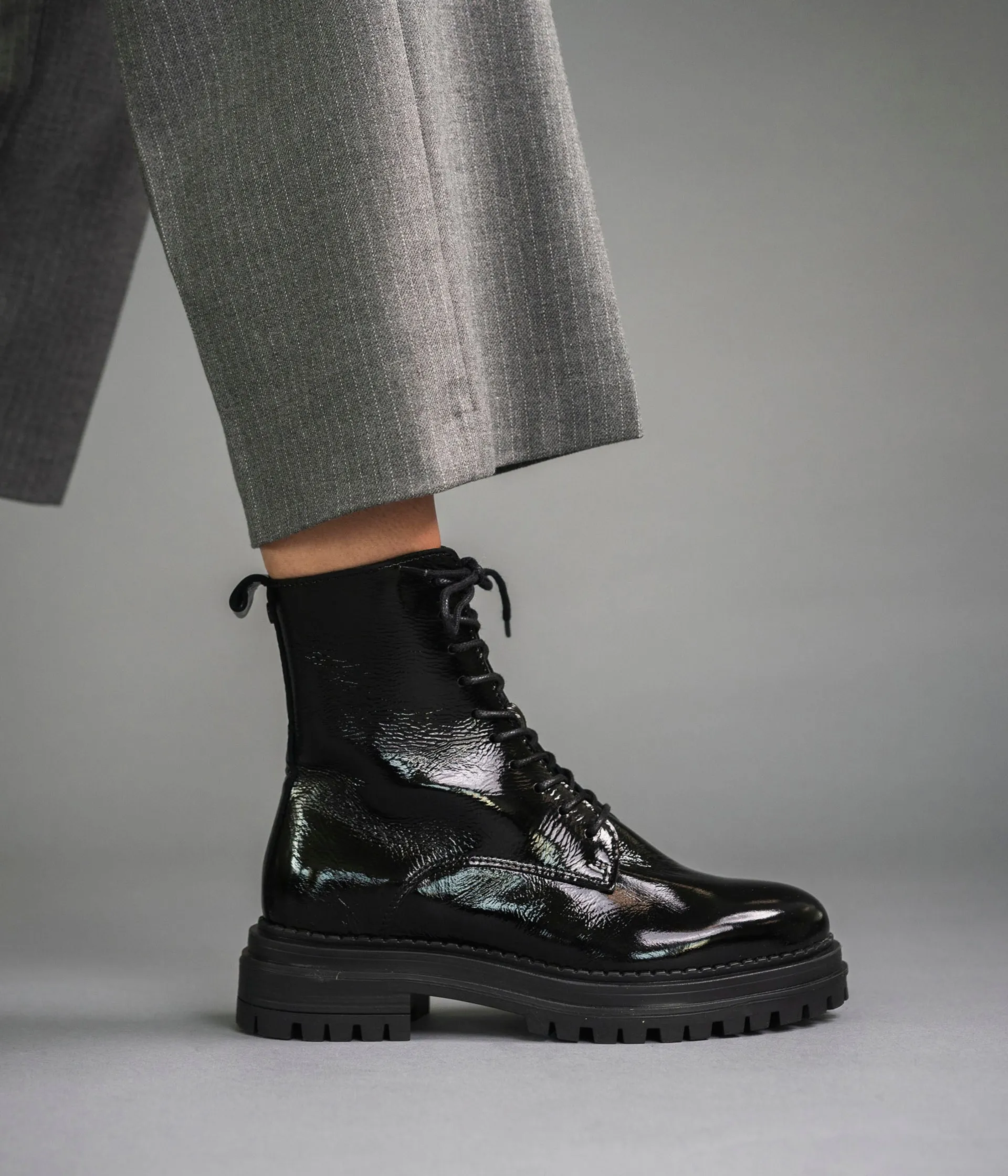 Un boots noir en cuir verni fabriqué avec soin au Portugal. Un boots aux accents Glam'rock, avec sa ligne effilée et son épaisse semelle crantée. Il possède un système de laçage pour s’ajuster à chaque morphologie et se ferme facilement par zip intérieur. A noter, sa tirette à l'arrière du pied qui facilite le chaussant. Une bottine entièrement doublée cuir avec semelle intérieure cuir. Semelle 3 cm.