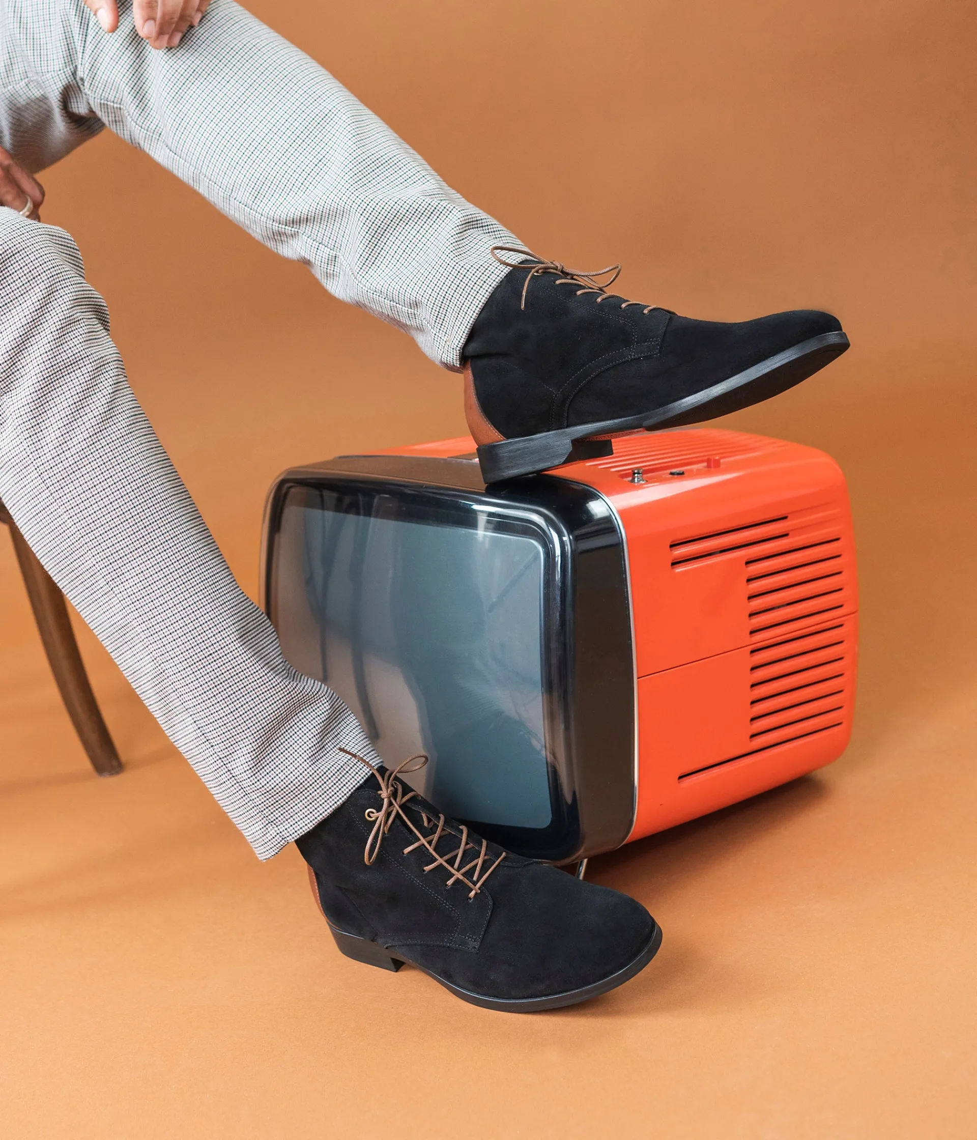 Boot noir en cuir velours avec lacets marron. Ce boots en cuir velours noir fait partie des indispensables du vestiaire citadin. Un boots à bout amande agrémenté d’un empiècement en cuir lisse cognac au talon et rehaussé d’un lacet marron. Cette bottine possède une tige non doublée pour s’adapter parfaitement à la cheville et offrir un maximum de confort. Elle est posée sur une semelle en cuir protégée par un patin avec talon de 2 cm. A noter la petite entaille dans le talon qui empêche l’ourlet du pantalon de s’accrocher à la chaussure. Chaussure fabriquée en France. Talon 2 cm. Tige 13 cm. Ces boots apportent une touche casual chic à tous les looks.