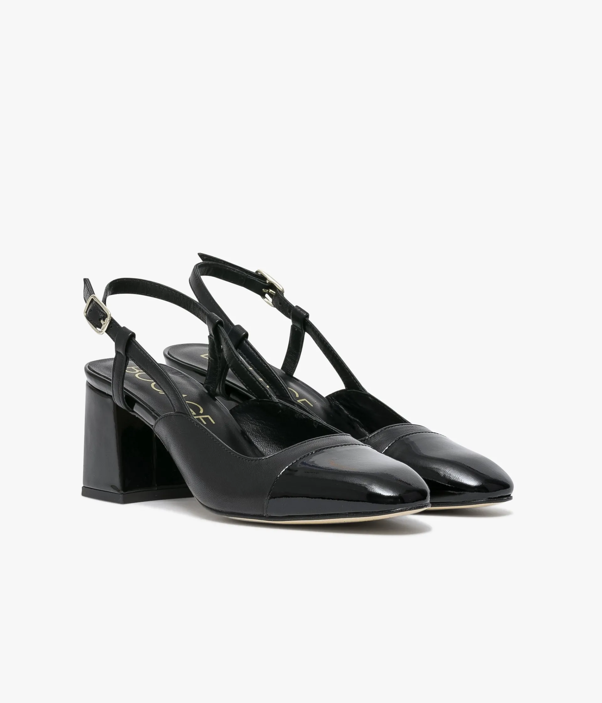 Un escarpin sling-back en cuir noir fabriqué avec soin au Portugal. Une chaussure de cérémonie en cuir lisse rehaussée de cuir verni sur le bout et le talon. Le décolleté carré et les fines brides au talon assurent à cet escarpin une allure particulièrement élégante. Une chaussure entièrement doublée cuir avec semelle intérieure cuir dotée d’une fine mousse. Fermeture par fine boucle dorée.