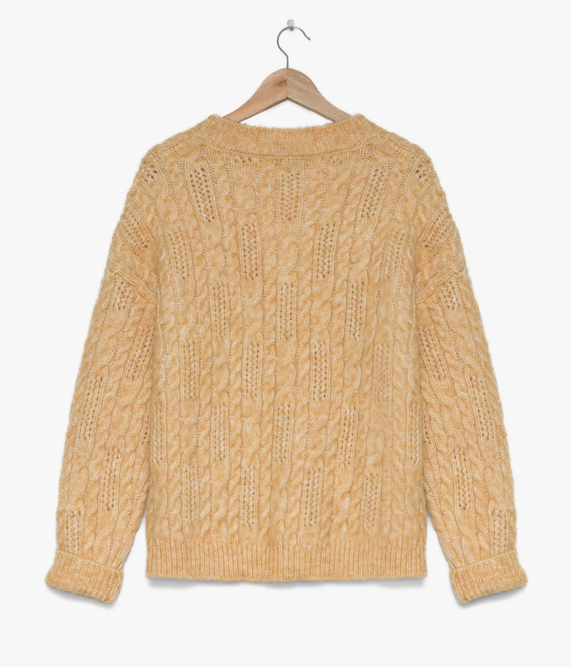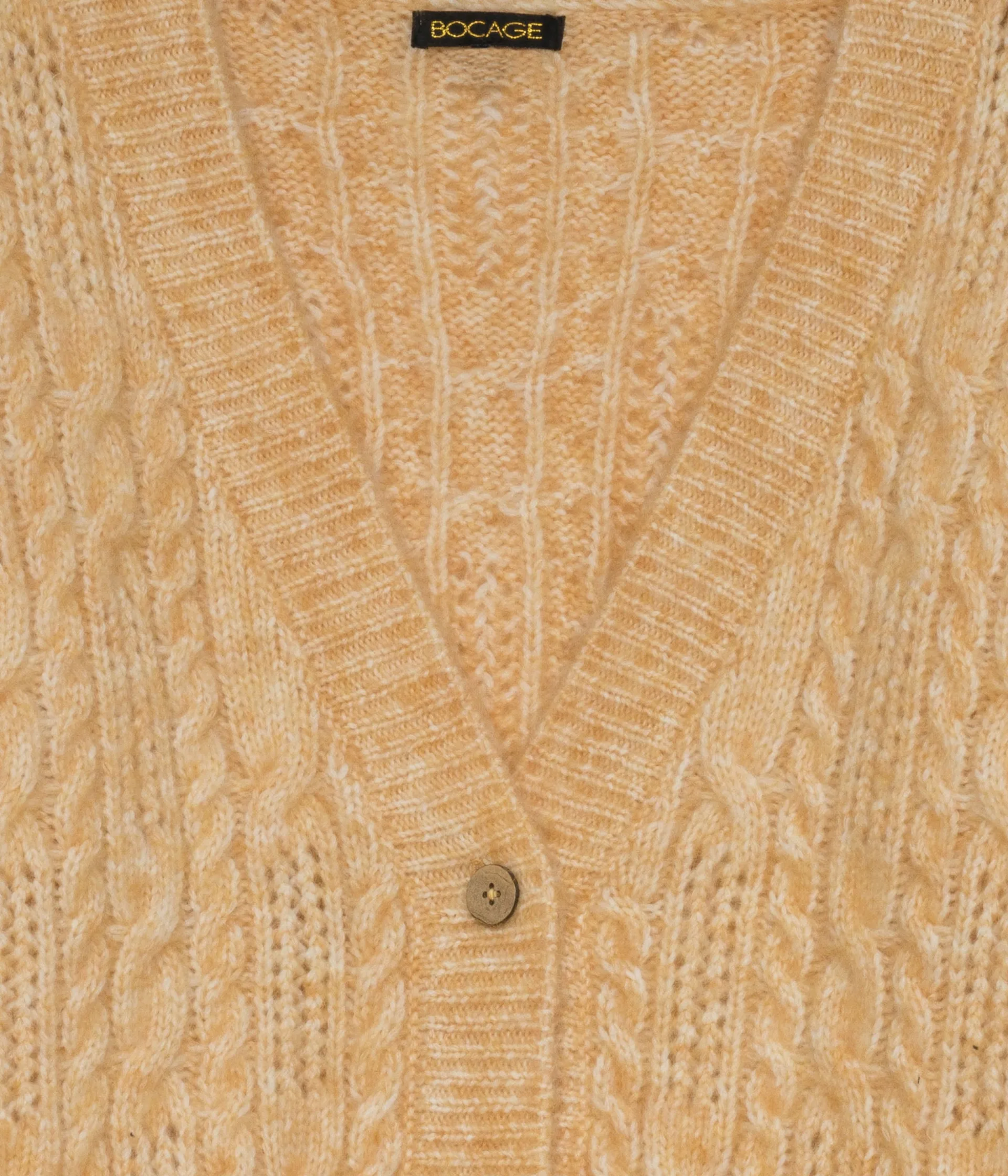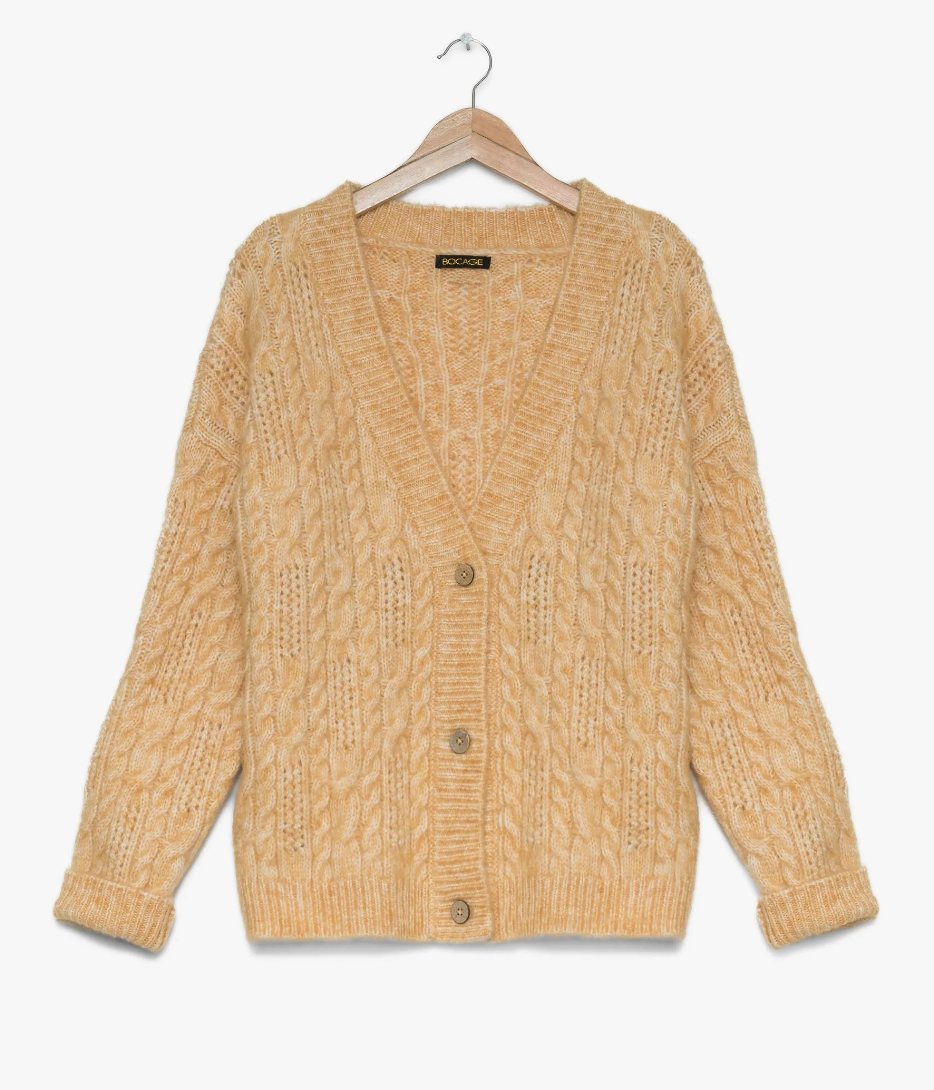 Un gilet jaune en maille torsadée particulièrement confortable grâce à sa coupe ample et ses épaules tombantes. Ce gilet à col V est confectionné dans une grosse maille contenant 30% de laine pour offrir plus de chaleur. Il se ferme par trois boutons aspect bois. Finitions bord-côte. Longueur : 60 cm. Disponible en 2 tailles.