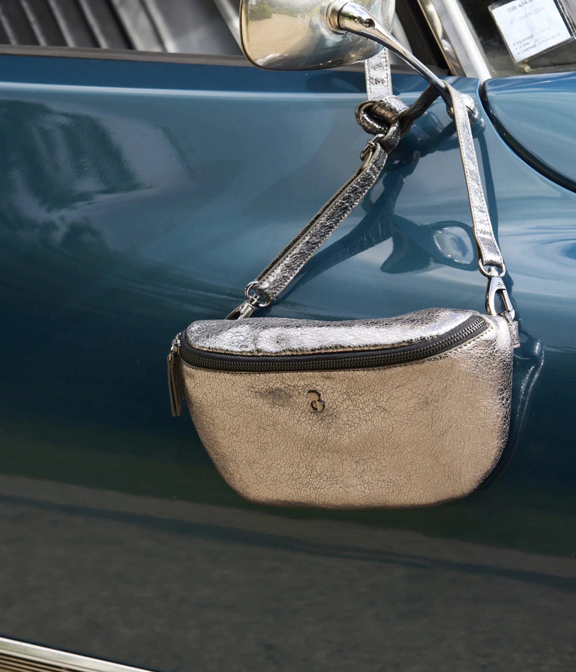 Un sac banane argent en cuir métallisé effet craquelé fabriqué avec soin en Inde. Une banane ornée d’un logo sur le devant, entièrement doublée coton. Elle offre un compartiment finement rembourré, une pochette intérieure et une poche zippée au dos. Elle se porte croisée grâce à une bandoulière ajustable en longueur, fixée par des mousquetons argentés. Amovible, la bandoulière peut être remplacée par une bandoulière fantaisie de notre collection. Fermeture zippée à double curseur. Sac banane livré dans un pochon en coton.