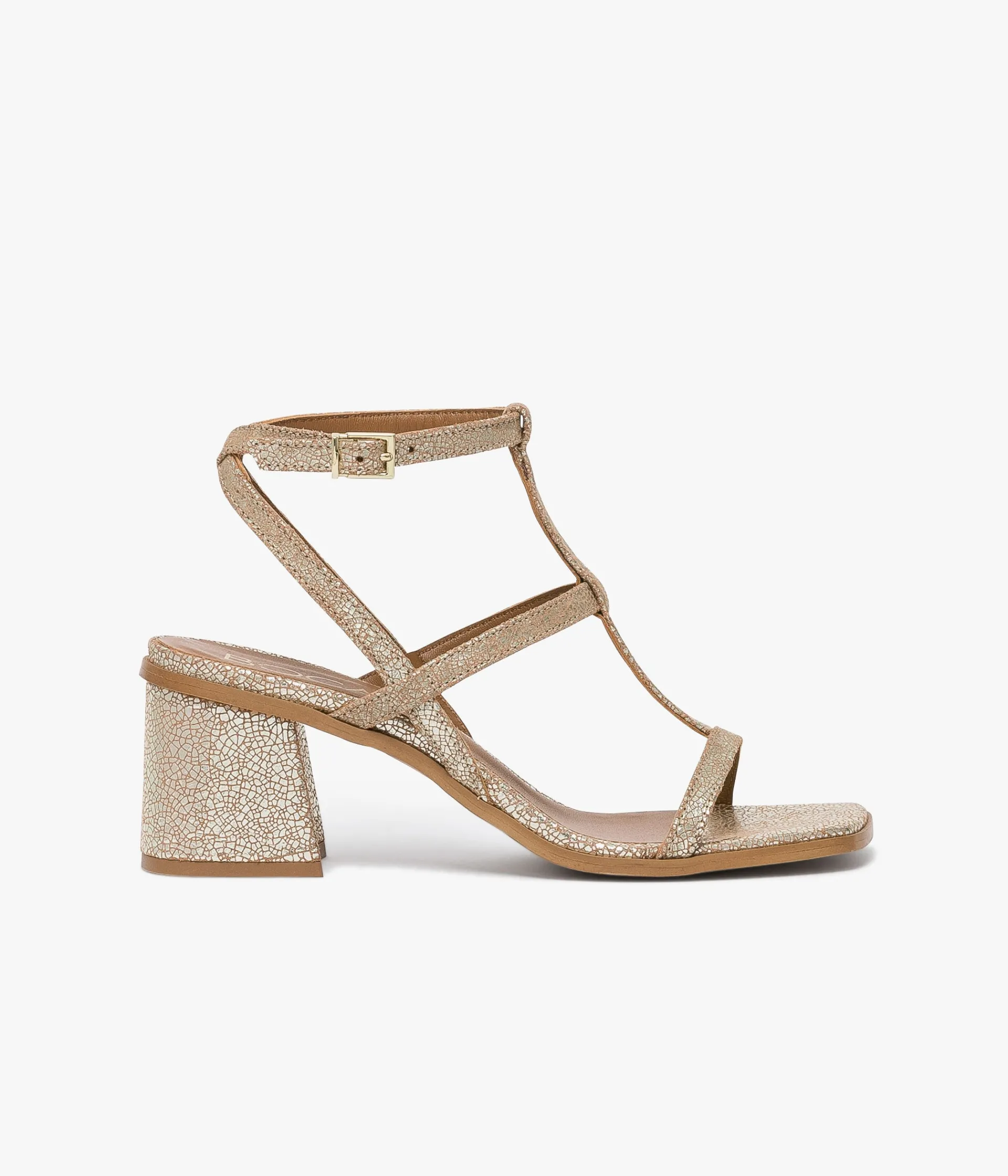 Une sandale en cuir métallisé platine aspect craquelé fabriquée avec le plus grand soin. Avec ses fines brides mobiles, cette chaussure forme Salomé affiche une ligné épurée. La bride autour de la cheville se ferme par une petite boucle dorée dissimulant un élastique. Cette sandale scintillante est entièrement doublée cuir et possède une semelle intérieure cuir dotée d’une fine mousse. Inspirée des 70’s, elle repose sur une fine semelle à bout carré avec talon flare enrobé positionné en retrait.