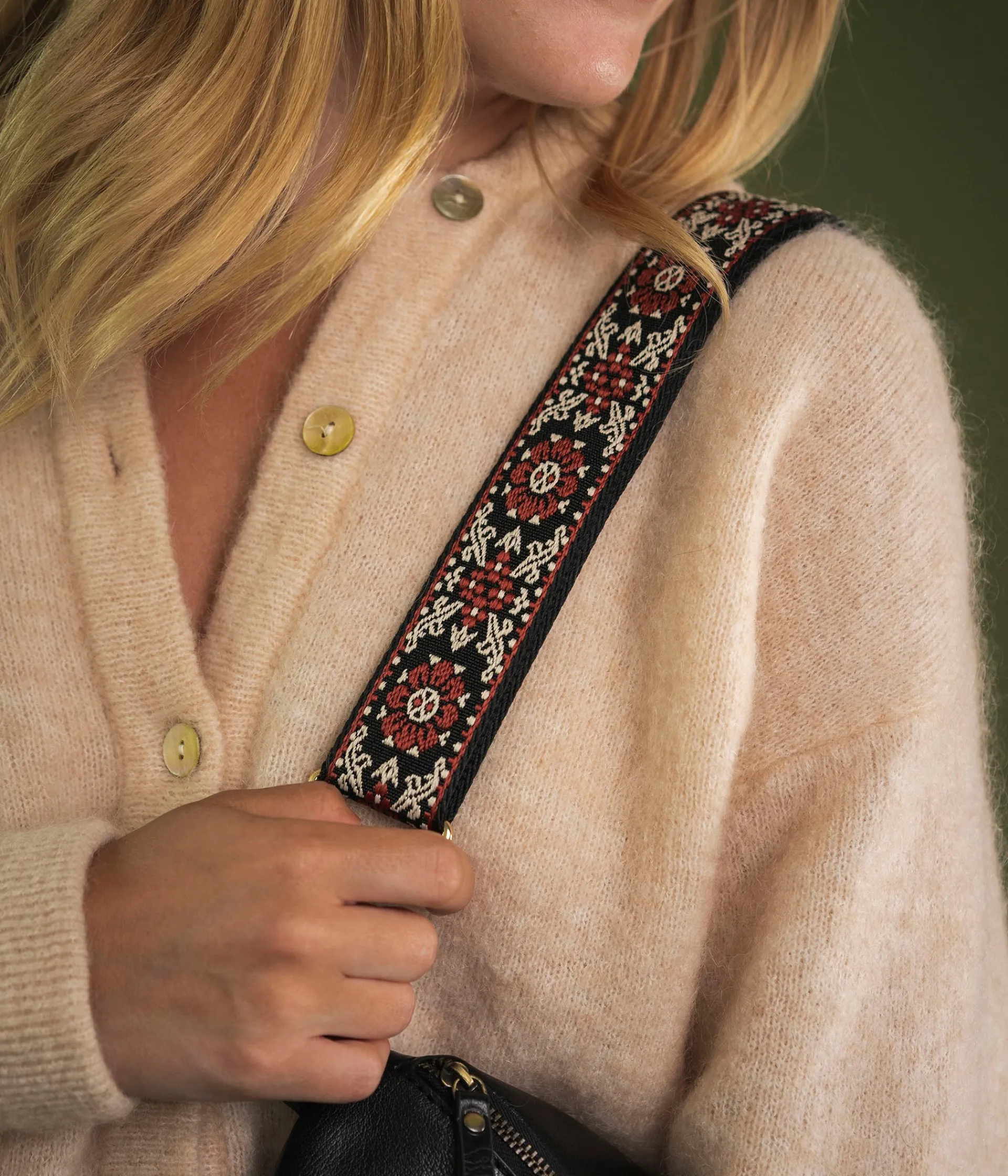 Une bandoulière de sac noir ornée de motifs brodés rouge et écru aux accents ethniques. Cette bandoulière amovible possède des mousquetons dorés à chaque extrémité pour s’adapter sur tous les sacs à main ou sacs banane auxquels elle ajoutera une touche bohème chic. Elle est ajustable en longueur grâce à une boucle. Largeur 4 cm