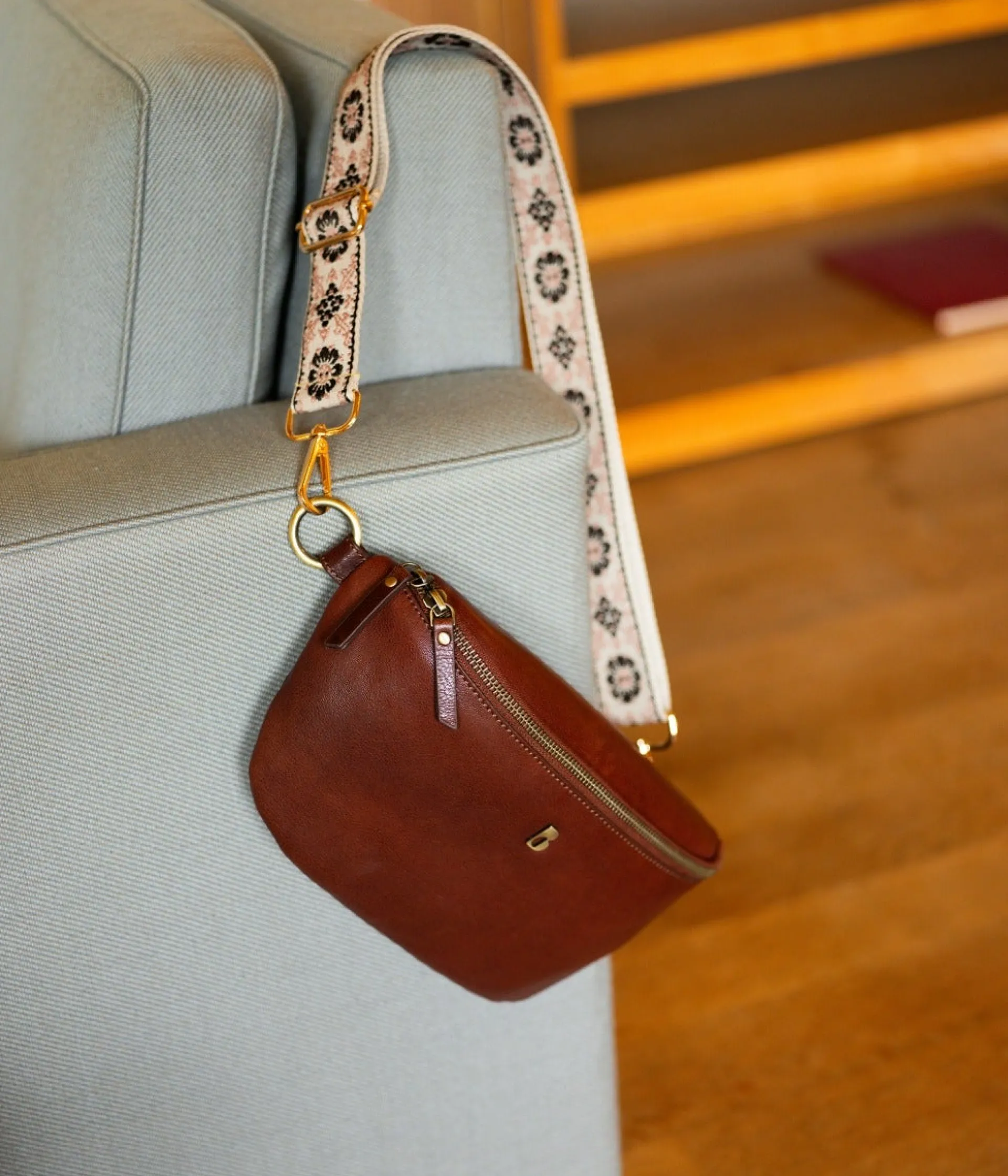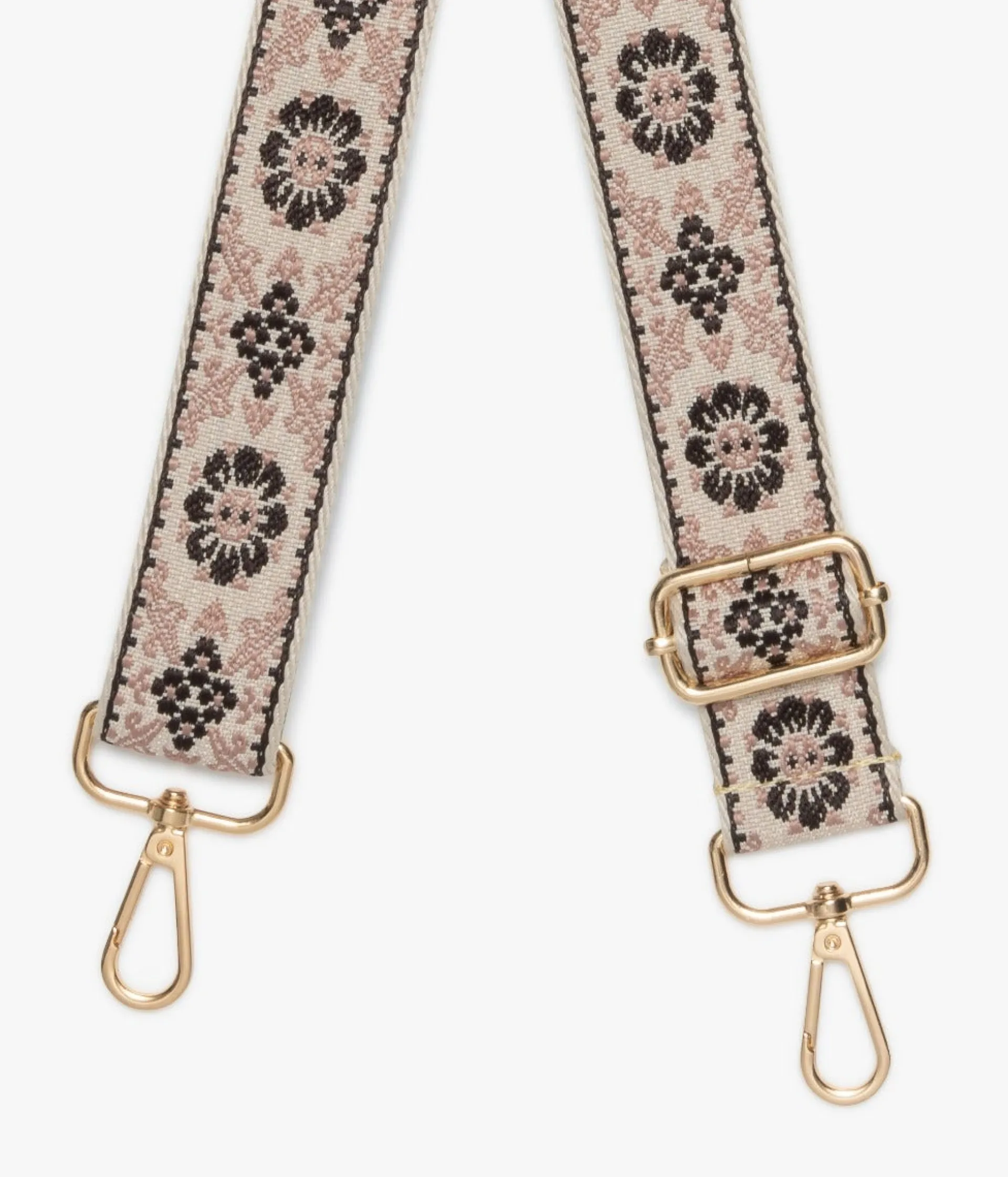 Une bandoulière de sac beige ornée de motifs brodés marron et rose aux accents ethniques. Cette bandoulière amovible possède des mousquetons dorés à chaque extrémité pour s’adapter sur tous les sacs à main ou sacs banane auxquels elle ajoutera une touche bohème chic. Elle est ajustable en longueur grâce à une boucle. Largeur 4 cm.