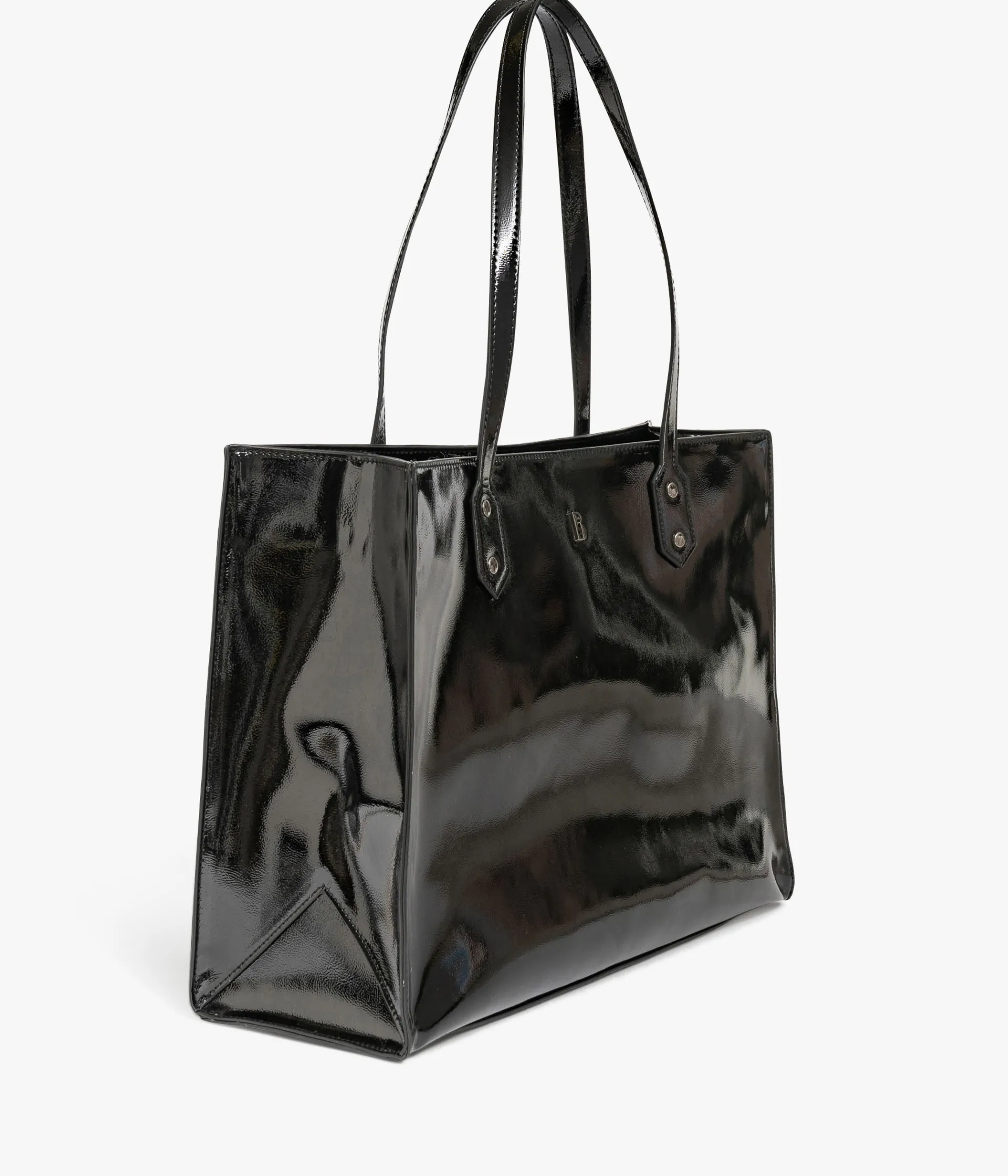 Un sublime sac cabas en matière vernie orné d’un logo métallique argenté et de clous assortis sur les pattes de fixation des anses. Ce sac rectangle possède un grand compartiment, une poche plaquée et une pochette zippée. Son fond rigide, protégé par des clous métalliques, lui assure une parfaite tenue. Il se ferme par zip sur le dessus pour une meilleure protection de vos affaires personnelles. Dimensions : H28*L39*P12 cm.