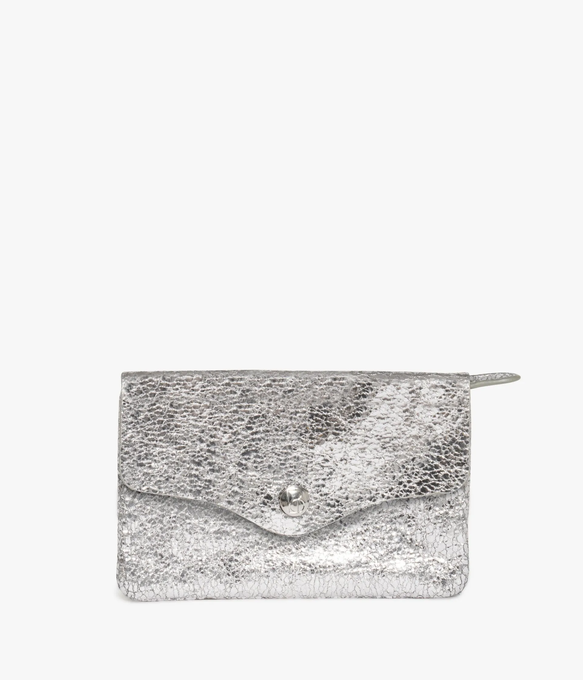 Un portefeuille en cuir métallisé argenté effet craquelé. Il se compose de deux grands compartiments dont un zippé, qui permettent de ranger tous vos papiers d’identité, vos cartes de crédit et votre monnaie. Il se ferme grâce à un rabat avec bouton pression orné d’un logo. Un portefeuille ultra chic à glisser dans un sac à main ou à porter à la main comme pochette de soirée. Doublure coton. Livré dans une pochette en coton. Dimensions : H10 x L15,5 x P2 cm.