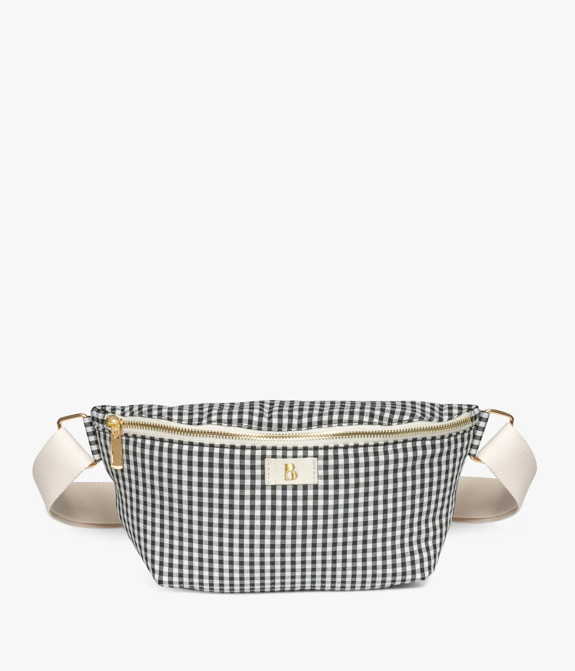 Un sac banane en toile de coton à motif vichy noir et blanc. Une banane entièrement doublée et légèrement matelassée, offrant un grand compartiment, une pochette intérieure zippée et une autre poche zippée au dos. Pratique et tendance, elle se porte croisée grâce à une bandoulière ajustable en longueur, fixée par de grosses boucles dorées. Elle est ornée d’une étiquette avec logo brodé en doré sur l’avant.