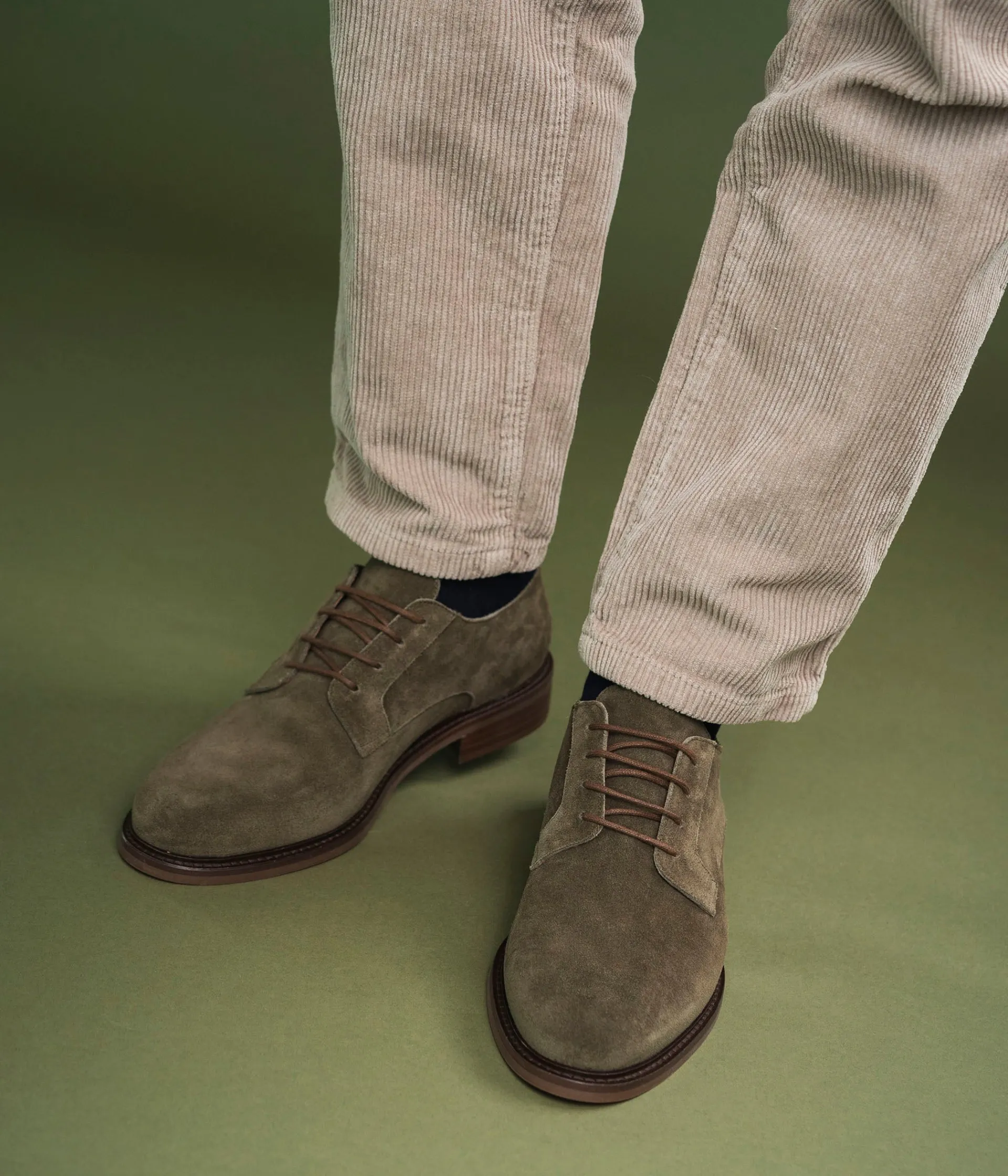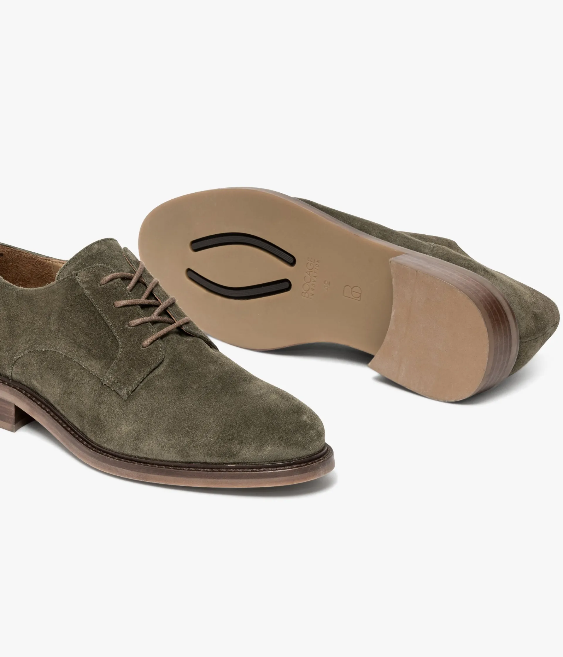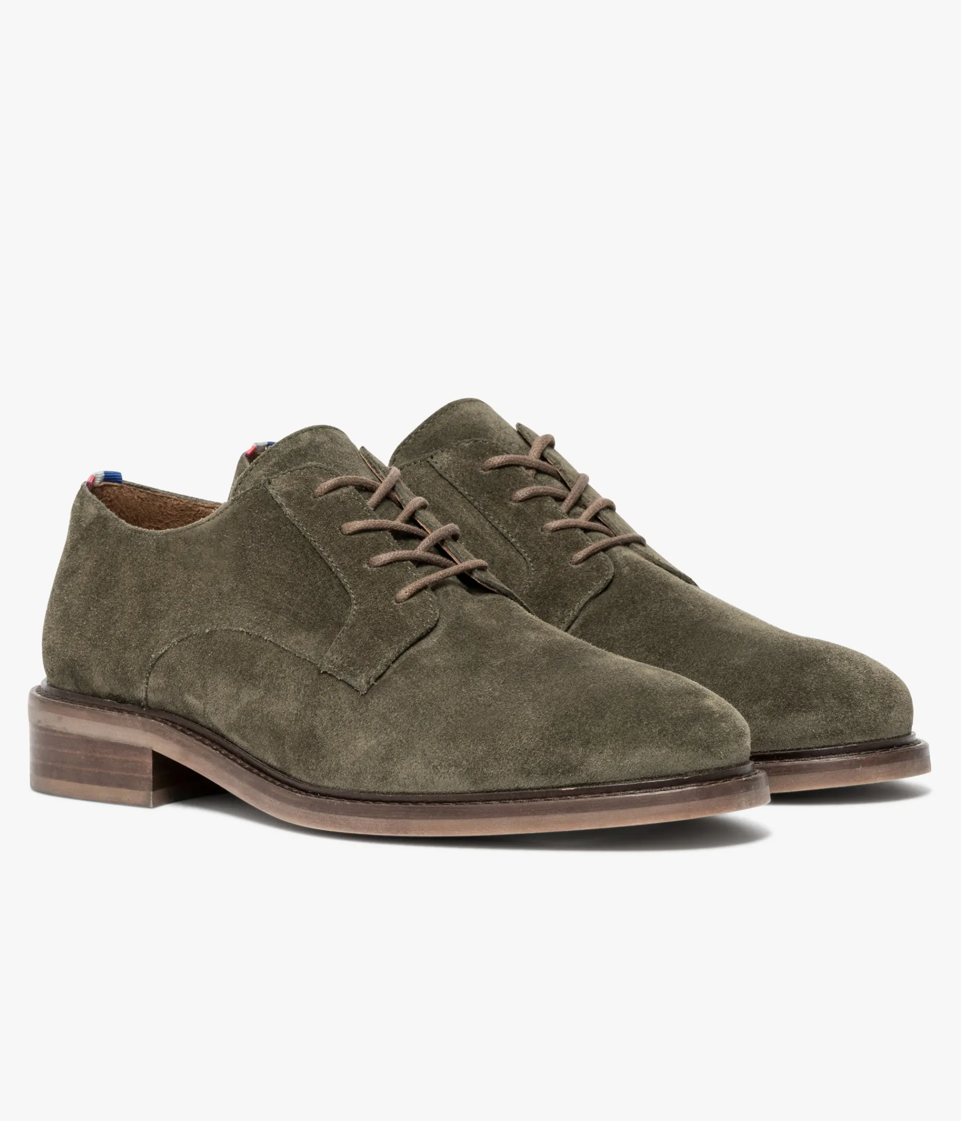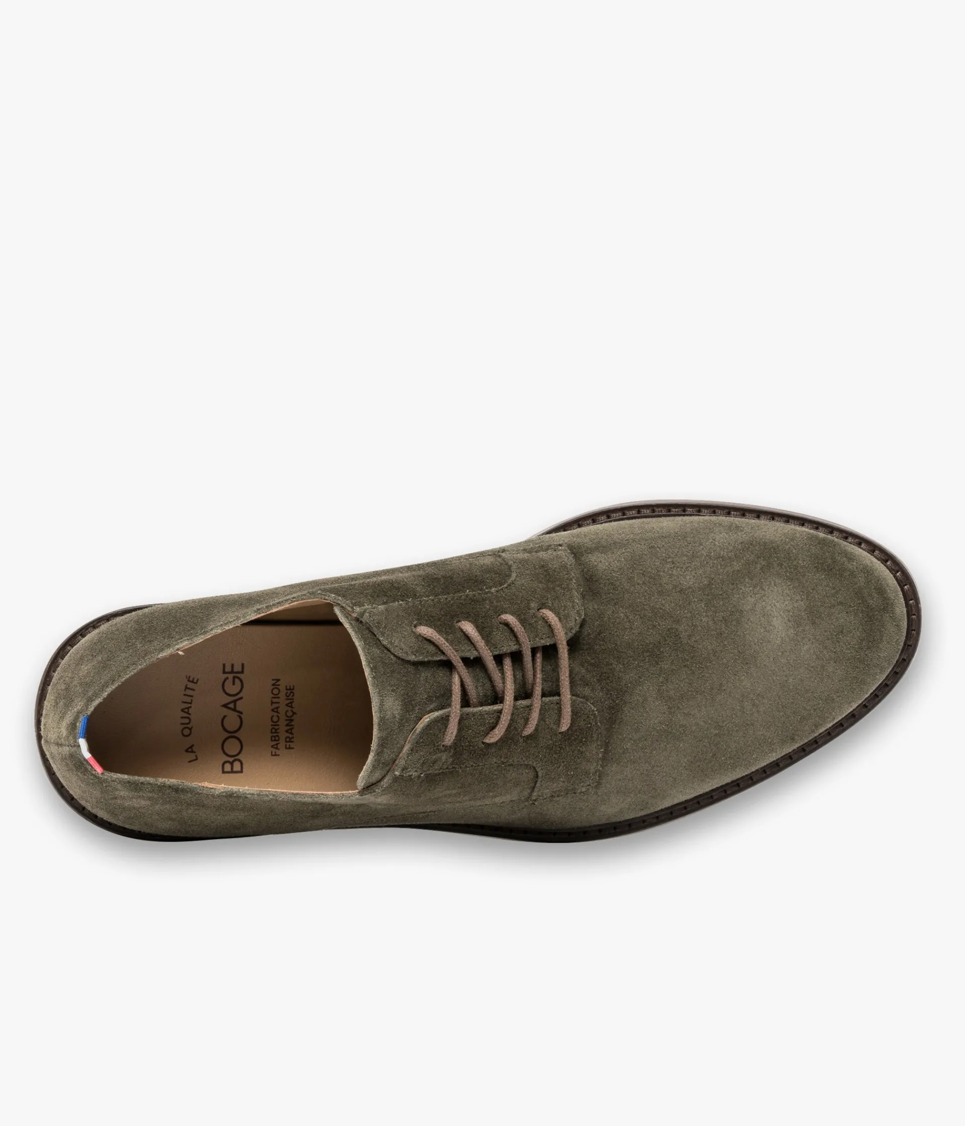 Un derby kaki en cuir velours fabriqué avec soin dans notre propre atelier en France, au cœur du Maine et Loire (49). Une chaussure élégante qui compte parmi les essentiels du vestiaire masculin. Elle se ferme grâce à des lacets ronds et repose sur une semelle avec trépointe cuir piquée. Notre technologie Bocage Innovation vous garantit un bien-être inégalé. La semelle dissimule des élastiques qui permettent à votre chaussure de s’adapter à votre pied. Une chaussure entièrement doublée cuir avec semelle intérieure cuir dotée d’une fine mousse. Petit drapeau tricolore au talon.