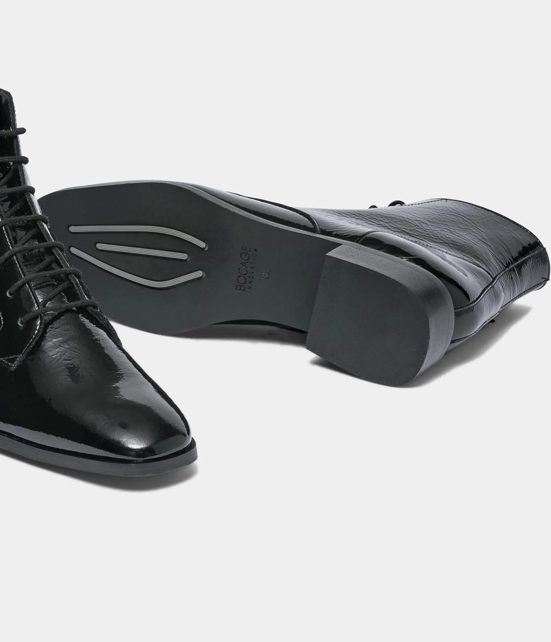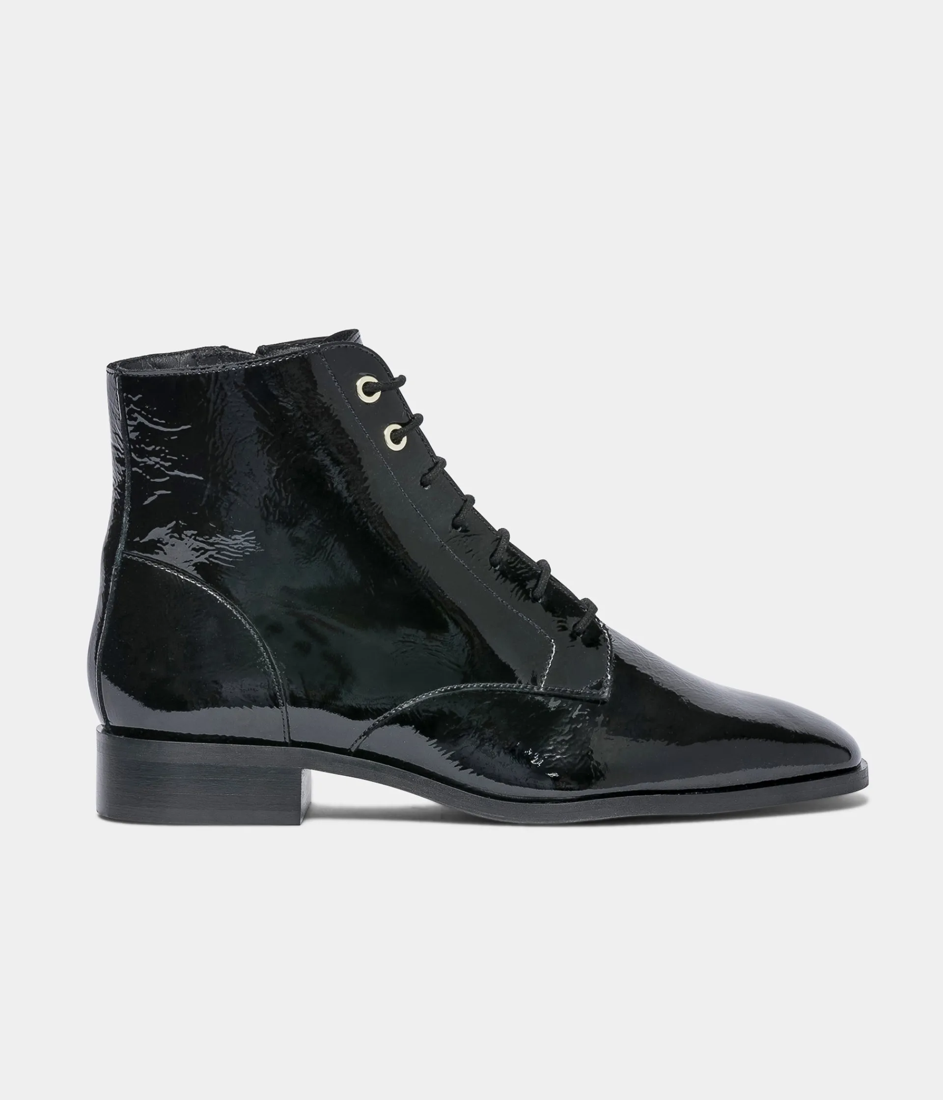 Low-boots noir en cuir verni. Ce low-boots noir séduit pour son allure très féminine avec son dessus en cuir verni, sa silhouette effilée et son système de laçage avec 2 œillets en métal doré en haut de la tige. Cette chaussure montante reste facile à enfiler grâce à une fermeture zippée sur le côté interne du pied. Elle est entièrement doublée cuir et possède une semelle intérieure cuir. A noter, sa tirette à l'arrière du pied qui facilite le chaussant. Un boots fabriqué en France. Talon 2 cm. Tige 12 cm. Un low-boots à porter avec un jean retroussé, une chemise et une veste noire.