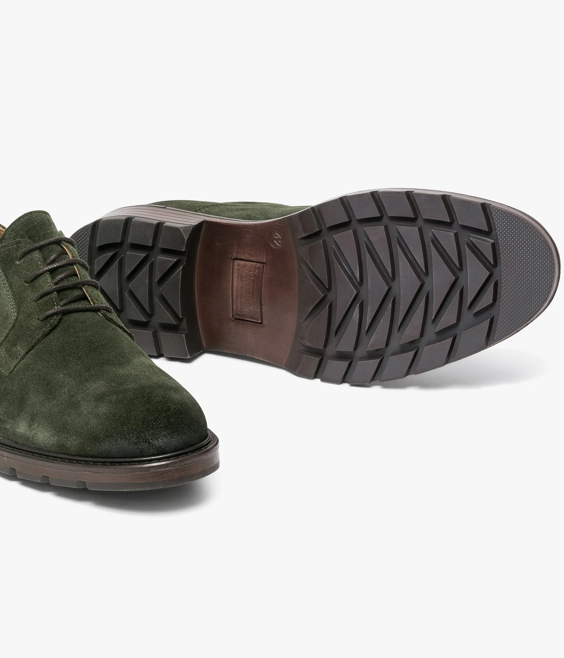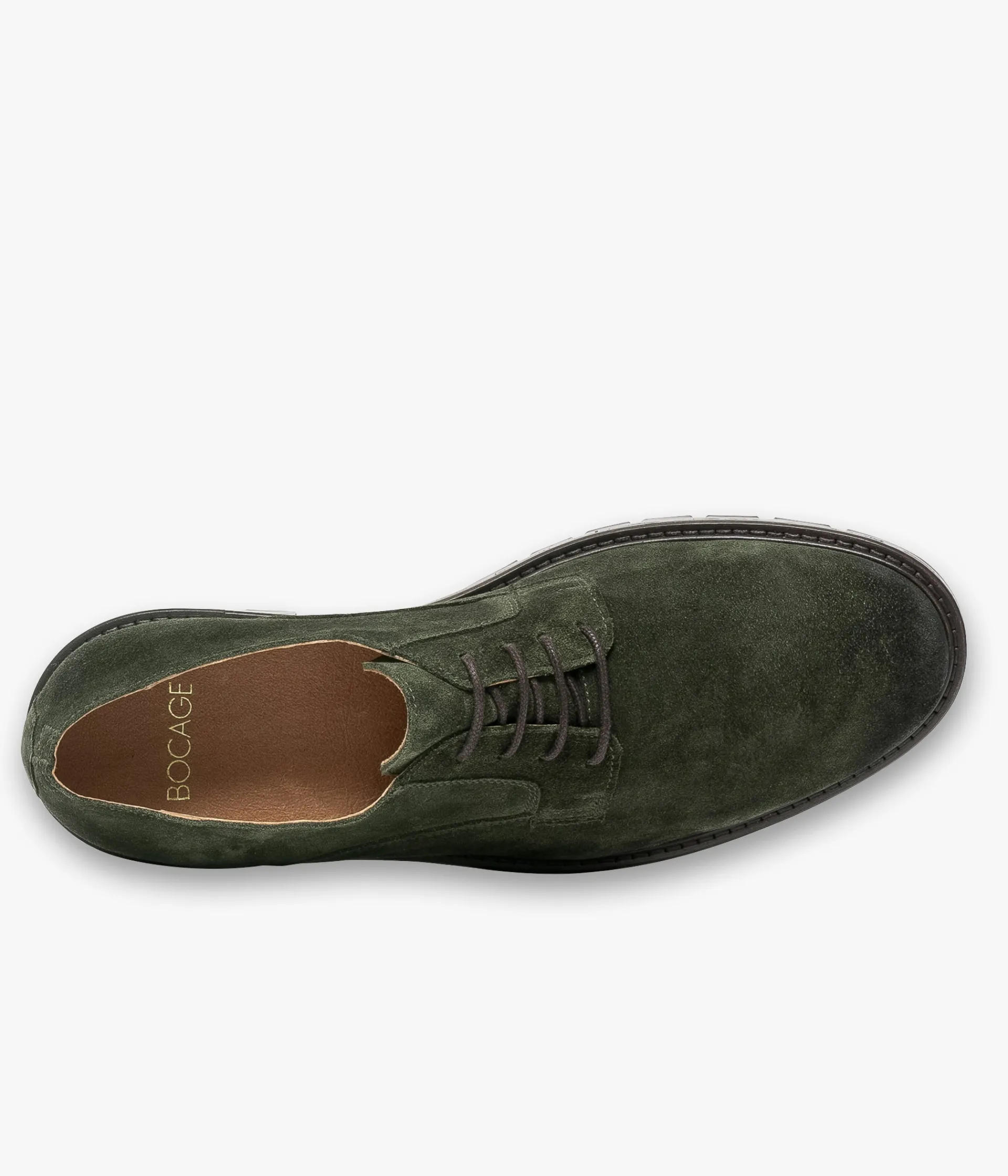 Un derby en cuir velours kaki fabriqué avec soin dans notre propre atelier au Portugal. Posé sur une semelle souple avec couche d’usure crantée, il affiche un look urbain et accompagne les tenues décontractées avec style. Un derby entièrement doublé cuir avec semelle intérieure cuir dotée d’une fine mousse. Il se ferme grâce à de lacets ronds marron, assortis à la semelle.